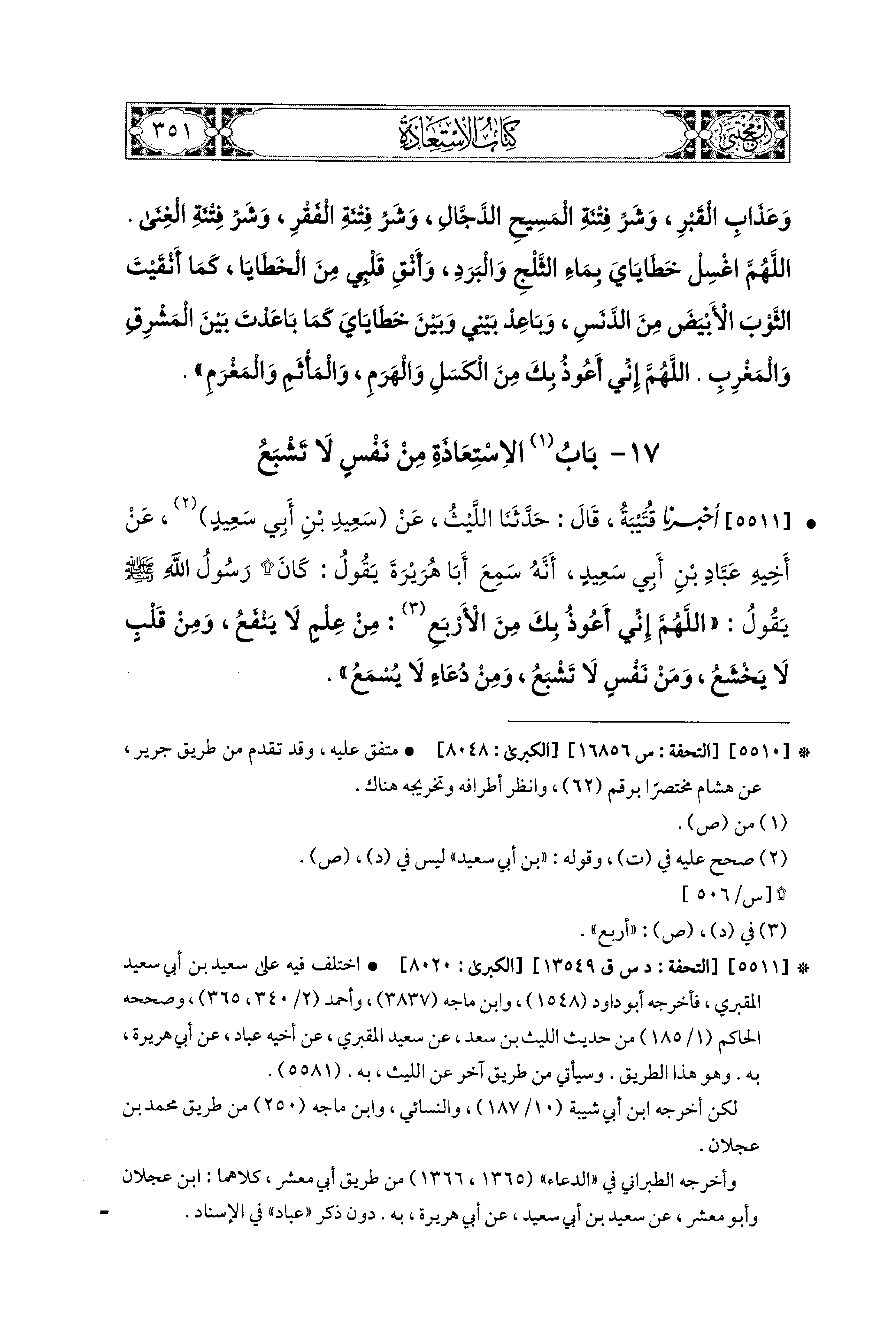 5511- أَخبَرَنا قُتَيبَةُ، قال: حَدَّثنا اللَّيْثُ، عَن سَعيدِ بْنِ أَبي سَعيدٍ، عَن أَخِيهِ عَبَّادِ بْنِ أَبي سَعيدٍ، أَنَّهُ سَمِعَ أَبَا هُرَيْرَةَ يَقُولُ: كَانَ رَسُولُ اللهِ صَلى الله عَليه وسَلم يَقُولُ: اللهُمَّ إِنِّي أَعُوذُ بِكَ مِنَ الأَرْبَعِ: مِنْ عِلْمٍ لاَ يَنْفَعُ، وَمِنْ قَلْبٍ لاَ يَخْشَعُ، وَمِنْ نَفْسٍ لاَ تَشْبَعُ، وَمِنْ دُعَاءٍ لاَ يُسْمَعُ.