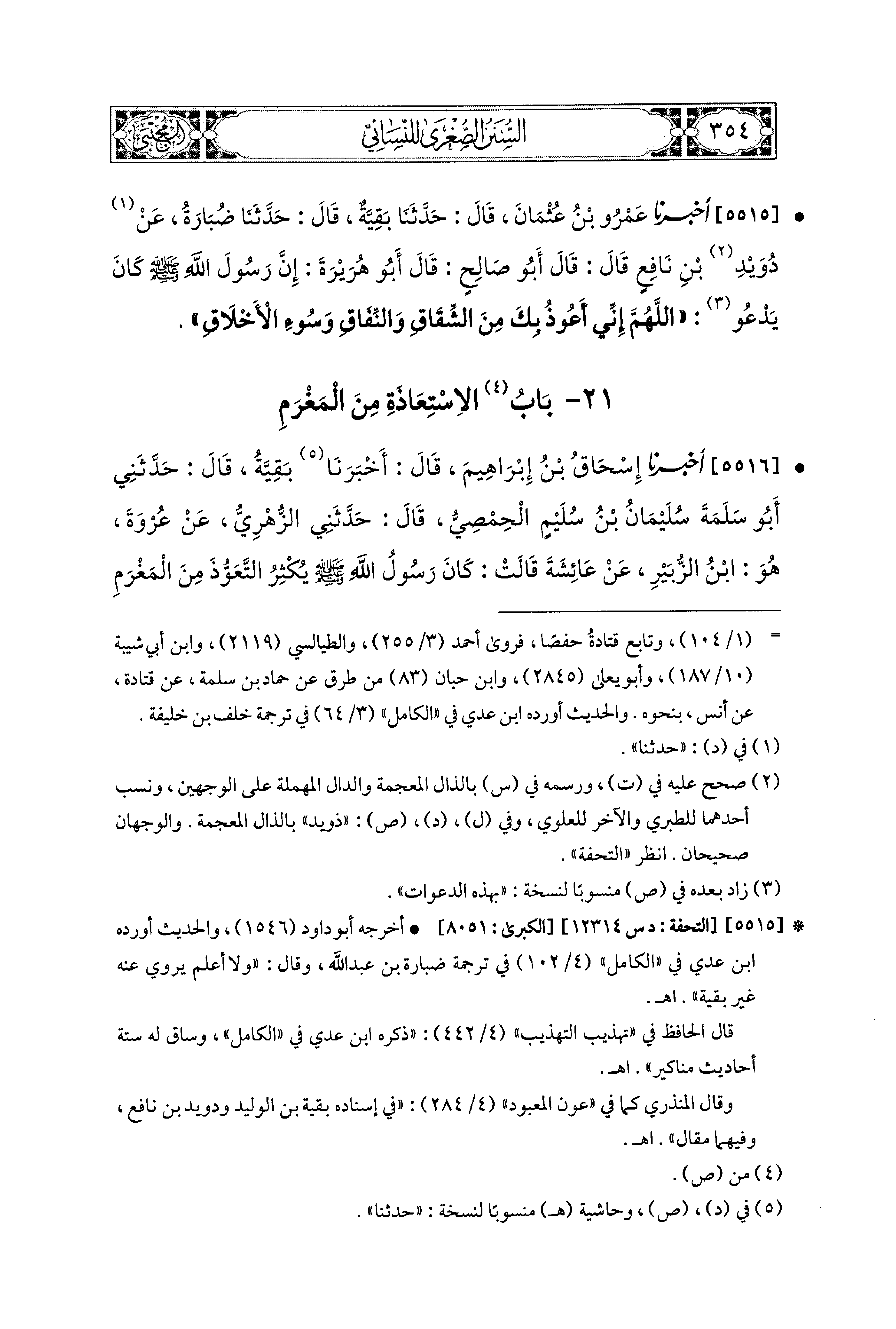 5515- أَخبَرَنا عَمْرُو بنُ عُثْمَانَ، قال: حَدَّثنا بَقِيَّةُ، قال: حَدَّثنا ضُبَارَةُ، عَن دُوَيْدِ بْنِ نَافِعٍ، قَالَ: قَالَ أَبو صَالِحٍ: قَالَ أَبو هُرَيْرَةَ؛ إِنَّ رَسُولَ اللهِ صَلى الله عَليه وسَلم كَانَ يَدْعُو: اللهُمَّ إِنِّي أَعُوذُ بِكَ مِنَ الشِّقَاقِ، وَالنِّفَاقِ، وَسُوءِ الأَخْلاَقِ.