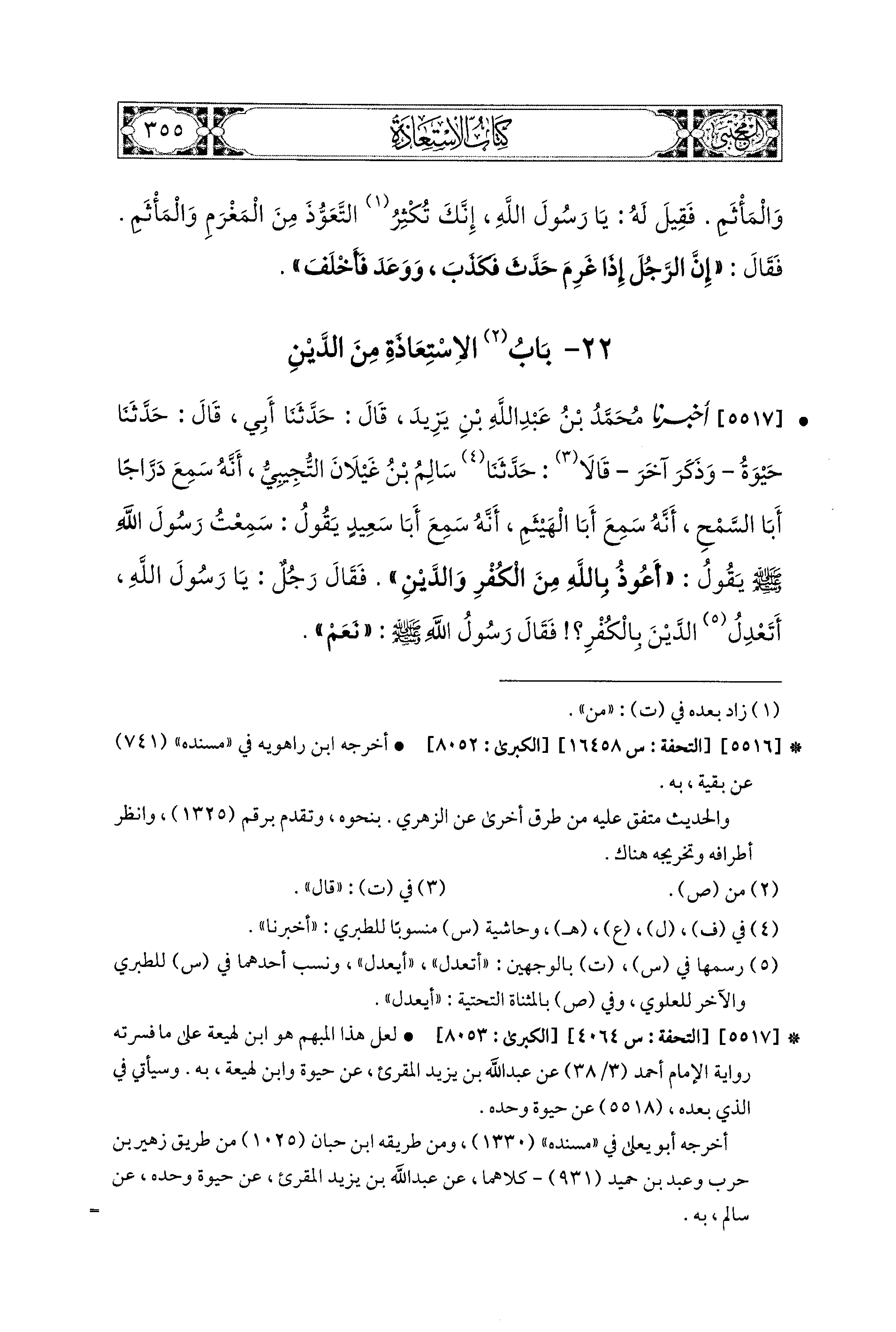 5517- أَخبَرَنا مُحَمد بنُ عَبدِ اللهِ بْنِ يَزِيدَ، قال: حَدَّثنا أَبي، قال: حَدَّثنا حَيْوَةُ، وَذَكَرَ آخَرَ، قالا: حَدَّثنا سَالِمُ بنُ غَيْلاَنَ التُّجِيبِيُّ، أَنَّهُ سَمِعَ دَرَّاجًا أَبَا السَّمْحِ، أَنَّهُ سَمِعَ أَبَا الهَيْثَمِ، أَنَّهُ سَمِعَ أَبَا سَعيدٍ يَقُولُ: سَمِعْتُ رَسُولَ اللهِ صَلى الله عَليه وسَلم يَقُولُ: أَعُوذُ بِاللَّهِ مِنَ الكُفْرِ، وَالدَّيْنِ، فَقَالَ رَجُلٌ: يَا رَسُولَ اللهِ، أَتَعْدِلُ الدَّيْنَ بِالكُفْرِ؟ فَقَالَ رَسُولُ اللهِ صَلى الله عَليه وسَلم: نَعَمْ.