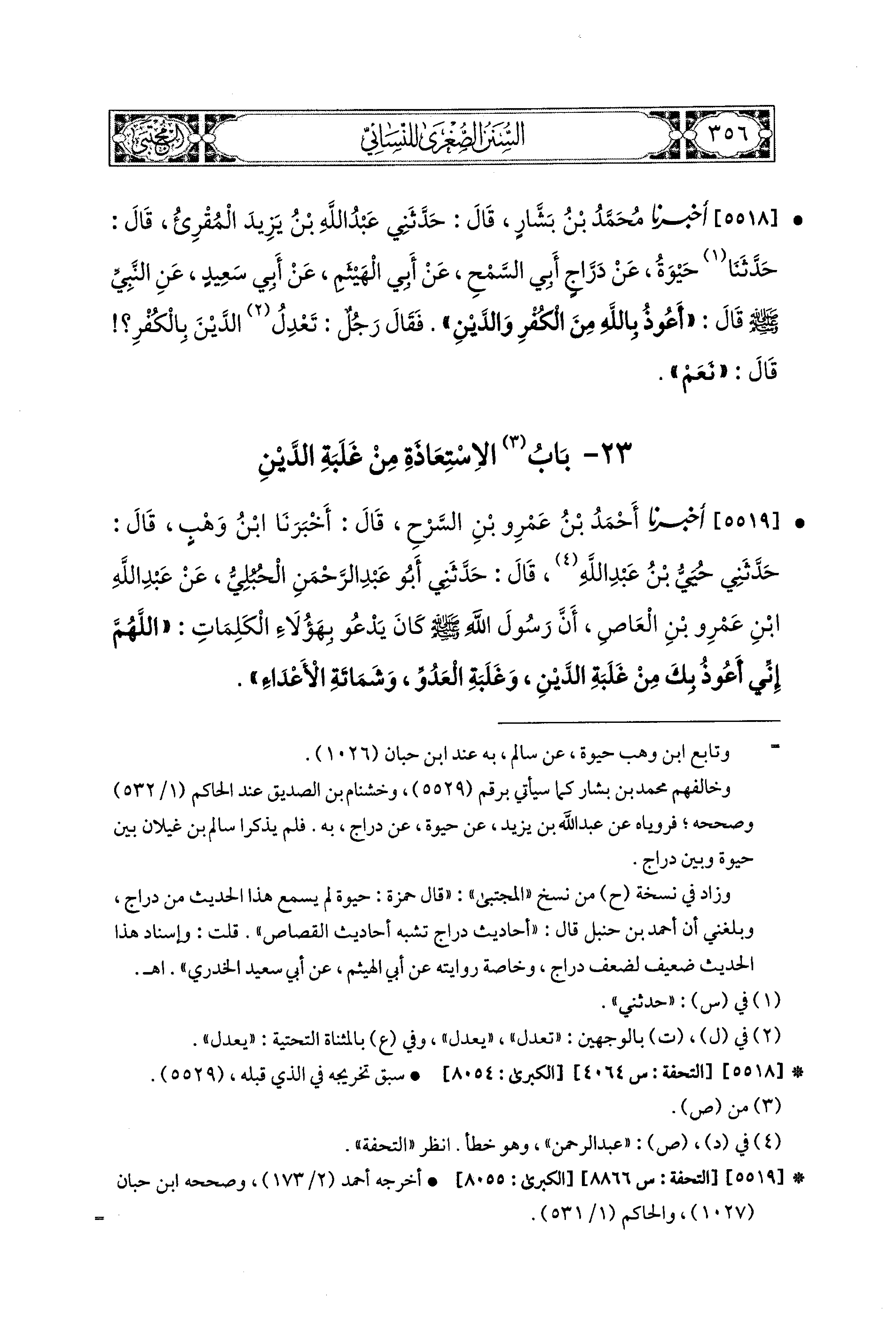 5518- أَخبَرَنا مُحَمد بنُ بَشَّارٍ، قَالَ: حَدَّثني عَبدُ اللهِ بنُ يَزِيدَ المُقْرِئ، قال: حَدَّثنا حَيْوَةُ، عَن دَرَّاجٍ أَبي السَّمْحِ، عَن أَبي الهَيْثَمِ، عَن أَبي سَعيدٍ، عَنِ النَّبيِّ صَلى الله عَليه وسَلم قَالَ: أَعُوذُ بِاللَّهِ مِنَ الكُفْرِ وَالدَّيْنِ، فَقَالَ رَجُلٌ: تَعْدِلُ الدَّيْنَ بِالكُفْرِ؟ قَالَ: نَعَمْ.