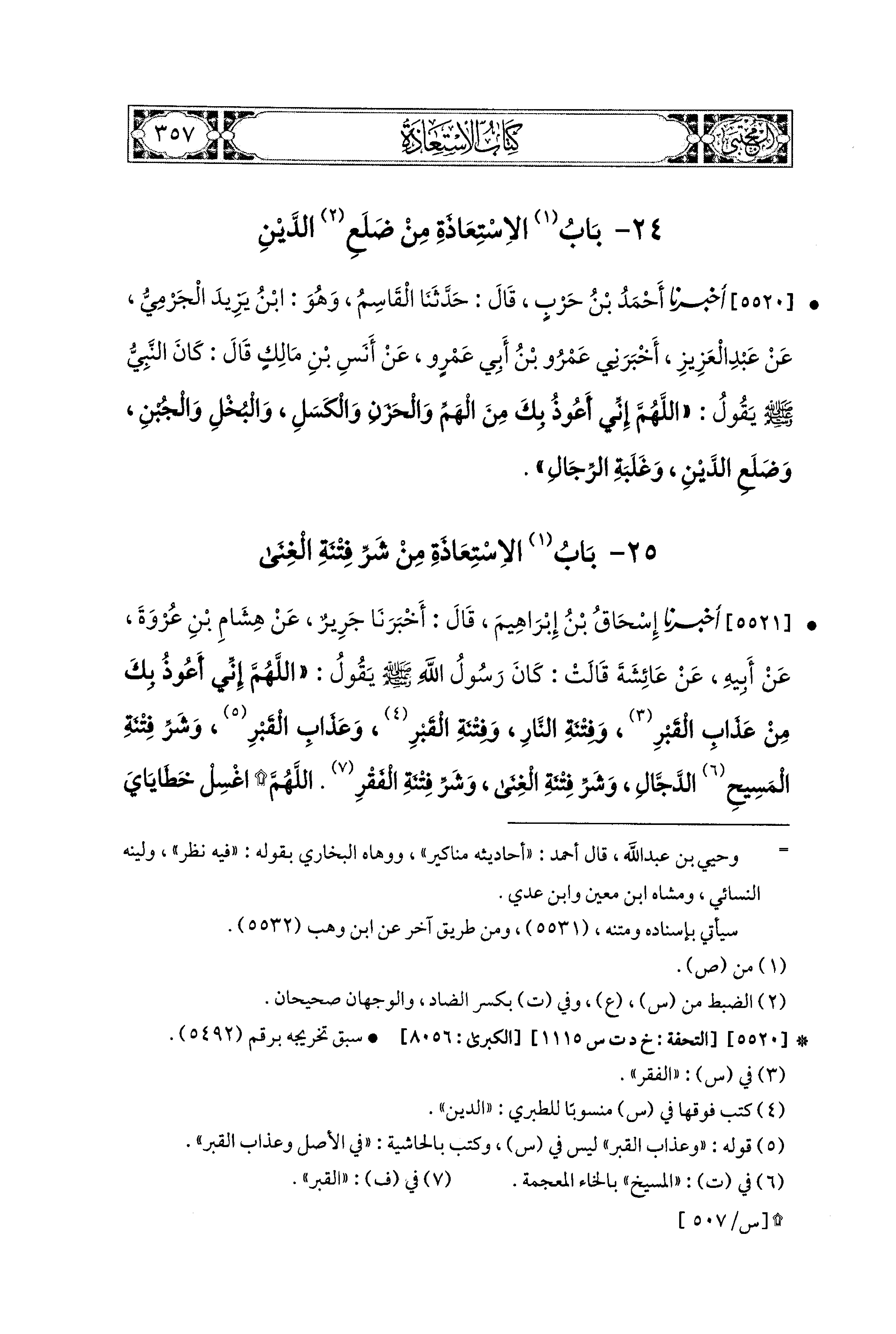 5520- أَخبَرَنا أَحْمَدُ بنُ حَرْبٍ، قال: حَدَّثنا القَاسِمُ، وَهُوَ ابنُ يَزِيدَ الجَرْمِيُّ، عَن عَبدِ العَزِيزِ، أَخْبَرَنِي عَمْرُو بنُ أَبي عَمْرٍو، عَن أَنَسِ بْنِ مَالِكٍ قَالَ: كَانَ النَّبيُّ صَلى الله عَليه وسَلم يَقُولُ: اللهُمَّ إِنِّي أَعُوذُ بِكَ مِنَ الهَمِّ وَالحَزَنِ وَالكَسَلِ، وَالبُخْلِ وَالجُبْنِ، وَضَلَعِ الدَّيْنِ، وَغَلَبَةِ الرِّجَالِ.