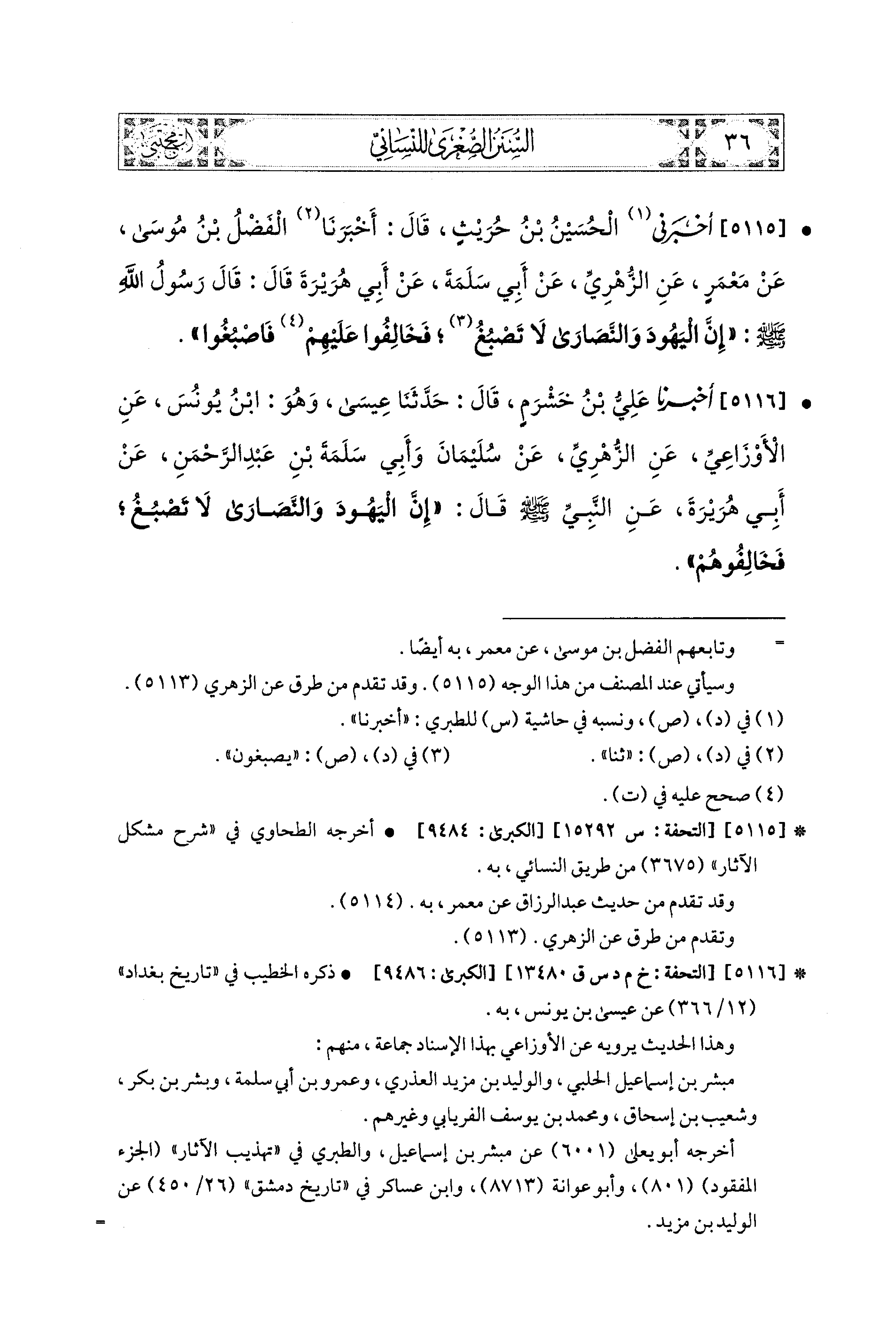 5116- أَخبَرَنا عَلِيُّ بنُ خَشْرَمٍ، قال: حَدَّثنا عِيسَى، وَهُوَ ابنُ يُونُسَ، عَنِ الأَوْزَاعِيِّ، عَنِ الزُّهْرِيِّ، عَن سُلَيمَانَ، وَأَبي سَلَمَةَ بْنِ عَبدِ الرَّحْمَنِ، عَن أَبي هُرَيْرَةَ، عَنِ النَّبيِّ صَلى الله عَليه وسَلم قَالَ: إِنَّ اليَهُودَ وَالنَّصَارَى لاَ تَصْبُغُ فَخَالِفُوهُمْ.