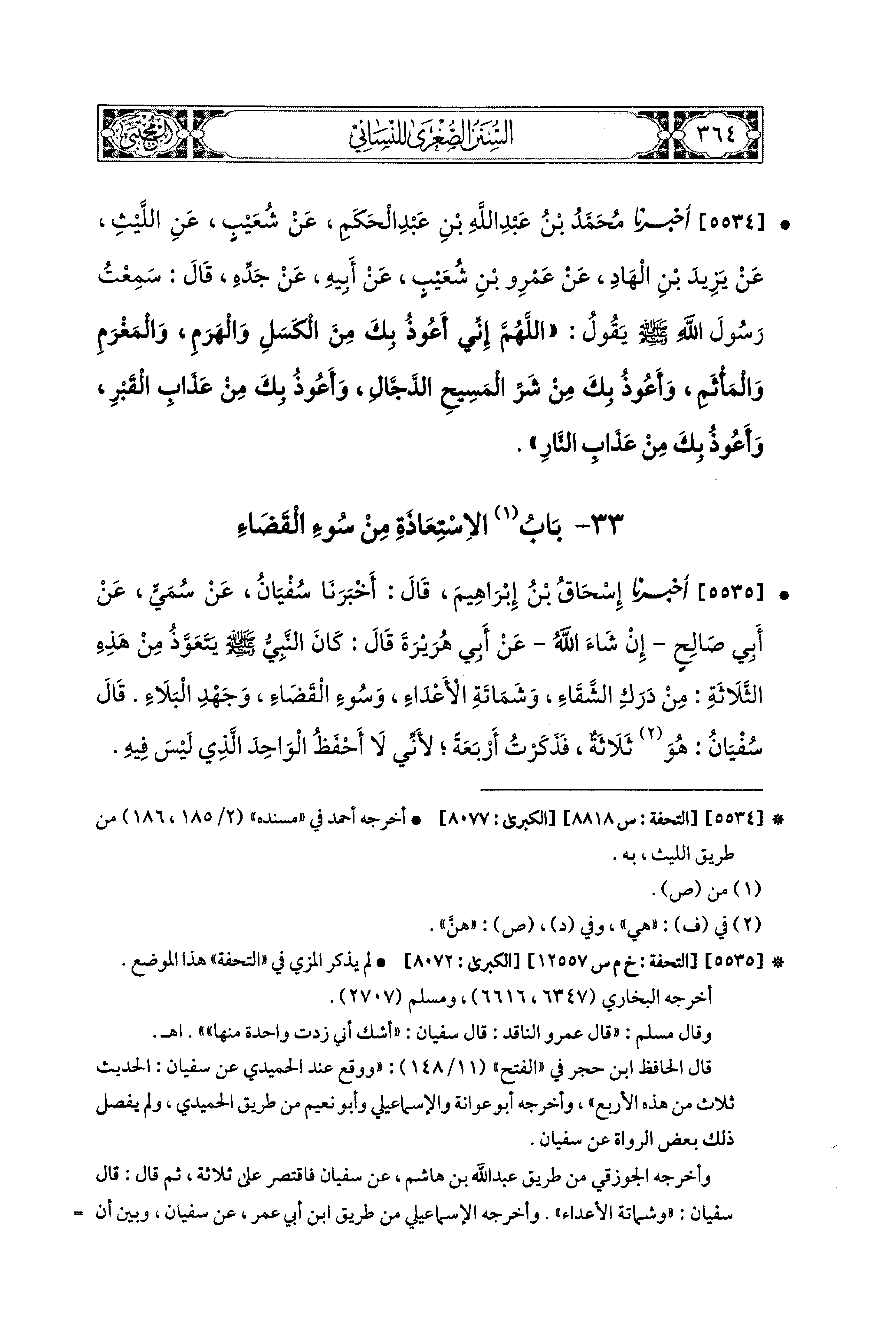 5535- أَخبَرَنا إِسحَاقُ بنُ إِبراهِيمَ، قَالَ: أَخبرنا سُفيَانُ، عَن سُمَيٍّ، عَن أَبي صَالِحٍ، إِنْ شَاءَ اللهُ، عَن أَبي هُرَيْرَةَ قَالَ: كَانَ النَّبيُّ صَلى الله عَليه وسَلم يَتَعَوَّذُ مِنْ هَذِهِ الثَّلاَثَةِ: مِنْ دَرَكِ الشَّقَاءِ، وَشَمَاتَةِ الأَعْدَاءِ، وَسُوءِ القَضَاءِ، وَجَهْدِ البَلاَءِ قَالَ سُفيَانُ: هُوَ ثَلاَثَةٌ فَذَكَرْتُ أَرْبَعَةً، لأَنِّي لاَ أَحْفَظُ الوَاحِدَ الَّذِي لَيْسَ فِيهِ.