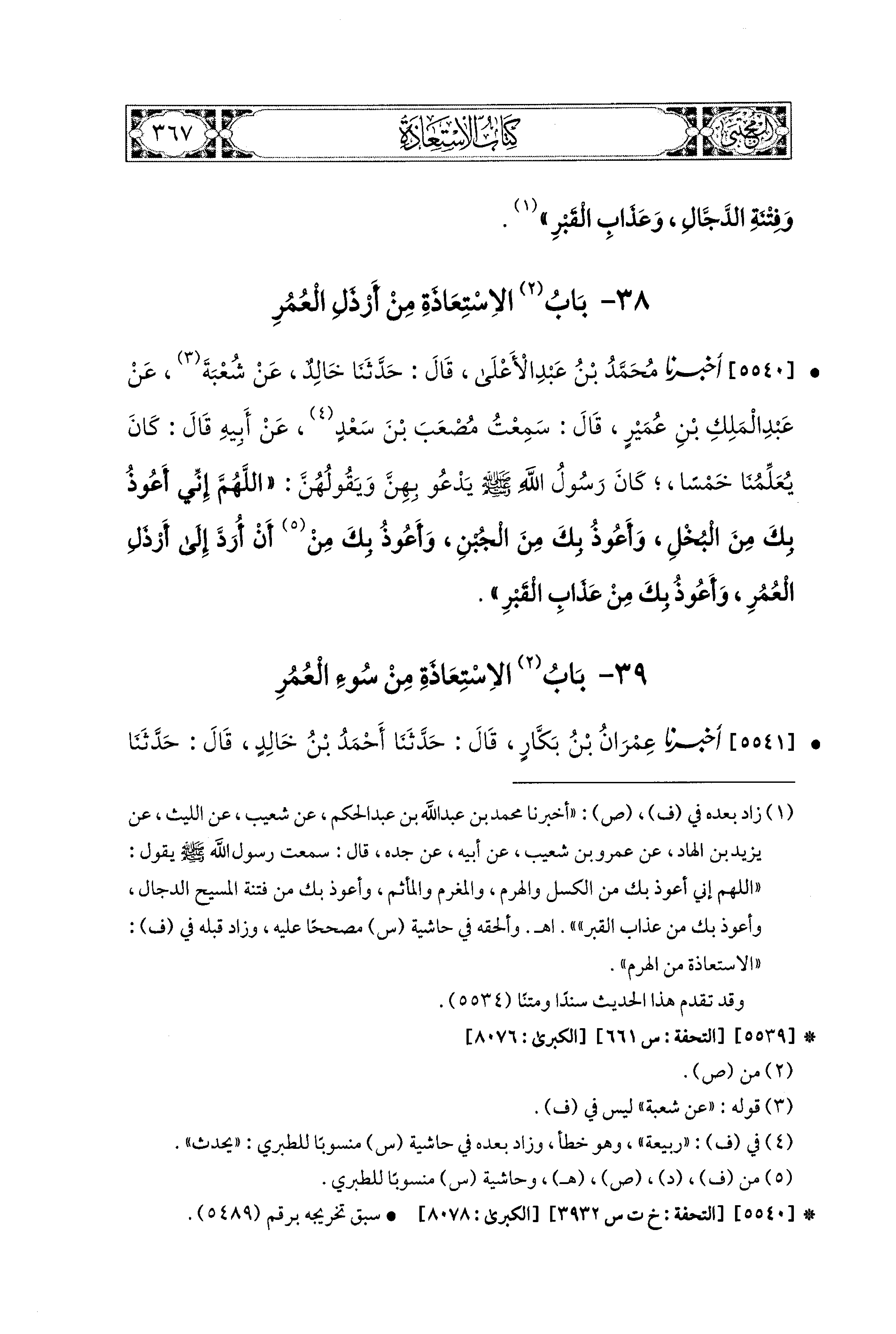 5540- أَخبَرَنا مُحَمد بن عَبدِ الأَعلَى، قال: حَدَّثنا خَالِدٌ، عَن شُعبَةَ، عَن عَبدِ المَلِكِ بْنِ عُمَيْرٍ، قَالَ: سَمِعْتُ مُصْعَبَ بْنَ سَعْدٍ، عَن أَبيهِ، قَالَ: كَانَ يُعَلِّمُنَا خَمْسًا كَانَ رَسُولُ اللهِ صَلى الله عَليه وسَلم يَدْعُو بِهِنَّ، وَيَقُولُهن: اللهُمَّ إِنِّي أَعُوذُ بِكَ مِنَ البُخْلِ، وَأَعُوذُ بِكَ مِنَ الجُبْنِ، وَأَعُوذُ بِكَ مِنْ أَنْ أُرَدَّ إِلَى أَرْذَلِ العُمُرِ، وَأَعُوذُ بِكَ مِنْ عَذَابِ القَبْرِ.