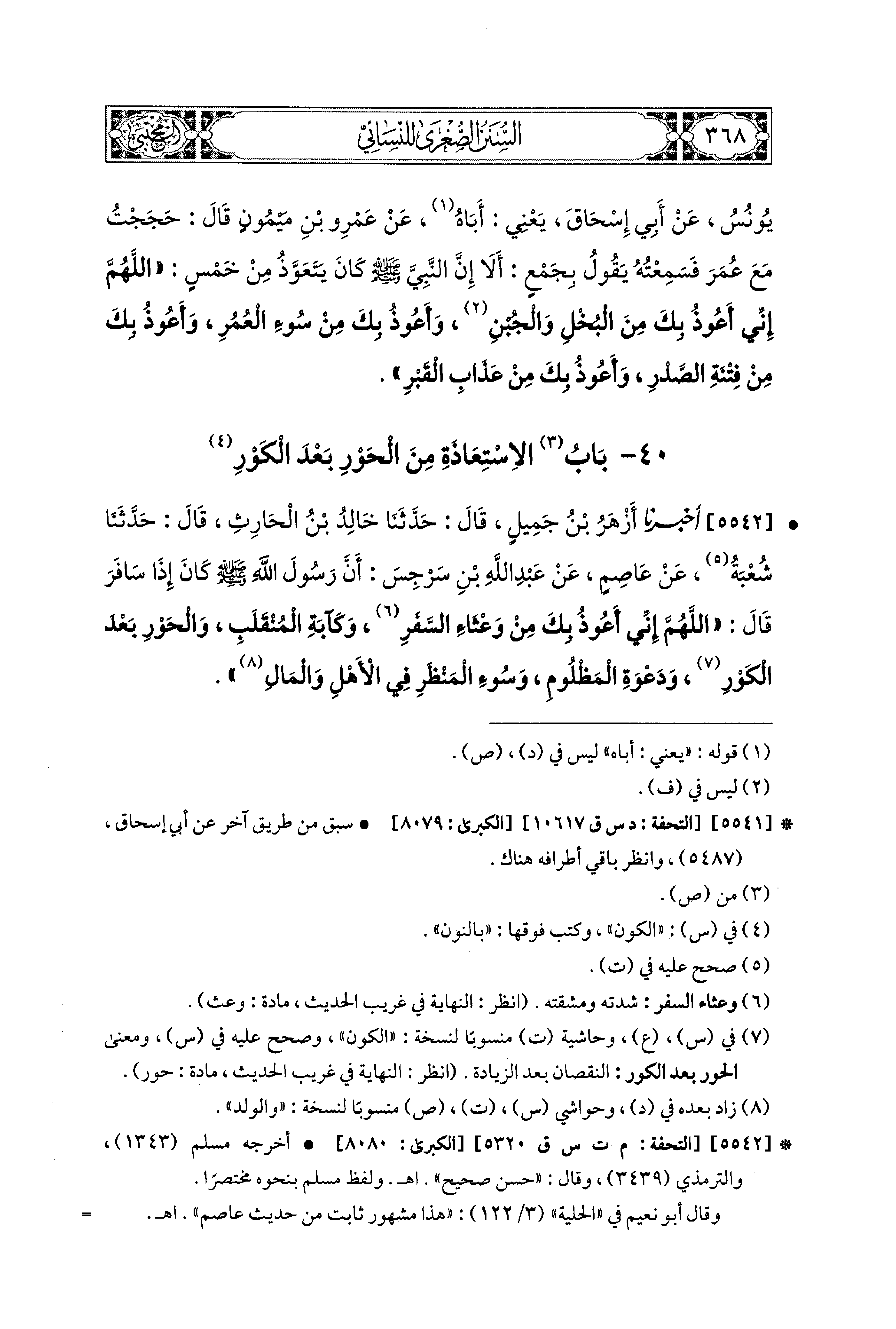5542- أَخبَرَنا أَزْهَرُ بنُ جَمِيلٍ، قال: حَدَّثنا خَالِدُ بنُ الحَارِثِ، قال: حَدَّثنا شُعبَةُ، عَن عَاصِمٍ، عَن عَبد اللهِ بن سَرْجِسَ، أَنَّ رَسُولَ اللهِ صَلى الله عَليه وسَلم كَانَ إِذَا سَافَرَ قَالَ: اللهُمَّ إِنِّي أَعُوذُ بِكَ مِنْ وَعْثَاءِ السَّفَرِ، وَكَآبَةِ المُنْقَلَبِ، وَالحَوْرِ بَعْدَ الكَوْرِ، وَدَعْوَةِ المَظْلُومِ، وَسُوءِ المَنْظَرِ فِي الأَهْلِ وَالمَالِ.