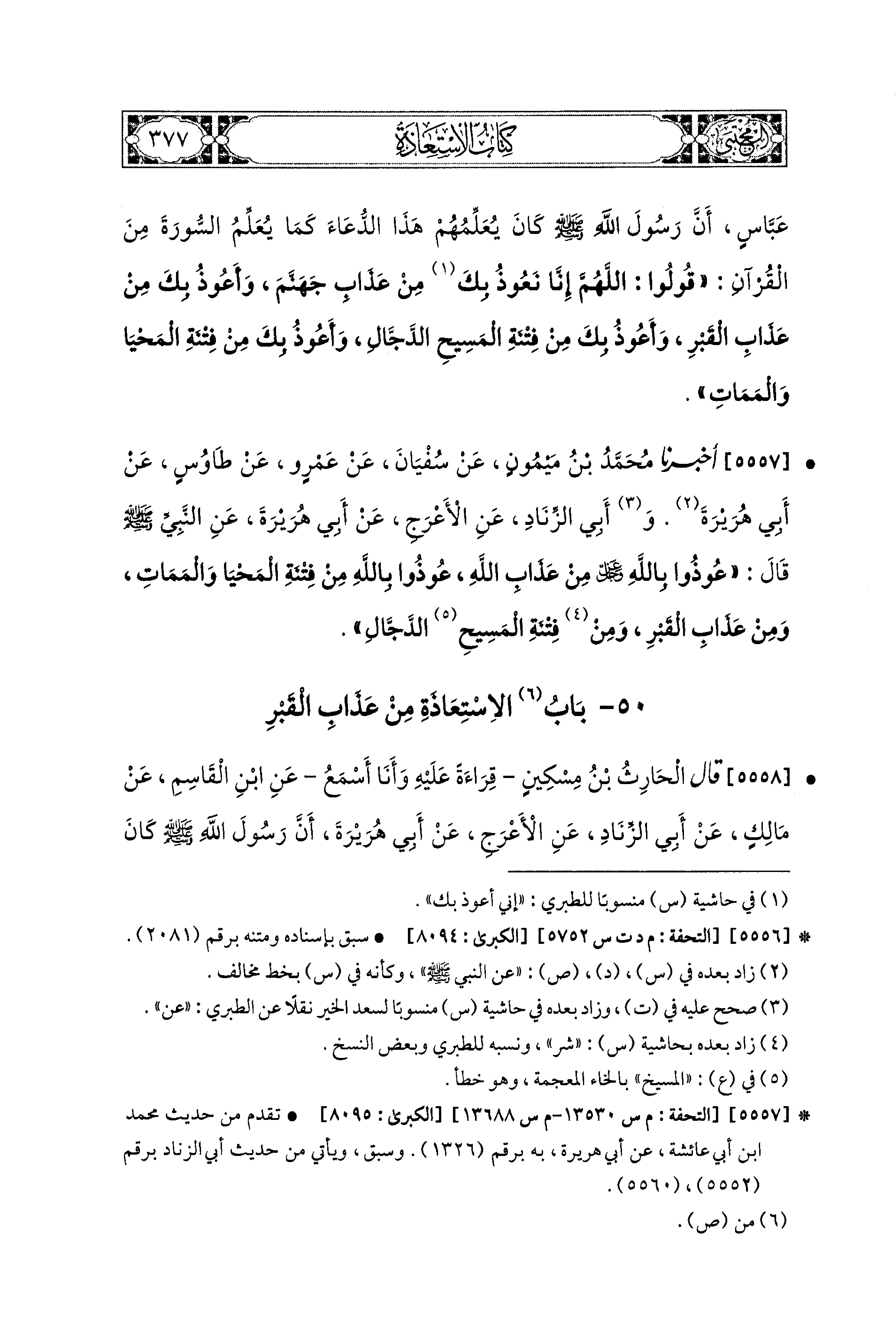 5558- قَالَ: الحَارِثُ بنُ مِسكينٍ، قِرَاءَةً عَلَيهِ وَأَنَا أَسْمَعُ، عَنِ ابنِ القَاسِمِ، عَن مَالِكٍ، عَن أَبي الزِّنَادِ، عَنِ الأَعْرَجِ، عَن أَبي هُرَيْرَةَ، أَنَّ رَسُولَ اللهِ صَلى الله عَليه وسَلم كَانَ يَدْعُو يَقُولُ: اللهُمَّ إِنِّي أَعُوذُ بِكَ مِنْ عَذَابِ جَهَنَّمَ، وَأَعُوذُ بِكَ مِنْ عَذَابِ القَبْرِ، وَأَعُوذُ بِكَ مِنْ فِتْنَةِ المَسِيحِ الدَّجَّالِ، وَأَعُوذُ بِكَ مِنْ فِتْنَةِ المَحْيَا وَالمَمَاتِ.