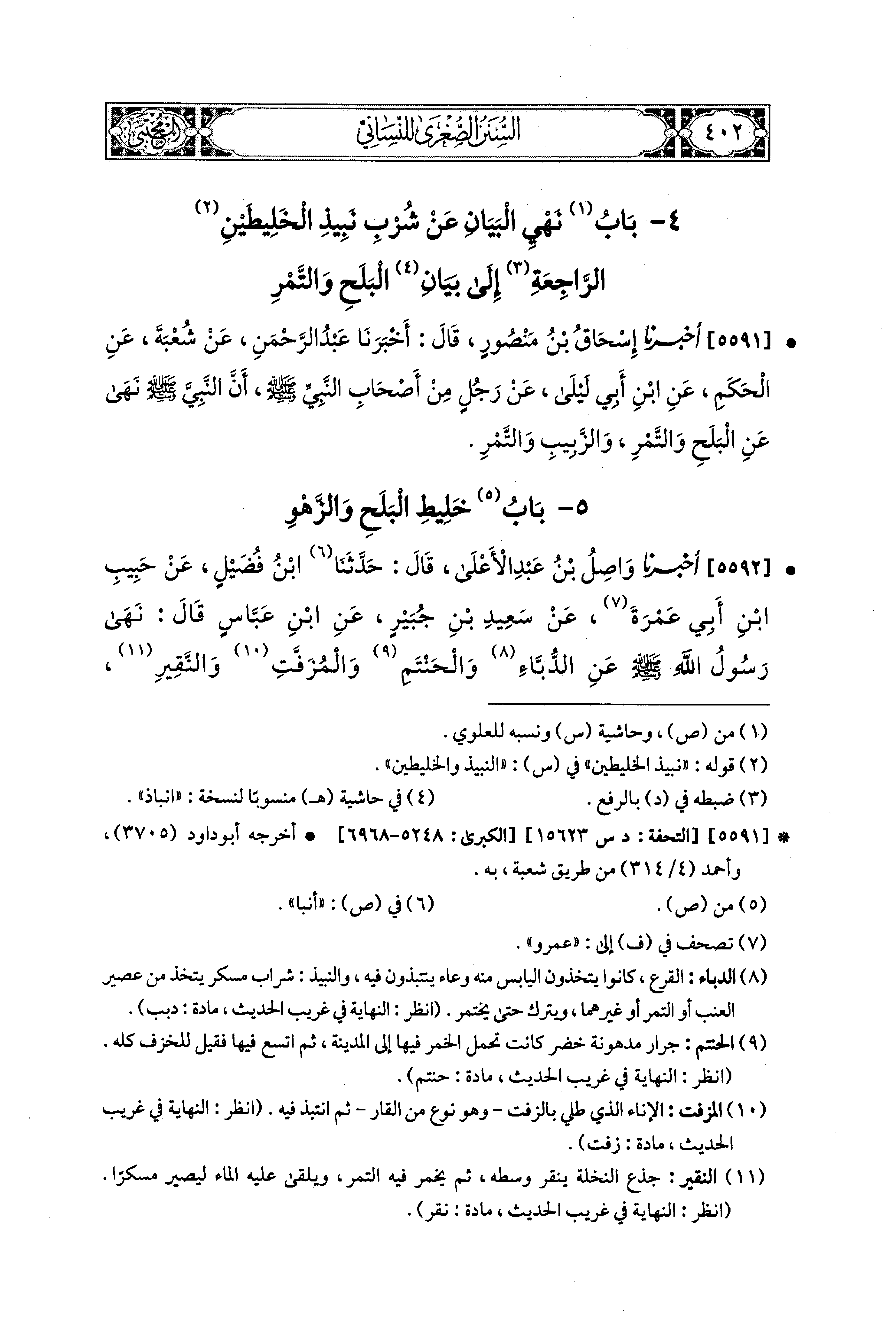 5592- أَخبَرَنا وَاصِلُ بن عَبدِ الأَعلَى، قال: حَدَّثنا ابنُ فُضَيْلٍ، عَن حَبِيبِ بْنِ أَبي عَمْرَةَ، عَن سَعيدِ بْنِ جُبَيْرٍ، عَنِ ابنِ عَبَّاسٍ، قَالَ: نَهَى رَسُولُ اللهِ صَلى الله عَليه وسَلم عَنِ الدُّبَّاءِ، وَالحَنْتَمِ، وَالمُزَفَّتِ، وَالنَّقِيرِ، وَأَنْ يُخْلَطَ البَلَحُ وَالزَّهْوُ.