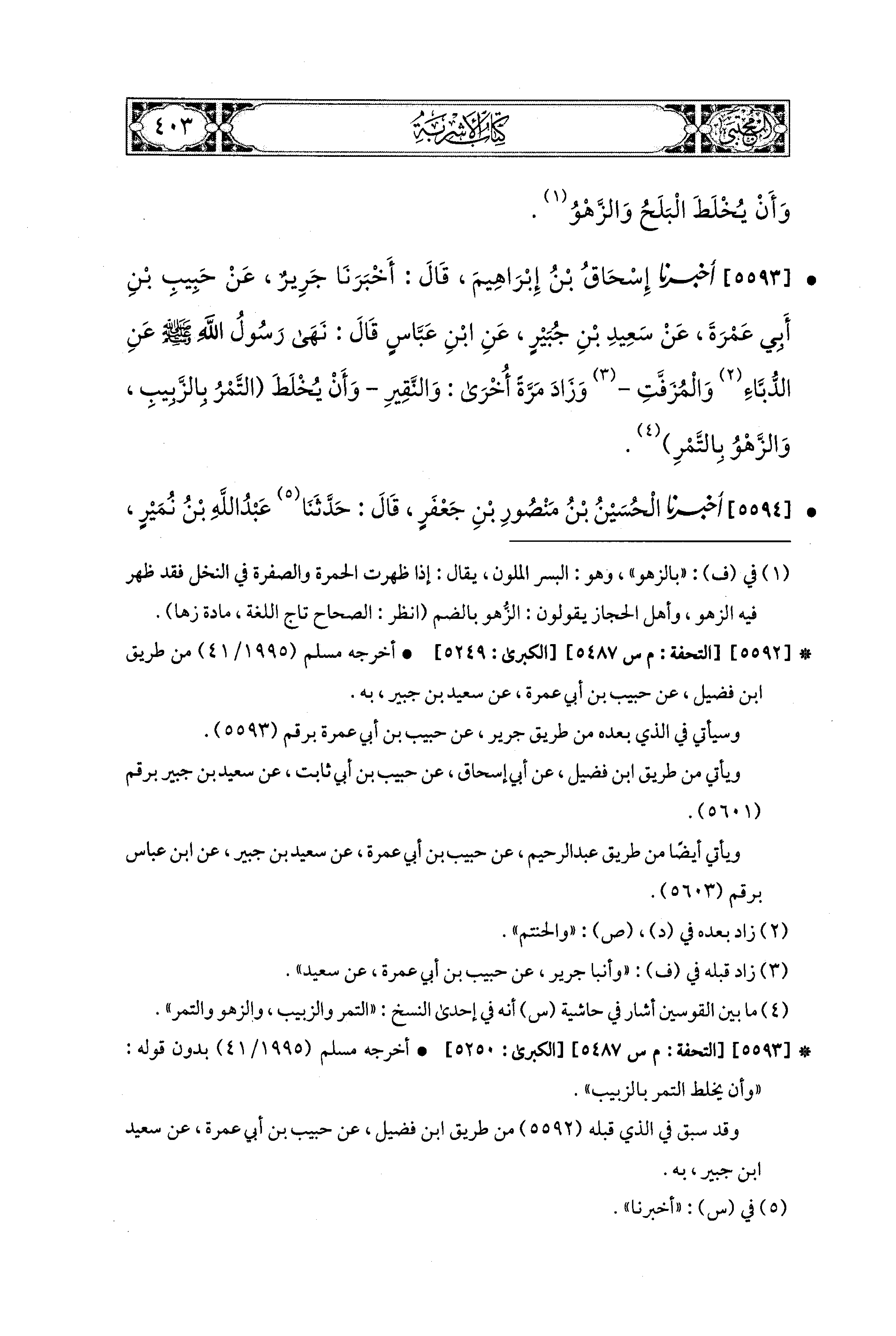 5593- أَخبَرَنا إِسحَاقُ بنُ إِبراهِيمَ، قَالَ: أَخبَرَنا جَرِيرٌ، عَن حَبِيبِ بْنِ أَبي عَمْرَةَ، عَن سَعيدِ بْنِ جُبَيْرٍ، عَنِ ابنِ عَبَّاسٍ، قَالَ: نَهَى رَسُولُ اللهِ صَلى الله عَليه وسَلم عَنِ الدُّبَّاءِ، وَالمُزَفَّتِ، وَزَادَ مَرَّةً أُخْرَى وَالنَّقِيرِ، وَأَنْ يُخْلَطَ التَّمْرُ بِالزَّبِيبِ، وَالزَّهْوُ بِالتَّمْرِ.