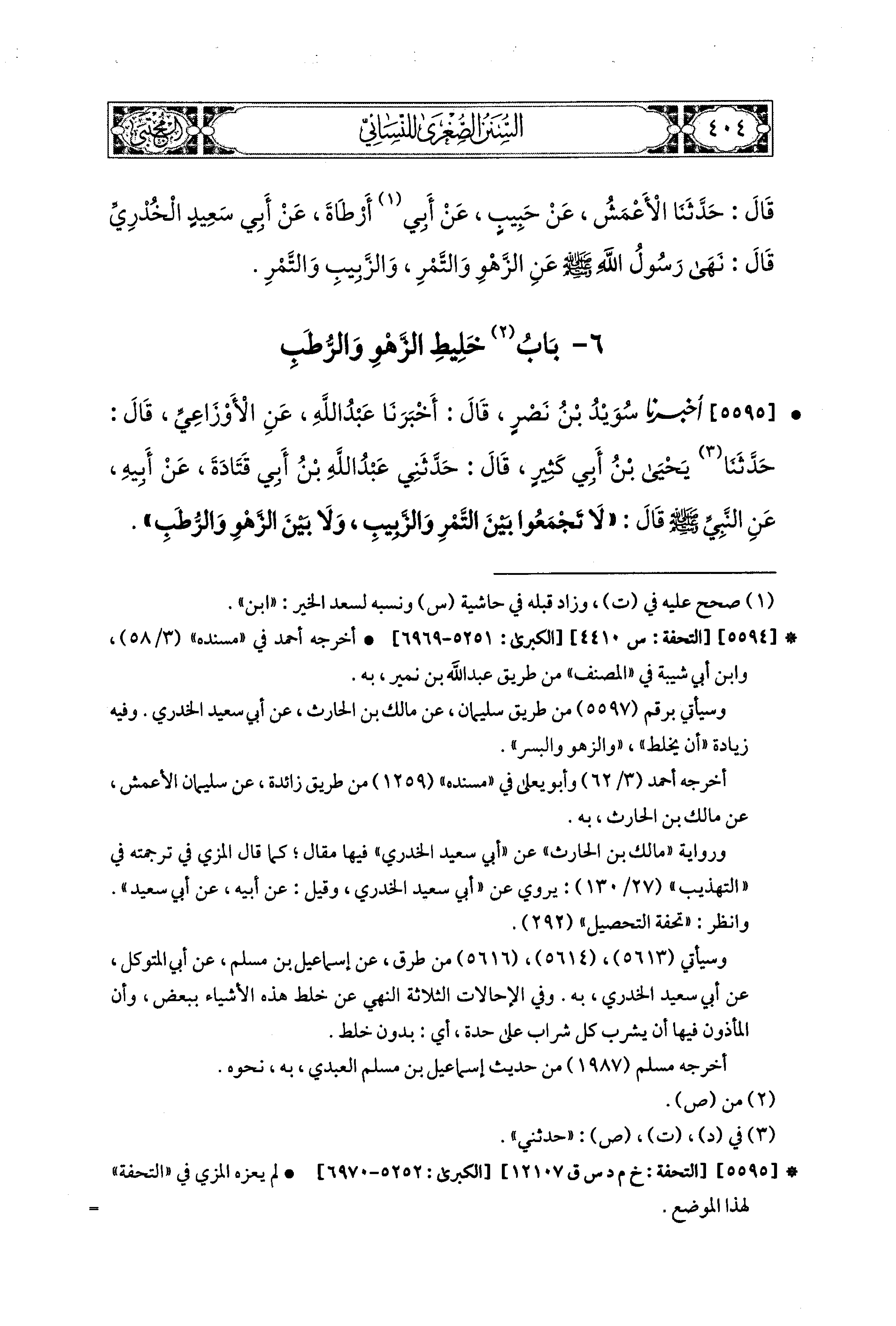 5595- أَخبَرَنا سُوَيْدُ بنُ نَصْرٍ، قَالَ: أَخبَرَنا عَبدُ اللهِ، عَنِ الأَوْزَاعِيِّ، قَالَ: حَدَّثَنا يَحيَى بنُ أَبي كَثِيرٍ، قَالَ: حَدَّثني عَبدُ اللهِ بنُ أَبي قَتَادَةَ، عَن أَبيهِ، عَنِ النَّبيِّ صَلى الله عَليه وسَلم قَالَ: لاَ تَجْمَعُوا بَيْنَ التَّمْرِ وَالزَّبِيبِ، وَلاَ بَيْنَ الزَّهْوِ وَالرُّطَبِ.