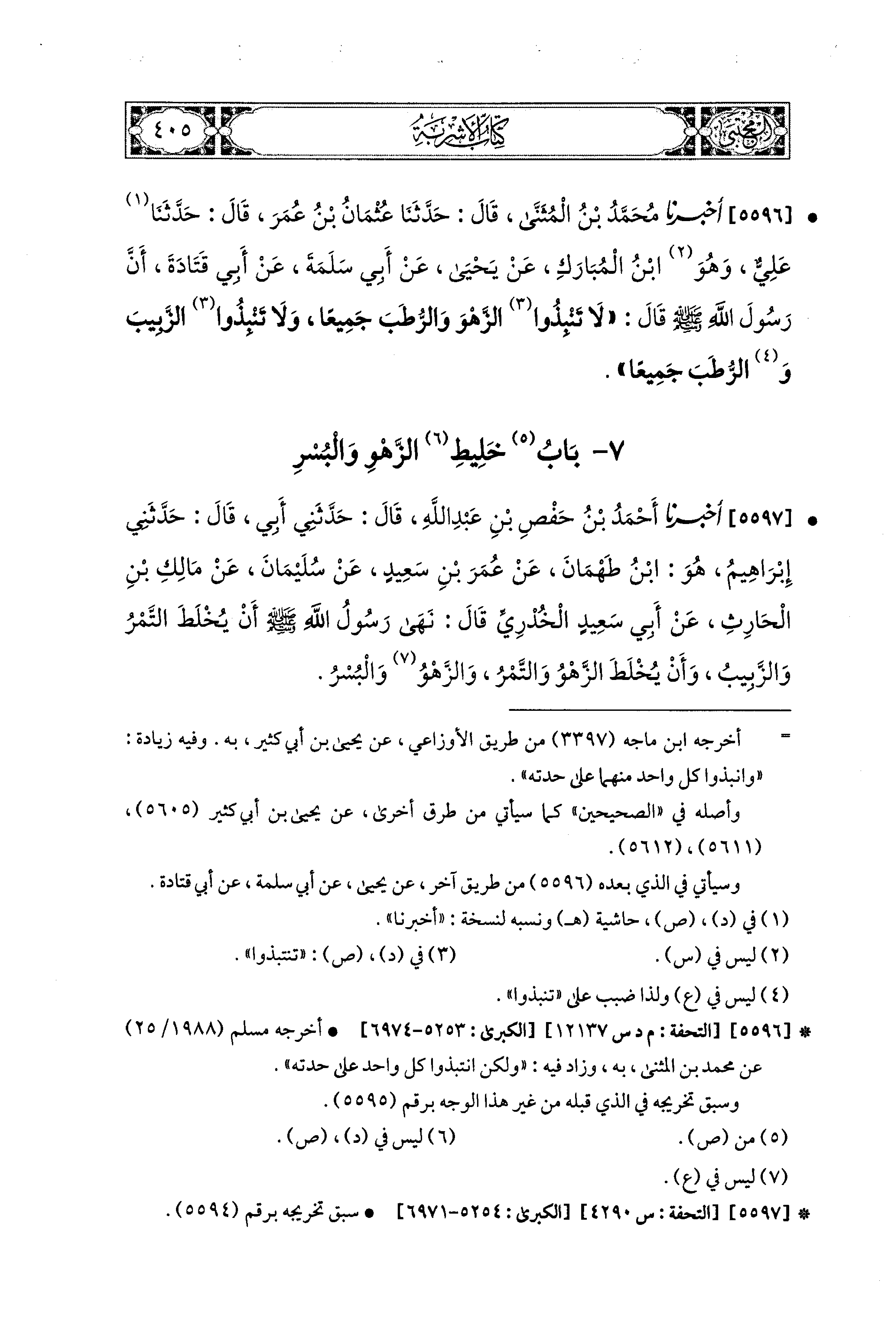 5596- أَخبَرَنا مُحَمد بنُ المُثَنَّى، قال: حَدَّثنا عُثْمَانُ بنُ عُمَرَ، قال: حَدَّثنا عَلِيٌّ، وَهُوَ ابنُ المُبَارَكِ، عَن يَحيَى، عَن أَبي سَلَمَةَ، عَن أَبي قَتَادَةَ، أَنَّ رَسُولَ اللهِ صَلى الله عَليه وسَلم قَالَ: لاَ تَنْبِذُوا الزَّهْوَ وَالرُّطَبَ جَمِيعًا، وَلاَ تَنْبِذُوا الزَّبِيبَ وَالرُّطَبَ جَمِيعًا.