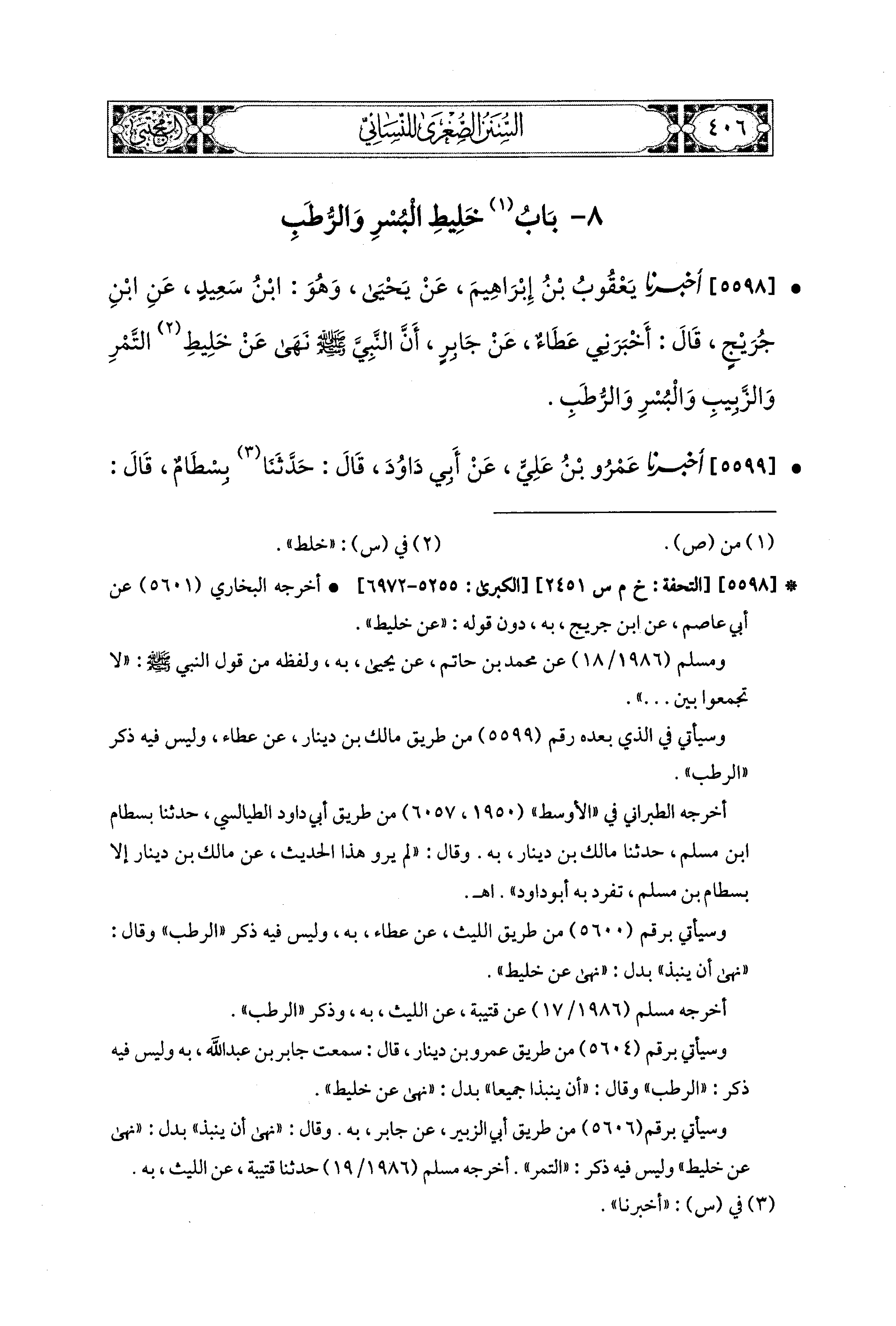 5599- أَخبَرَنا عَمْرُو بنُ عَلِيٍّ، عَن أَبي دَاوُدَ، قال: حَدَّثنا بِسْطَامٌ، قال: حَدَّثنا مَالِكُ بنُ دِينَارٍ، عَن عَطَاءٍ، عَن جَابِرٍ، أَنَّ رَسُولَ اللهِ صَلى الله عَليه وسَلم قَالَ: لاَ تَخْلِطُوا الزَّبِيبَ وَالتَّمْرَ، وَلاَ البُسْرَ وَالتَّمْرَ.