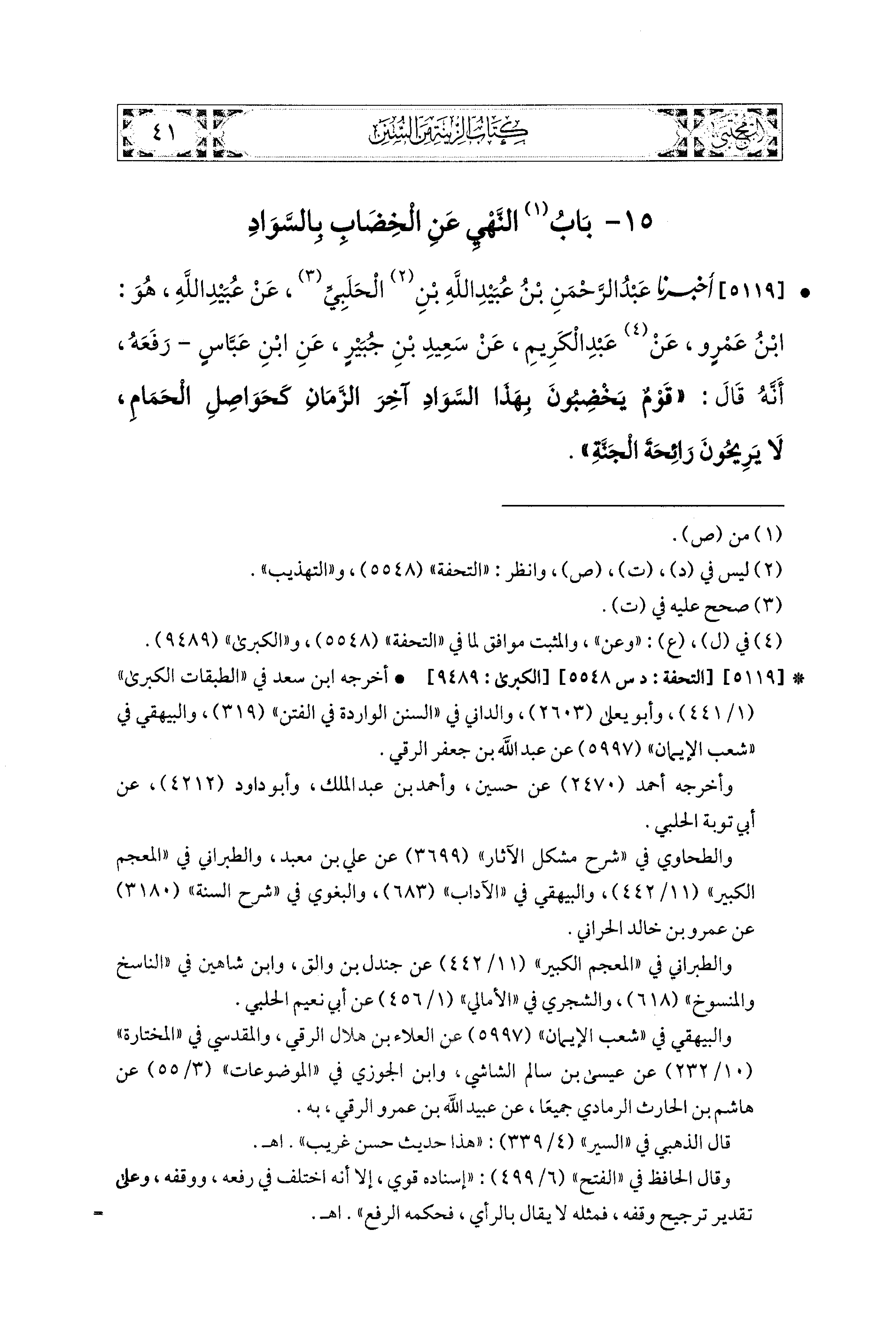 5119- أَخبَرَنا عَبدُ الرَّحْمَنِ بنُ عُبَيدِ اللهِ بْن الحَلَبِيُّ، عَن عُبَيدِ اللهِ، وَهُوَ ابنُ عَمْرٍو، عَن عَبدِ الكَرِيمِ، عَن سَعيدِ بْنِ جُبَيْرٍ، عَنِ ابنِ عَبَّاسٍ، رَفَعَهُ أَنَّهُ قَالَ: قَوْمٌ يَخْضِبُونَ بِهَذَا السَّوَادِ آخِرَ الزَّمَانِ كَحَوَاصِلِ الحَمَامِ، لاَ يَرِيحُونَ رَائِحَةَ الجَنَّةِ.