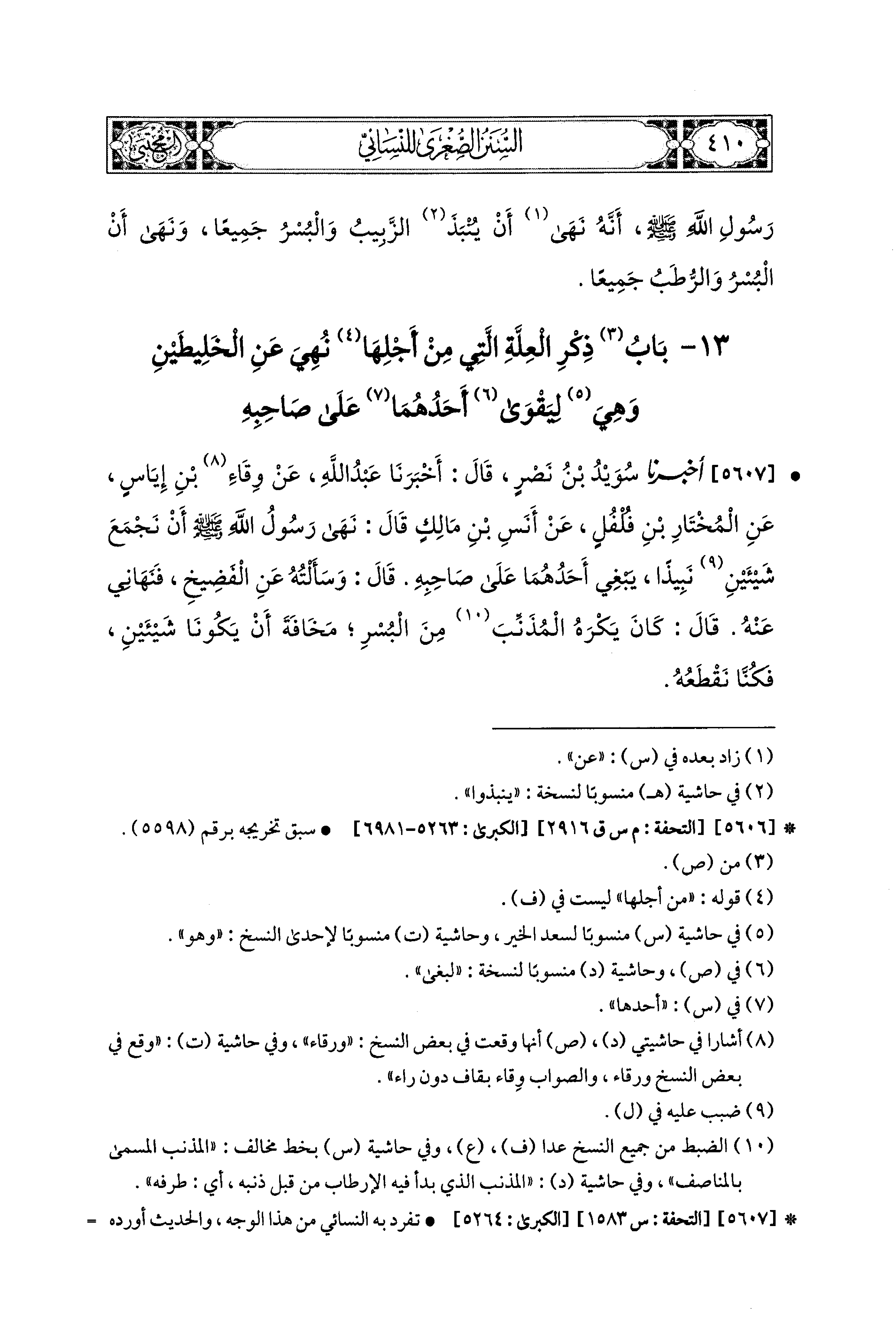 5607- أَخبَرَنا سُوَيْدُ بنُ نَصْرٍ، قَالَ: أَخبرنا عَبدُ اللهِ، عَن وِقَاءِ بْنِ إِيَاسٍ، عَنِ المُخْتَارِ بْنِ فُلْفُلٍ، عَن أَنَسِ بْنِ مَالِكٍ قَالَ: نَهَى رَسُولُ اللهِ صَلى الله عَليه وسَلم أَنْ نَجْمَعَ شَيْئَيْنِ نَبِيذًا يَبْغِي أَحَدُهُمَا عَلَى صَاحِبِهِ، قَالَ: وَسَأَلْتُهُ عَنِ الفَضِيخِ، فَنَهَانِي عَنهُ، قَالَ: كَانَ يَكْرَهُ المُذَنَّبَ مِنَ البُسْرِ مَخَافَةَ أَنْ يَكُونَا شَيْئَيْنِ، فَكُنَّا نَقْطَعُهُ.