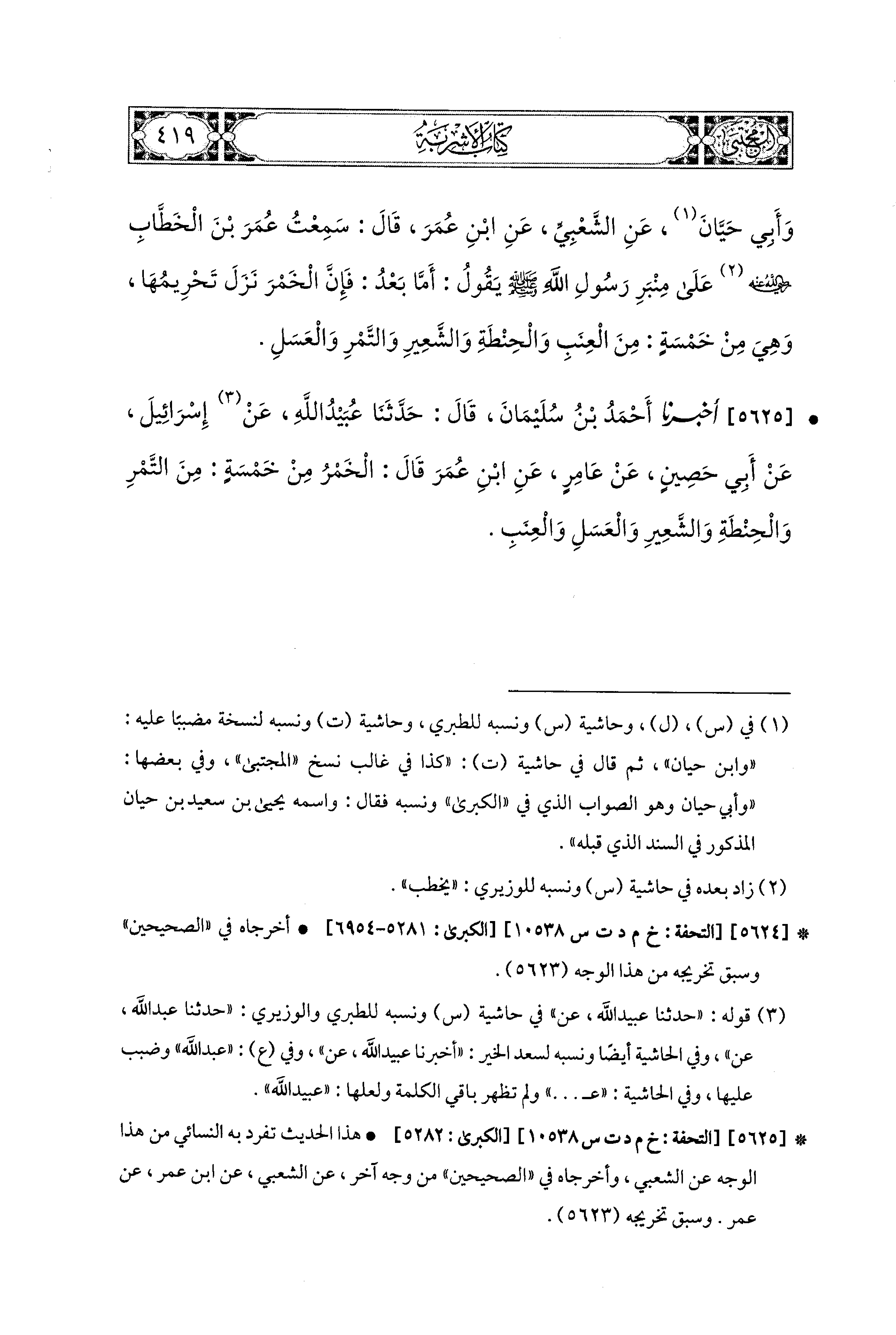 5625- أَخبَرَنا أَحْمَدُ بنُ سُلَيمَانَ، قال: حَدَّثنا عُبَيدُ اللهِ، عَن إِسْرَائِيلَ، عَن أَبي حَصِينٍ، عَن عَامِرٍ، عَنِ ابنِ عُمَرَ قَالَ: الخَمْرُ مِنْ خَمْسَةٍ: مِنَ التَّمْرِ، وَالحِنْطَةِ، وَالشَّعِيرِ، وَالعَسَلِ، وَالعِنَبِ.