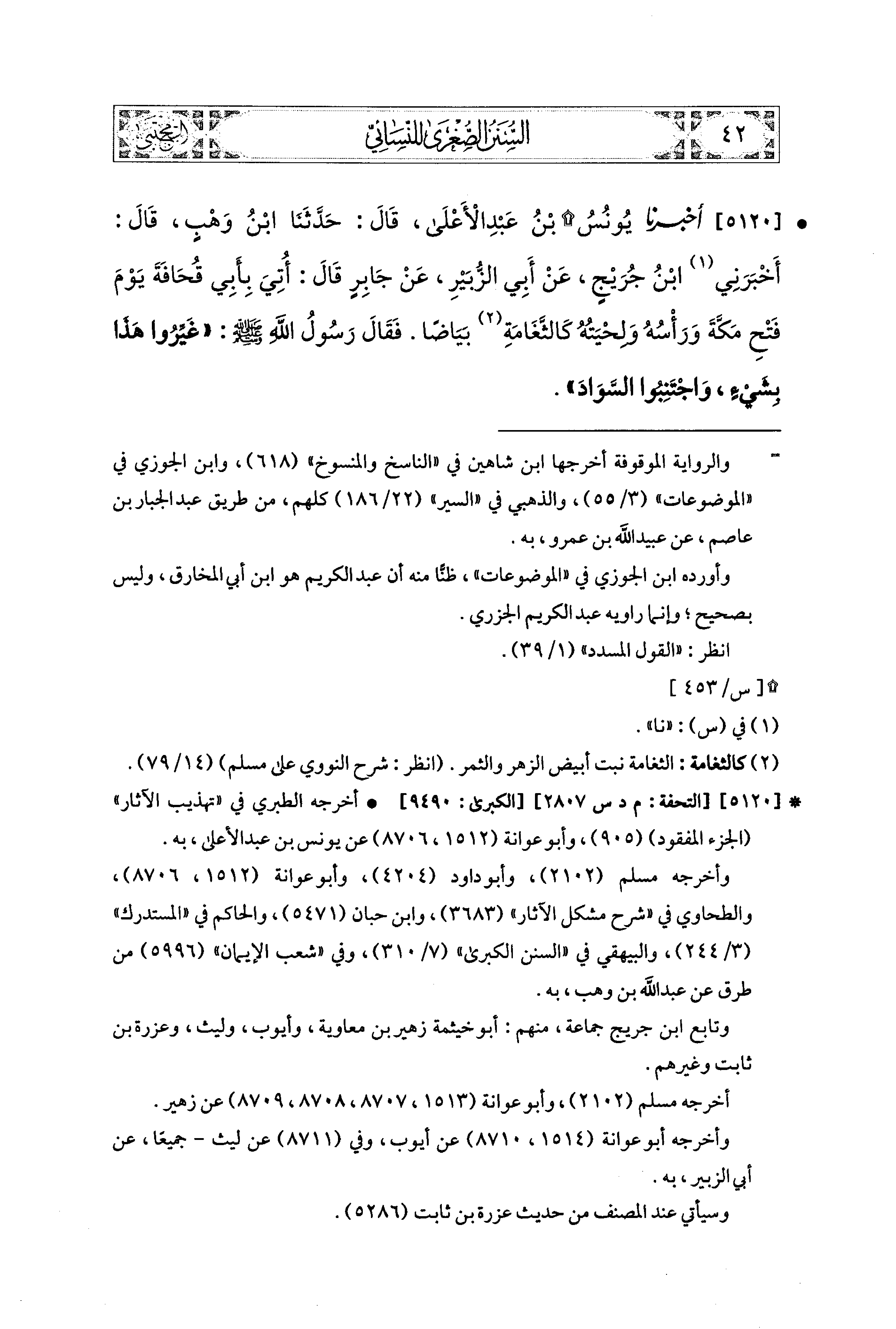 5120- أَخبَرَنا يُونُسُ بن عَبدِ الأَعلَى، قال: حَدَّثنا ابنُ وَهْبٍ، قَالَ: أَخْبَرَنِي ابنُ جُرَيْجٍ، عَن أَبي الزُّبَيْرِ، عَن جَابِرٍ قَالَ: أُتِيَ بِأَبي قُحَافَةَ يَوْمَ فَتْحِ مَكَّةَ وَرَأْسُهُ وَلِحْيَتُهُ كَالثَّغَامَةِ بَيَاضًا، فَقَالَ رَسُولُ اللهِ صَلى الله عَليه وسَلم: غَيِّرُوا هَذَا بِشَيْءٍ، وَاجْتَنِبُوا السَّوَادَ.
