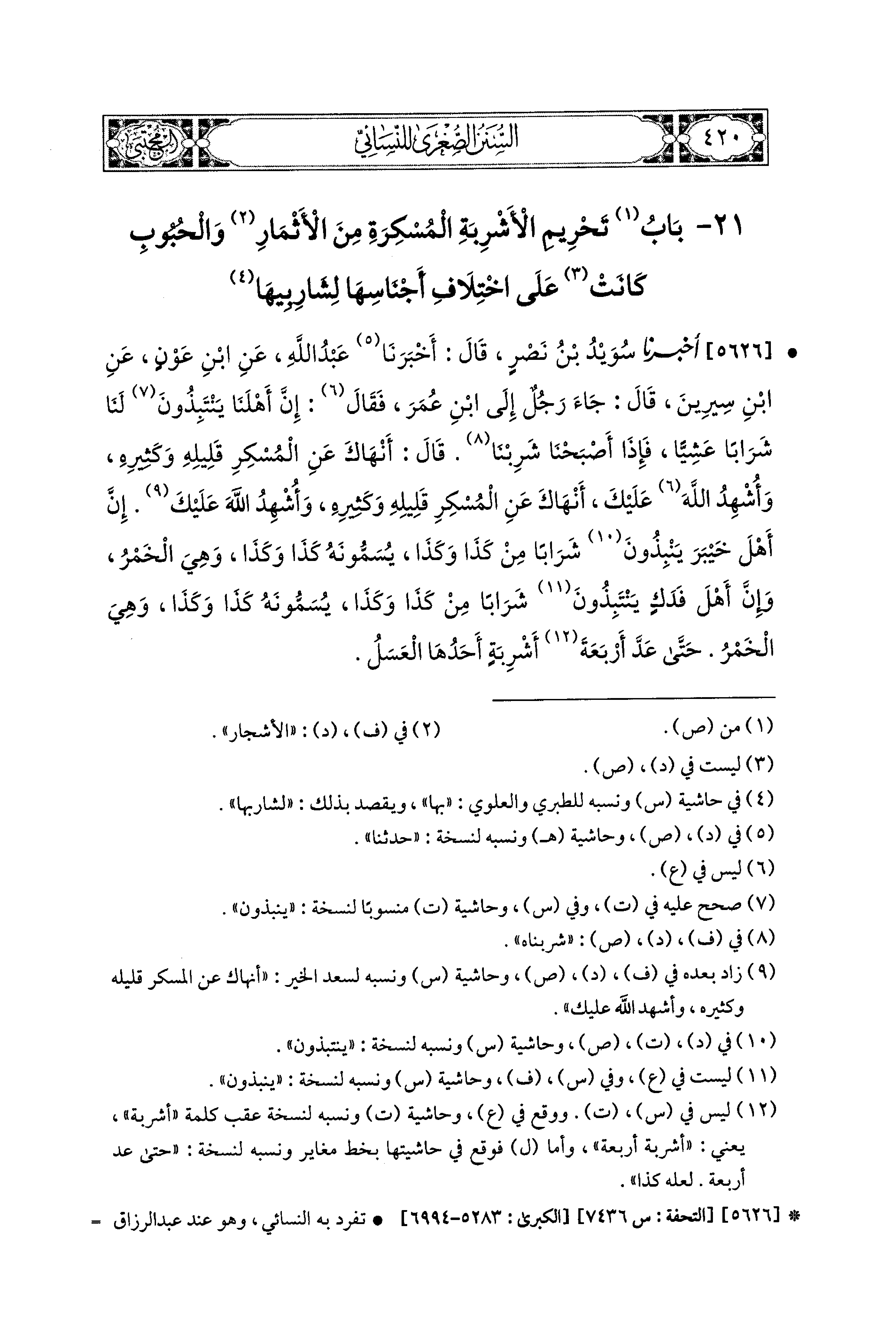 5626- أَخبَرَنا سُوَيْدُ بنُ نَصْرٍ، قال: أَخبَرَنا عَبدُ اللهِ، عَنِ ابنِ عَوْنٍ، عَنِ ابنِ سِيرِينَ، قَالَ: جَاءَ رَجُلٌ إِلَى ابنِ عُمَرَ فَقَالَ: إِنَّ أَهْلَنَا يَنْتبِذُونَ لَنَا شَرَابًا عَشِيًّا، فَإِذَا أَصْبَحْنَا شَرِبْنَا، قَالَ: أَنْهَاكَ عَنِ المُسْكِرِ قَلِيلِهِ وَكَثِيرِهِ، وَأُشْهِدُ اللهَ عَلَيْكَ، أَنْهَاكَ عَنِ المُسْكِرِ قَلِيلِهِ وَكَثِيرِهِ، وَأُشْهِدُ اللهَ عَلَيْكَ، إِنَّ أَهْلَ خَيْبَرَ يَنْبِذُونَ شَرَابًا مِنْ كَذَا وَكَذَا، يُسَمُّونَهُ كَذَا وَكَذَا، وَهِيَ الخَمْرُ، وَإِنَّ أَهْلَ فَدَكٍ يَنْتَبِذُونَ شَرَابًا مِنْ كَذَا وَكَذَا، يُسَمُّونَهُ كَذَا وَكَذَا، وَهِيَ الخَمْرُ حَتَّى عَدَّ أَشْرِبَةً أَرْبَعَةً أَحَدُهَا العَسَلُ.