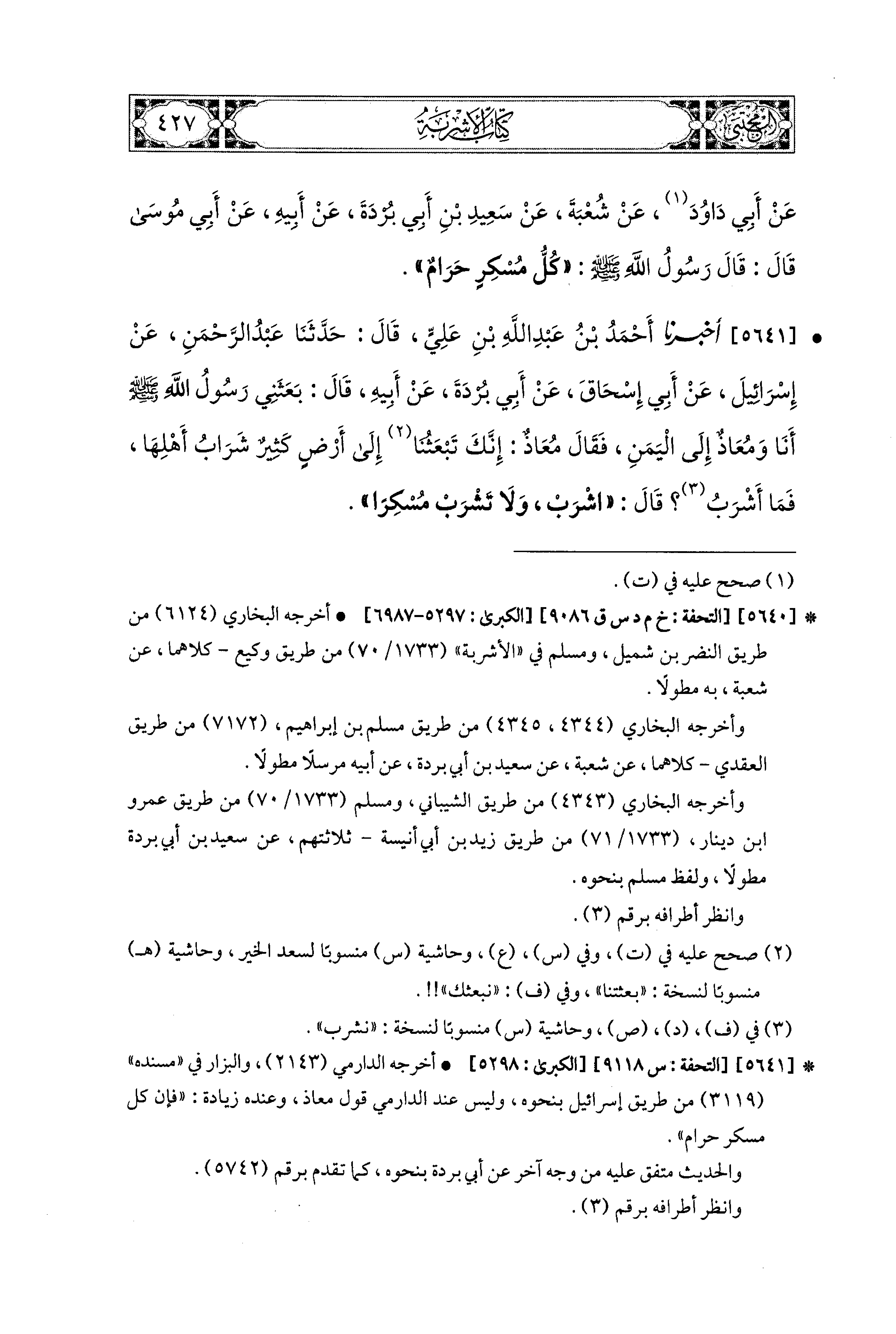 5641- أَخبَرَنا أَحْمَدُ بنُ عَبدِ اللهِ بْنِ عَلِيٍّ، قال: حَدَّثنا عَبدُ الرَّحْمَنِ، عَن إِسْرَائِيلَ، عَن أَبي إِسحَاقَ، عَن أَبي بُرْدَةَ، عَن أَبيهِ، قَالَ: بَعَثَنِي رَسُولُ اللهِ صَلى الله عَليه وسَلم أَنَا وَمُعَاذٌ إِلَى اليَمَنِ، فَقَالَ مُعَاذٌ: إِنَّكَ تَبْعَثُنَا إِلَى أَرْضٍ كَثِيرٌ شَرَابُ أَهْلِهَا، فَمَا أَشْرَبُ؟ قَالَ: اشْرَبْ، وَلاَ تَشْرَبْ مُسْكِرًا.