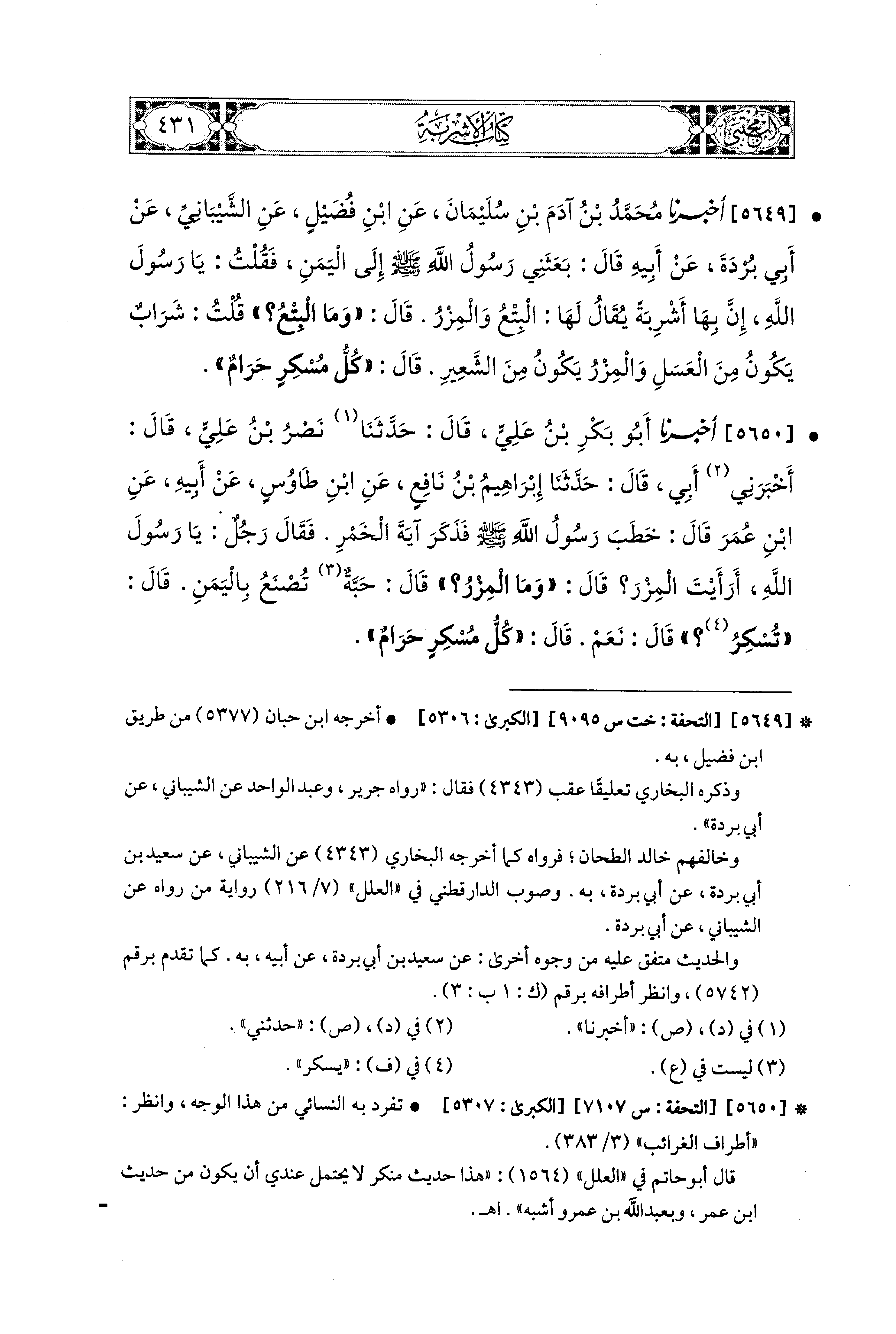 5649- أَخبَرَنا مُحَمد بنُ آدَمَ بْنِ سُلَيمَانَ، عَنِ ابنِ فُضَيْلٍ، عَنِ الشَّيْبَانِيِّ، عَن أَبي بُرْدَةَ، عَن أَبيهِ، قَالَ: بَعَثَنِي رَسُولُ اللهِ صَلى الله عَليه وسَلم إِلَى اليَمَنِ، فَقُلْتُ: يَا رَسُولَ اللهِ، إِنَّ بِهَا أَشْرِبَةً يُقَالُ لَهَا: البِتْعُ وَالمِزْرُ، قَالَ: وَمَا البِتْعُ؟ قُلْتُ: شَرَابٌ يَكُونُ مِنَ العَسَلِ، وَالمِزْرُ: يَكُونُ مِنَ الشَّعِيرِ، قَالَ: كُلُّ مُسْكِرٍ حَرَامٌ.
