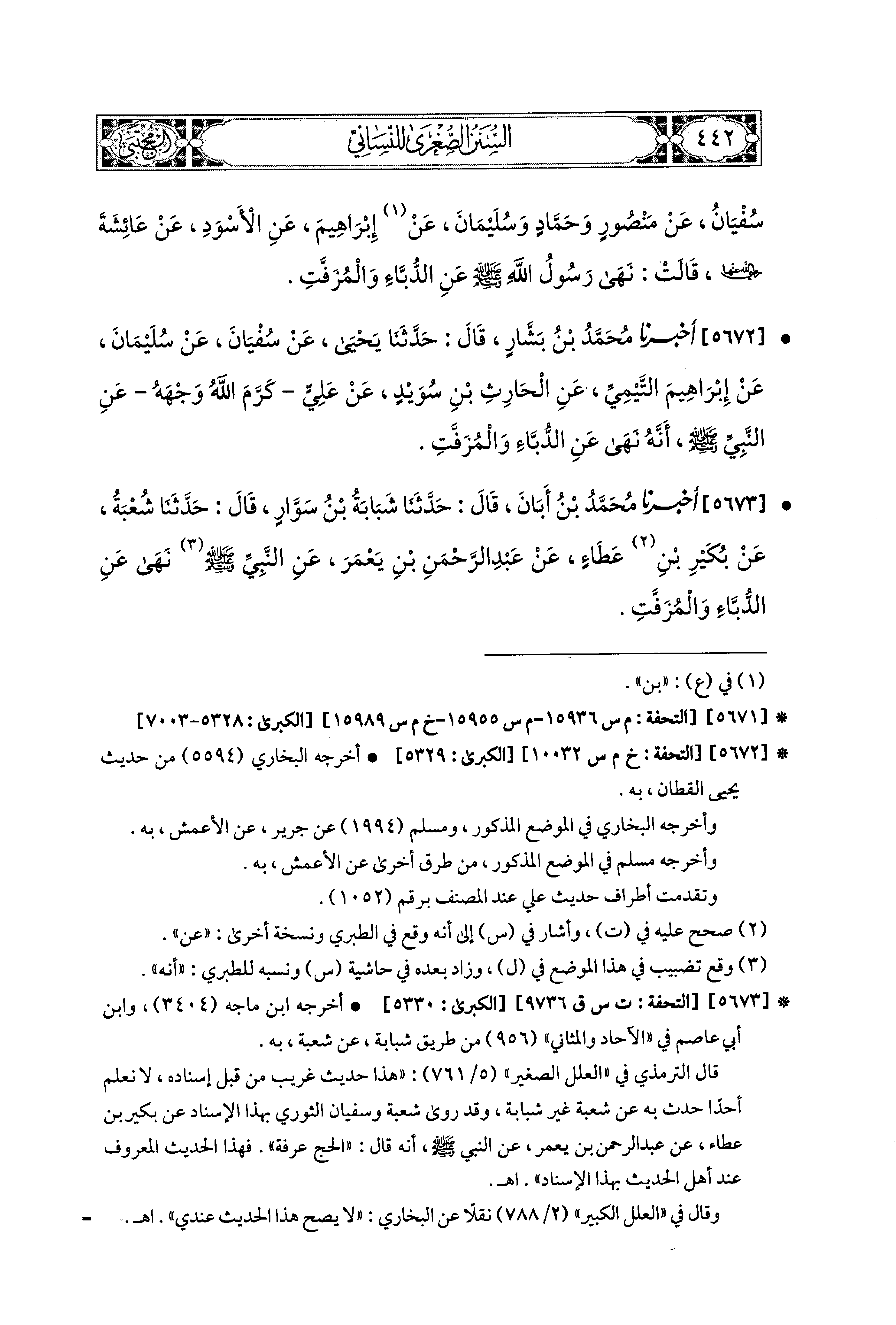 5673- أَخبَرَنا مُحَمد بنُ أَبَانَ، قال: حَدَّثنا شَبَابَةُ بنُ سَوَّارٍ، قال: حَدَّثنا شُعبَةُ، عَن بُكَيْرِ بْنِ عَطَاءٍ، عَن عَبدِ الرَّحْمَنِ بْنِ يَعْمَرَ، عَنِ النَّبيِّ صَلى الله عَليه وسَلم، نَهَى عَنِ الدُّبَّاءِ، وَالمُزَفَّتِ.