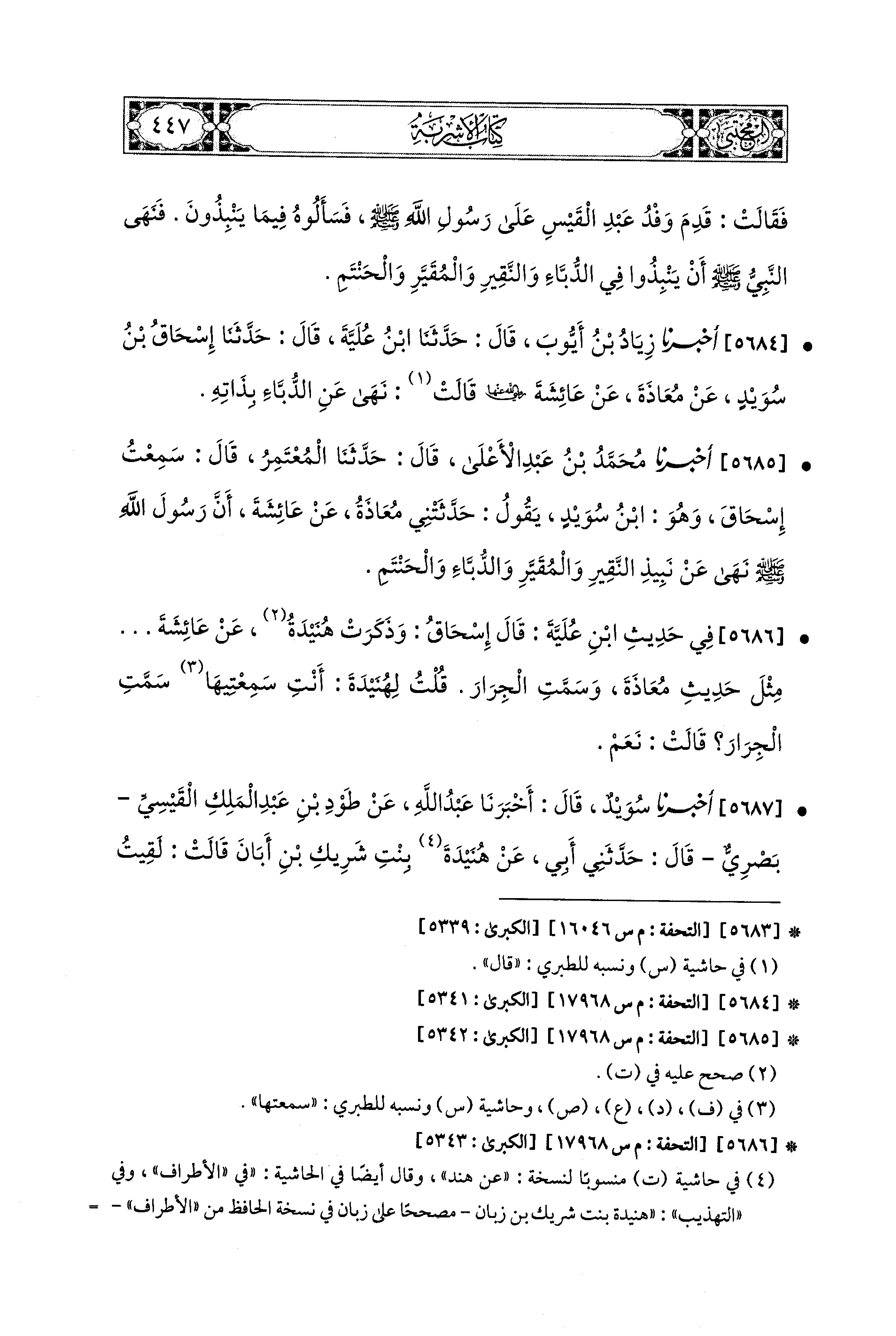 5685- أَخبَرَنا مُحَمد بن عَبدِ الأَعلَى، قال: حَدَّثنا المُعْتَمِرُ، قَالَ: سَمِعْتُ إِسحَاقَ، وَهُوَ ابنُ سُوَيْدٍ يَقُولُ: حَدَّثَتْنِي مُعَاذَةُ، عَن عَائِشَةَ، أَنَّ رَسُولَ اللهِ صَلى الله عَليه وسَلم نَهَى عَن نَبِيذِ النَّقِيرِ، وَالمُقَيَّرِ، وَالدُّبَّاءِ، وَالحَنْتَمِ.