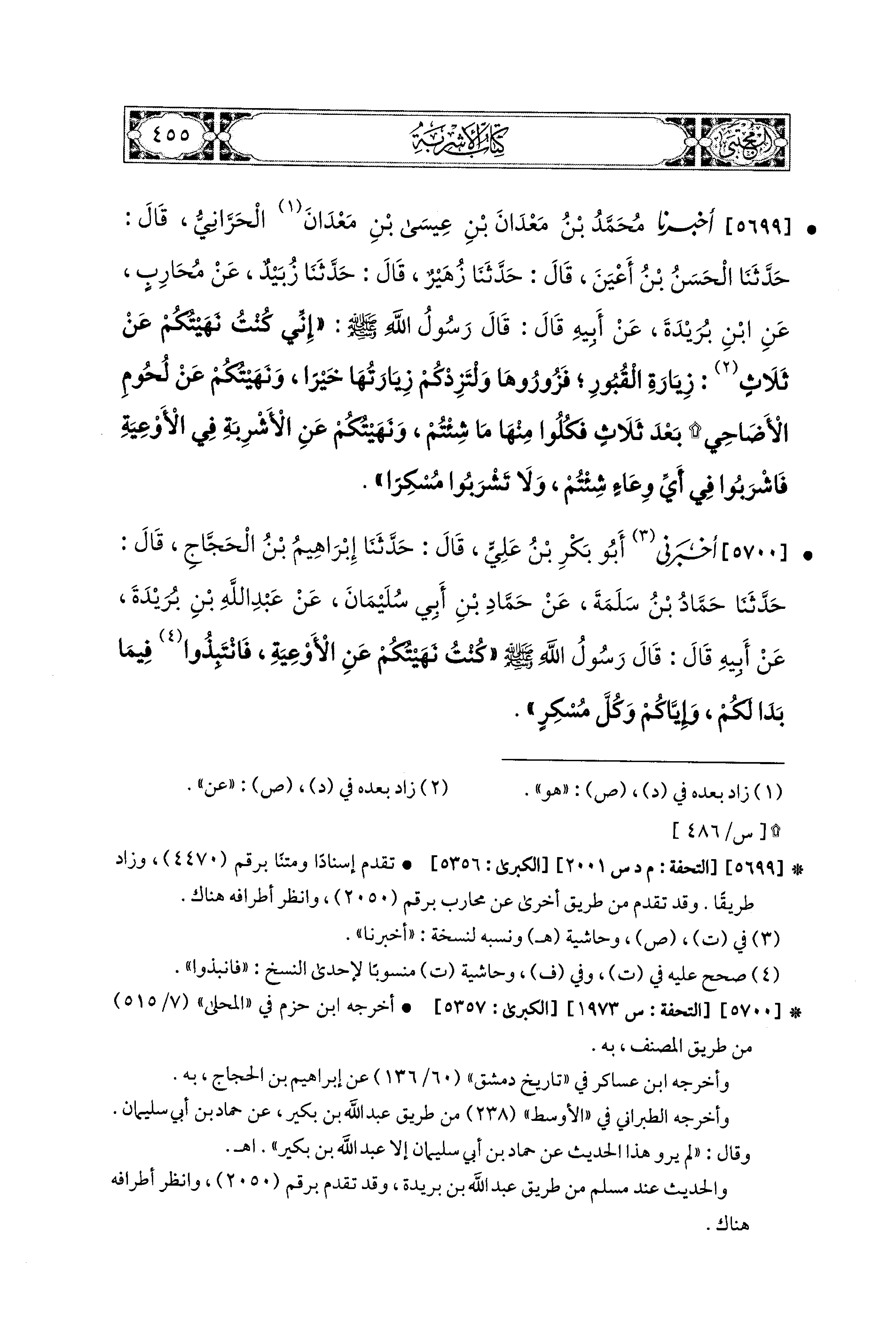 5699- أَخبَرَنا مُحَمد بنُ مَعْدَانَ بْنِ عِيسَى بْنِ مَعْدَانَ الحَرَّانِيُّ، قال: حَدَّثنا الحَسَنُ بنُ أَعْيَنَ، قال: حَدَّثنا زُهَيْرٌ، قال: حَدَّثنا زُبَيْدٌ، عَن مُحَارِبٍ، عَنِ ابنِ بُرَيْدَةَ، عَن أَبيهِ، قَالَ: قَالَ رَسُولُ اللهِ صَلى الله عَليه وسَلم: إِنِّي كُنْتُ نَهَيْتُكُمْ عَن ثَلاَثٍ: زِيَارَةِ القُبُورِ فَزُورُوهَا، وَلْتَزِدْكُمْ زِيَارَتُهَا خَيْرًا، وَنَهَيْتُكُمْ عَن لُحُومِ الأَضَاحِيِّ بَعْدَ ثَلاَثٍ فَكُلُوا مِنْهَا مَا شِئْتُمْ، وَنَهَيْتُكُمْ عَنِ الأَشْرِبَةِ فِي الأَوْعِيَةِ فَاشْرَبُوا فِي أَيِّ وِعَاءٍ شِئْتُمْ، وَلاَ تَشْرَبُوا مُسْكِرًا.