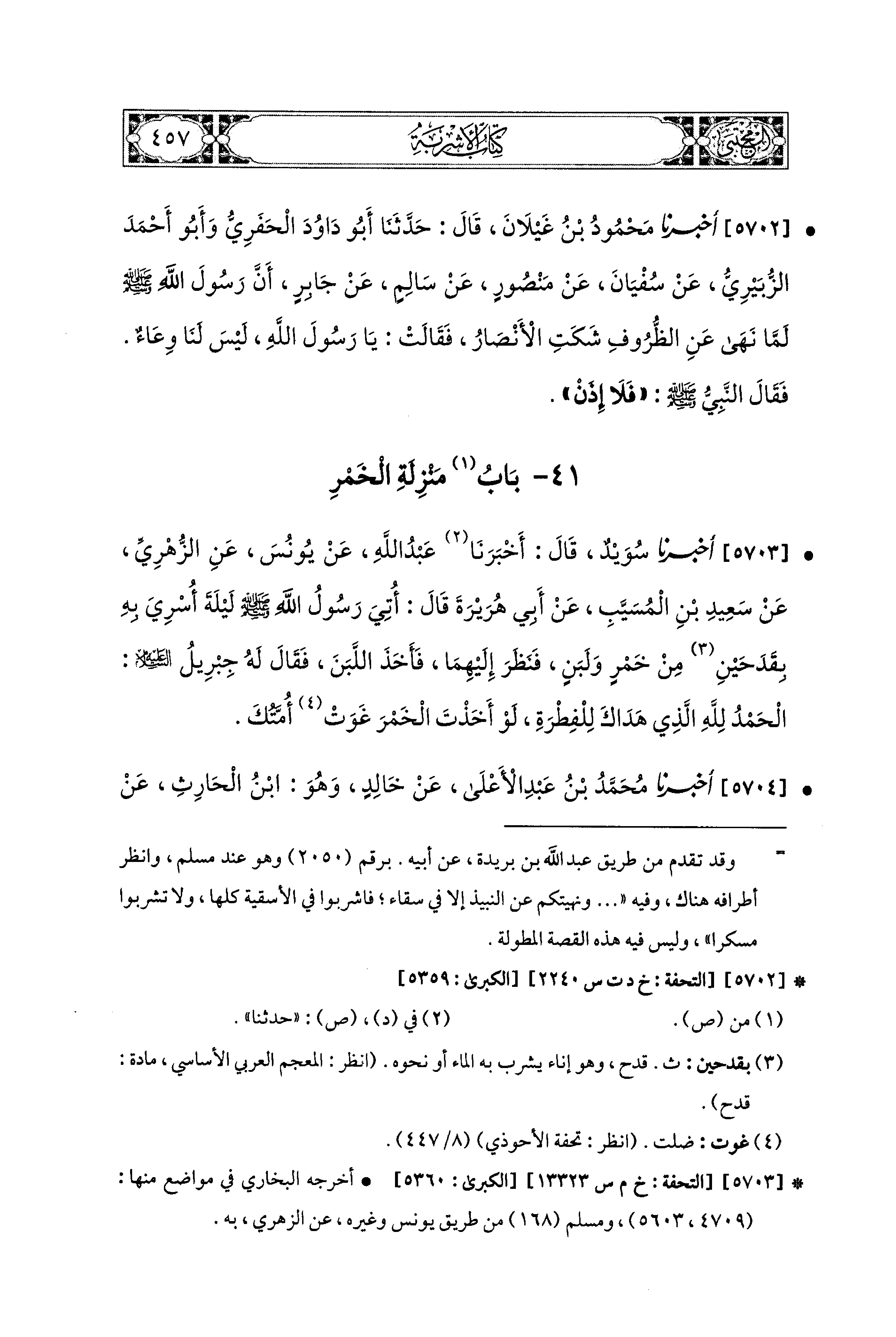 5703- أَخبَرَنا سُوَيْدٌ، قَالَ: أَخبَرَنا عَبدُ اللهِ، عَن يُونُسَ، عَنِ الزُّهْرِيِّ، عَن سَعيدِ بْنِ المُسَيَّبِ، عَن أَبي هُرَيْرَةَ قَالَ: أُتِيَ رَسُولُ اللهِ صَلى الله عَليه وسَلم لَيْلَةَ أُسْرِيَ بِهِ بِقَدَحَيْنِ مِنْ خَمْرٍ وَلَبَنٍ، فَنَظَرَ إِلَيْهِمَا، فَأَخَذَ اللَّبَنَ، فَقَالَ لَهُ جِبْرِيلُ عَلَيهِ السَّلاَمُ: الحَمْدُ لِلَّهِ الَّذِي هَدَاكَ لِلْفِطْرَةِ، لَوْ أَخَذْتَ الخَمْرَ غَوَتْ أُمَّتُكَ.