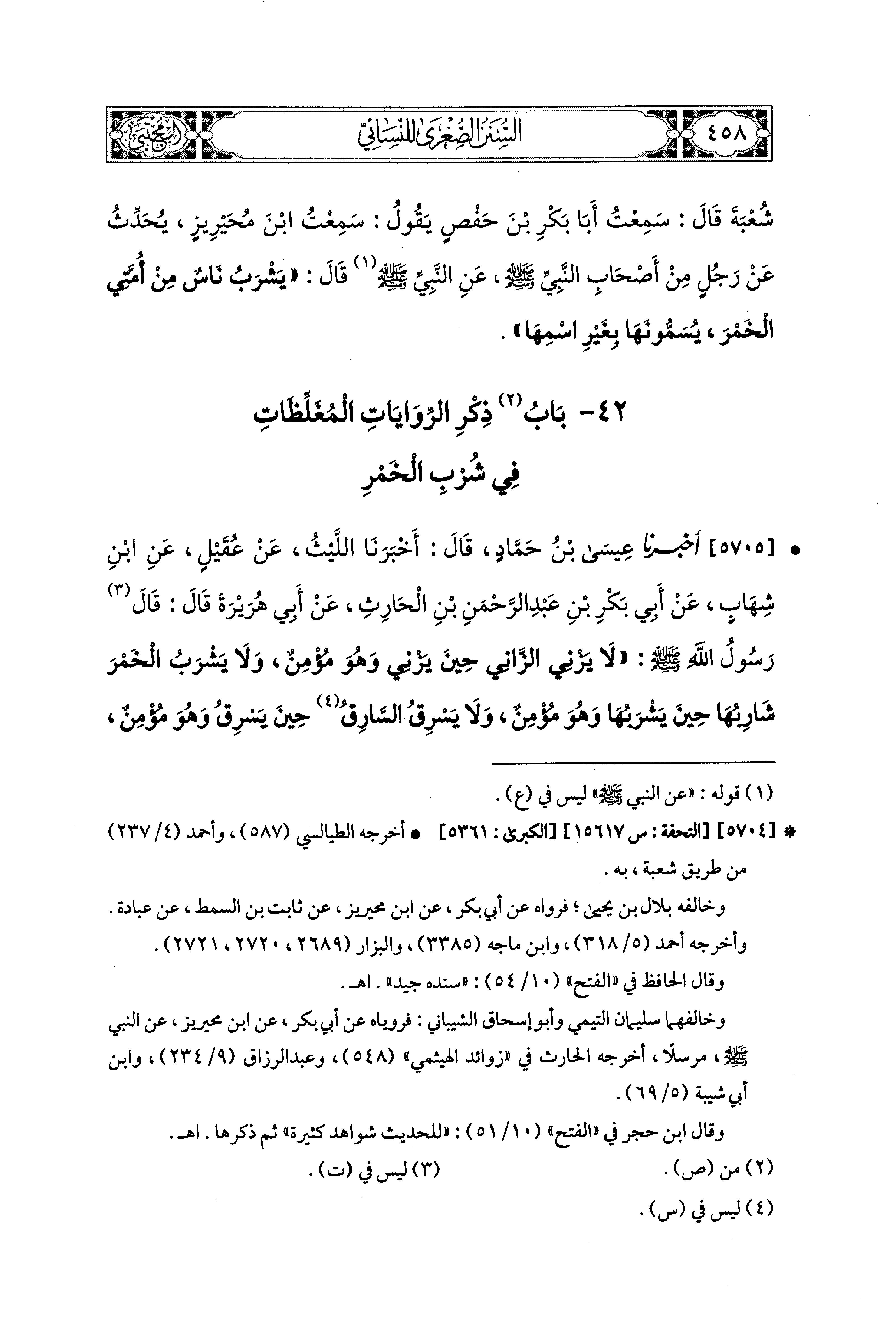 5705- أَخبَرَنا عِيسَى بنُ حَمَّادٍ، قَالَ: أَخبَرَنا اللَّيْثُ، عَن عُقَيْلٍ، عَنِ ابنِ شِهَابٍ، عَن أَبي بَكْرِ بْنِ عَبدِ الرَّحْمَنِ بْنِ الحَارِثِ، عَن أَبي هُرَيْرَةَ قَالَ: قَالَ رَسُولُ اللهِ صَلى الله عَليه وسَلم: لاَ يَزْنِي الزَّانِي حِينَ يَزْنِي وَهُوَ مُؤْمِنٌ، وَلاَ يَشْرَبُ الخَمْرَ شَارِبُهَا حِينَ يَشْرَبُهَا وَهُوَ مُؤْمِنٌ، وَلاَ يَسْرِقُ السَّارِقُ حِينَ يَسْرِقُ وَهُوَ مُؤْمِنٌ، وَلاَ يَنْتَهِبُ نُهْبَةً يَرْفَعُ النَّاسُ إِلَيْهِ فِيهَا أَبْصَارَهُمْ حِينَ يَنْتَهِبُهَا وَهُوَ مُؤْمِنٌ.