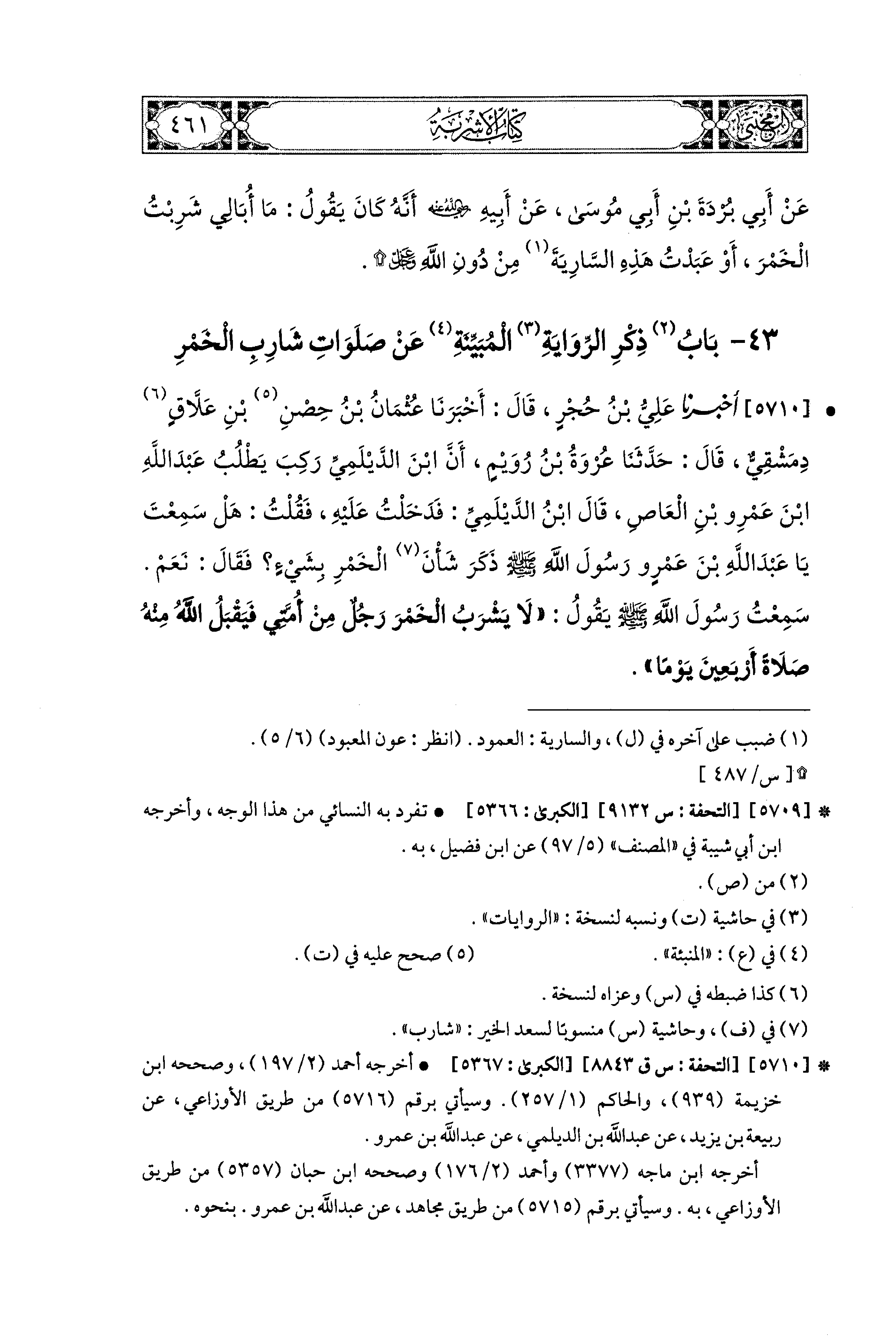 5710- أَخبَرَنا عَلِيُّ بنُ حُجْرٍ، قَالَ: أَخبَرَنا عُثْمَانُ بنُ حِصْنِ بْنِ عَلاَّقٍ, دِمَشْقِيٌّ، قال: حَدَّثنا عُرْوَةُ بنُ رُوَيْمٍ، أَنَّ ابنَ الدَّيْلَمِيِّ رَكِبَ يَطْلُبُ عَبدَ اللهِ بْنَ عَمْرِو بْنِ العَاصِ، قَالَ: ابنُ الدَّيْلَمِيِّ: فَدَخَلْتُ عَلَيهِ، فَقُلْتُ: هَلْ سَمِعْتَ يَا عَبدَ اللهِ بْنَ عَمْرٍو رَسُولَ اللهِ صَلى الله عَليه وسَلم ذَكَرَ شَأْنَ الخَمْرِ بِشَيْءٍ؟ فَقَالَ: نَعَمْ، سَمِعْتُ رَسُولَ اللهِ صَلى الله عَليه وسَلم يَقُولُ: لاَ يَشْرَبُ الخَمْرَ رَجُلٌ مِنْ أُمَّتِي فَيَقْبَلُ اللهُ مِنْهُ صَلاَةً أَرْبَعِينَ يَوْمًا.