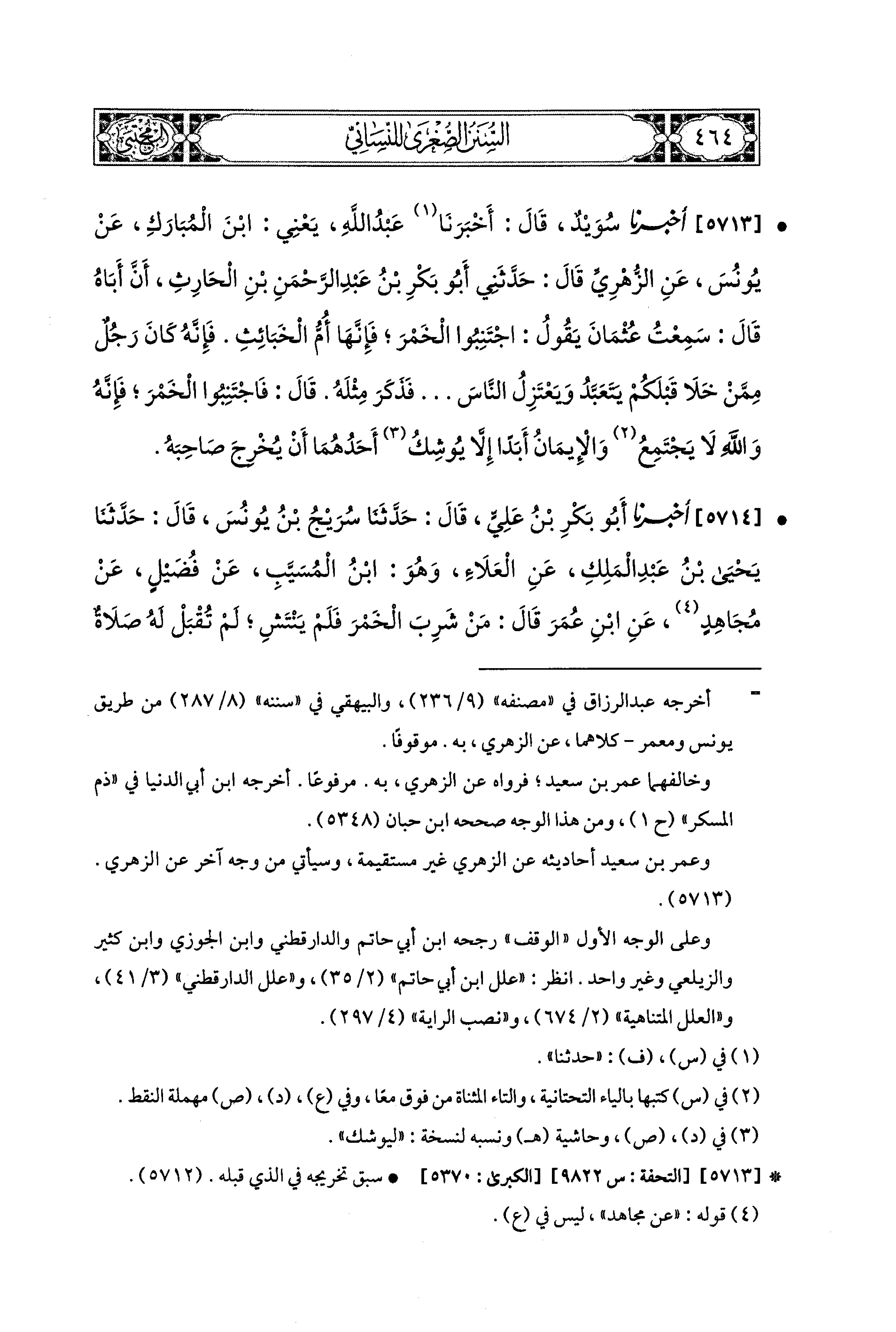 5713- أَخبَرَنا سُوَيْدٌ، قَالَ: أَخبَرَنا عَبدُ اللهِ، يَعْنِي ابنَ المُبَارَكِ، عَن يُونُسَ، عَنِ الزُّهْرِيِّ، قَالَ: حَدَّثني أَبو بَكْرِ بنُ عَبدِ الرَّحْمَنِ بْنِ الحَارِثِ، أَنَّ أَبَاهُ، قَالَ: سَمِعْتُ عُثْمَانَ يَقُولُ: اجْتَنِبُوا الخَمْرَ، فَإِنَّهَا أُمُّ الخَبَائِثِ، فَإِنَّهُ كَانَ رَجُلٌ مِمَّنْ خَلاَ قَبْلَكُمْ يَتَعَبَّدُ وَيَعْتَزِلُ النَّاسَ، فَذَكَرَ مِثْلَهُ، قَالَ: فَاجْتَنِبُوا الخَمْرَ فَإِنَّهُ وَاللَّهِ لاَ يَجْتَمِعُ وَالإِيمَانُ أَبَدًا إِلاَّ يُوشِكَ أَحَدُهُمَا أَنْ يُخْرِجَ صَاحِبَهُ.