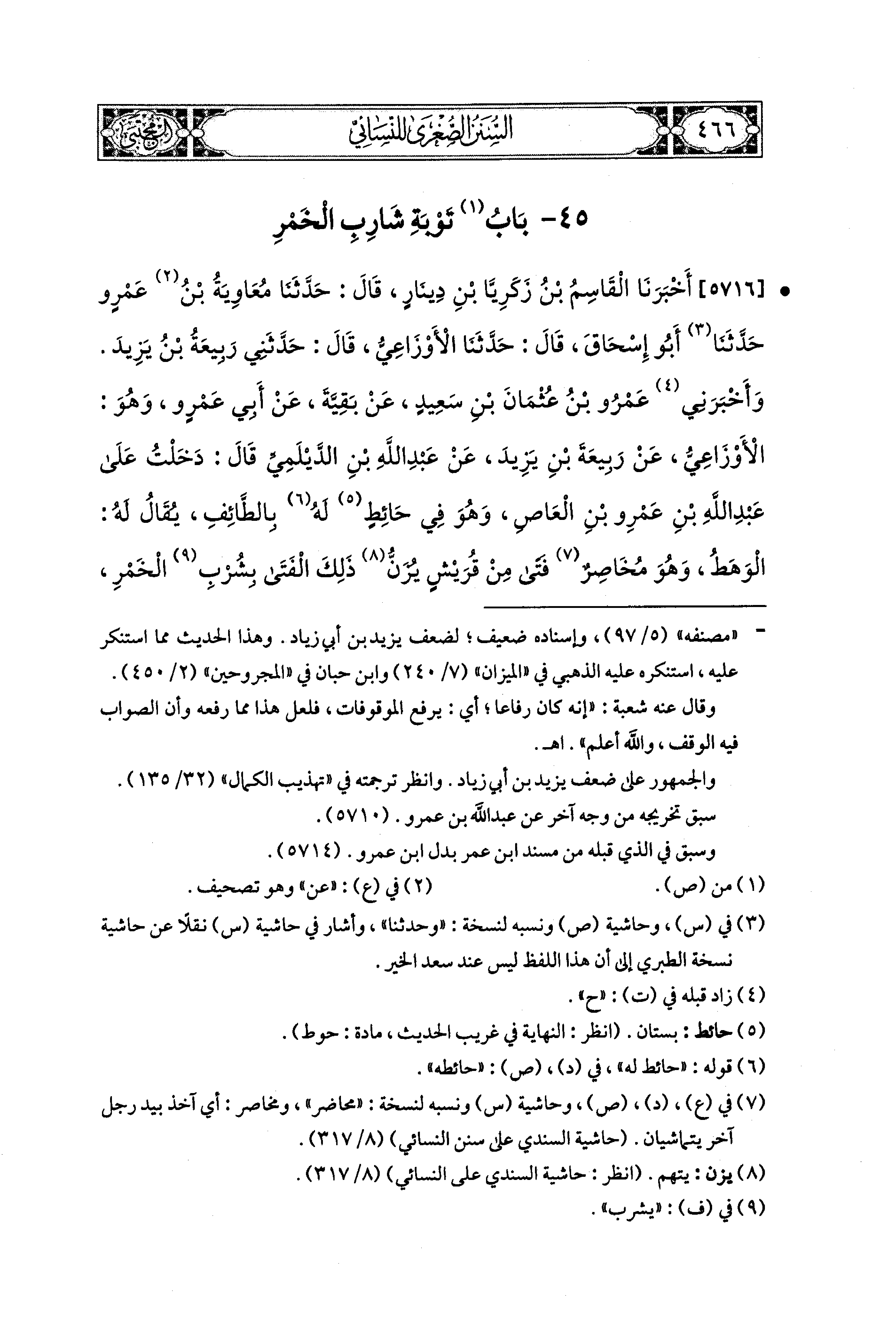 5716- أَخبَرَنا القَاسِمُ بنُ زَكَرِيَّا بْنِ دِينَارٍ، قال: حَدَّثنا مُعَاوِيَةُ بنُ عَمْرٍو، حَدَّثَنَا أَبو إِسحَاقَ، قال: حَدَّثنا الأَوْزَاعِيُّ، قَالَ: حَدَّثني رَبِيعَةُ بنُ يَزِيدَ (ح) وأَخْبَرَنِي عَمْرُو بنُ عُثْمَانَ بْنِ سَعيدٍ، عَن بَقِيَّةَ، عَن أَبي عَمْرٍو، وَهُوَ الأَوْزَاعِيُّ، عَن رَبِيعَةَ بْنِ يَزِيدَ، عَن عَبد اللهِ بن الدَّيْلَمِيِّ، قَالَ: دَخَلْتُ عَلَى عَبدِ اللهِ بْنِ عَمْرِو بْنِ العَاصِ وَهُوَ فِي حَائِطٍ لَهُ بِالطَّائِفِ، يُقَالُ لَهُ: الوَهْطُ، وَهُوَ مُخَاصِرٌ فَتًى مِنْ قُرَيْشٍ يُزَنُّ ذَلِكَ الفَتَى بِشُرْبِ الخَمْرِ، فَقَالَ: سَمِعْتُ رَسُولَ اللهِ صَلى الله عَليه وسَلم يَقُولُ: مَنْ شَرِبَ الخَمْرَ شَرْبَةً لَمْ تُقْبَلْ لَهُ تَوْبَةٌ أَرْبَعِينَ صَبَاحًا، فَإِنْ تَابَ تَابَ اللهُ عَلَيهِ، فَإِنْ عَادَ لَمْ تُقْبَلْ تَوْبَتُهُ أَرْبَعِينَ صَبَاحًا، فَإِنْ تَابَ تَابَ اللهُ عَلَيهِ، فَإِنْ عَادَ كَانَ حَقًّا عَلَى اللهِ عز وجل أَنْ يَسْقِيَهُ مِنْ طِينَةِ الخَبَالِ يَوْمَ القِيَامَةِ.
