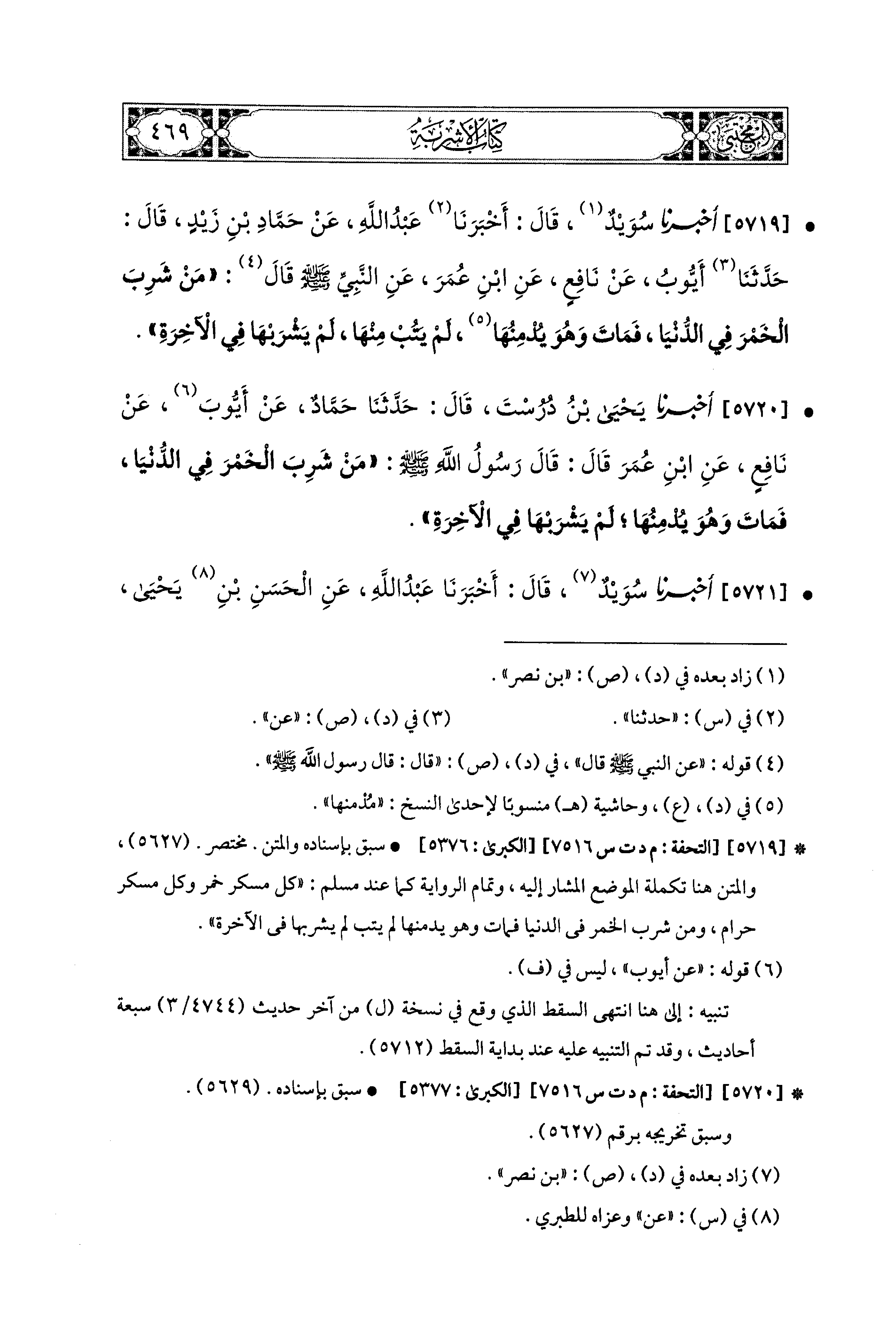 5720- أَخبَرَنا يَحيَى بنُ دُرُسْتَ، قال: حَدَّثنا حَمَّادٌ، عَن أَيُّوبَ، عَن نَافِعٍ، عَنِ ابنِ عُمَرَ، قَالَ: قَالَ رَسُولُ اللهِ صَلى الله عَليه وسَلم: مَنْ شَرِبَ الخَمْرَ فِي الدُّنْيَا، فَمَاتَ وَهُوَ يُدْمِنُهَا، لَمْ يَشْرَبْهَا فِي الآخِرَةِ.