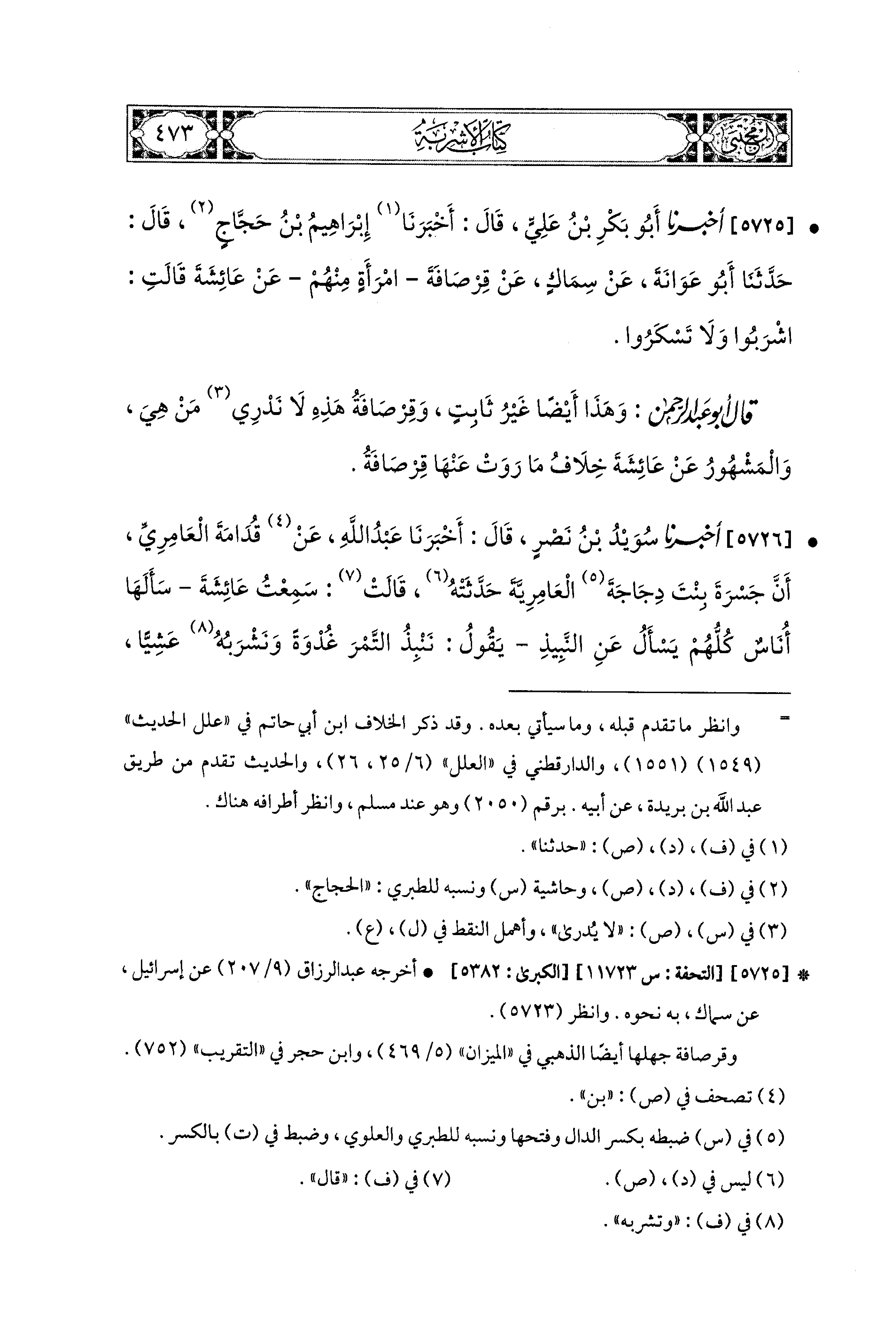 5725- أَخبَرَنا أَبو بَكْرِ بنُ عَلِيٍّ، قَالَ: أَخبَرَنا إِبراهِيمُ بنُ حَجَّاجٍ، قال: حَدَّثنا أَبو عَوَانَةَ، عَن سِمَاكٍ، عَن قِرْصَافَةَ، امْرَأَةٍ مِنْهُمْ، عَن عَائِشَةَ قَالَتْ: اشْرَبُوا، وَلاَ تَسْكَرُوا.