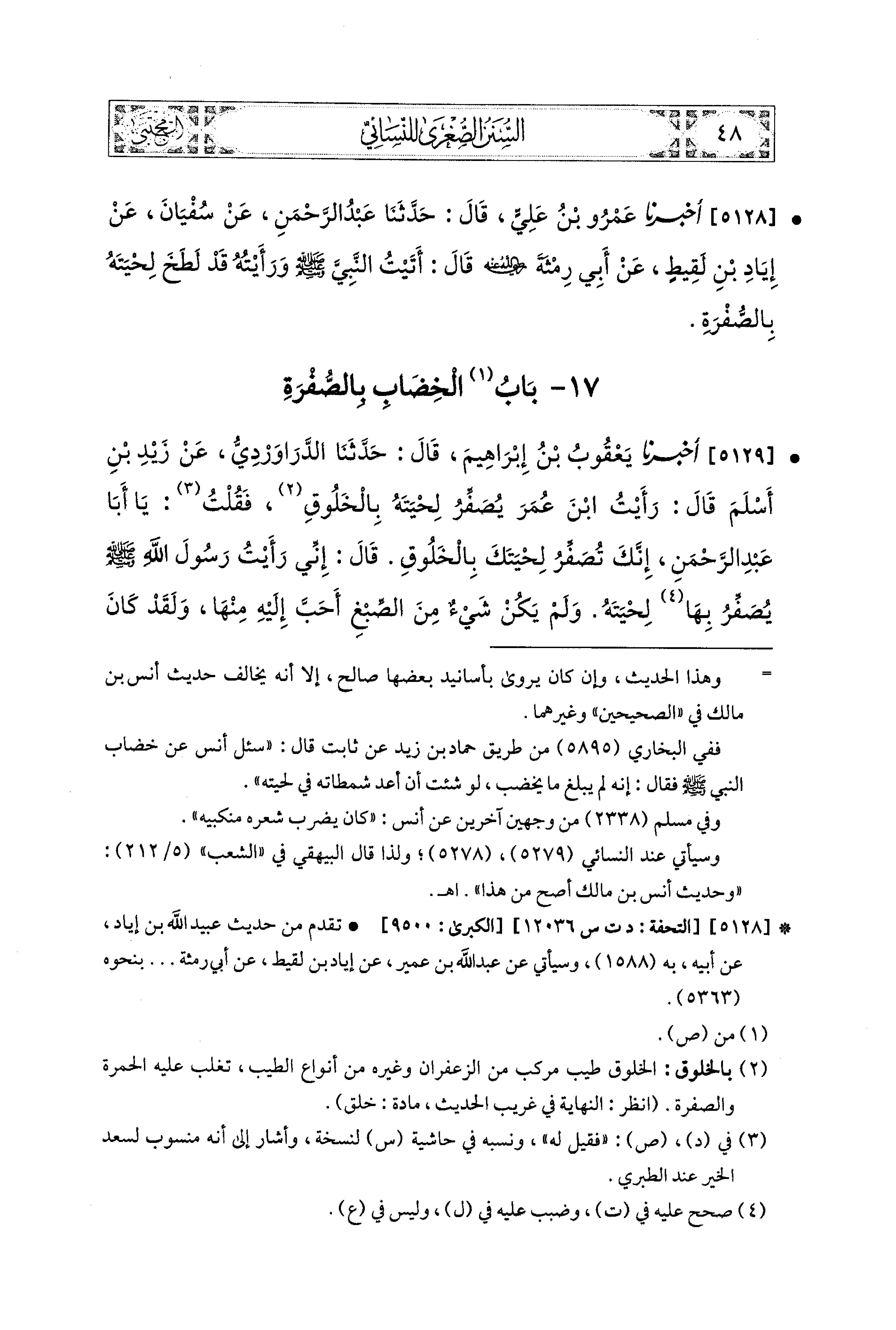 5128- أَخبَرَنا عَمْرُو بنُ عَلِيٍّ، قال: حَدَّثنا عَبدُ الرَّحْمَنِ، عَن سُفيَانَ، عَن إِيَادِ بْنِ لَقِيطٍ، عَن أَبي رِمْثَةَ رَضِيَ اللهُ عَنهُ قَالَ: أَتَيْتُ النَّبيَّ صَلى الله عَليه وسَلم وَرَأَيْتُهُ قَدْ لَطَخَ لِحْيَتَهُ بِالصُّفْرَةِ.