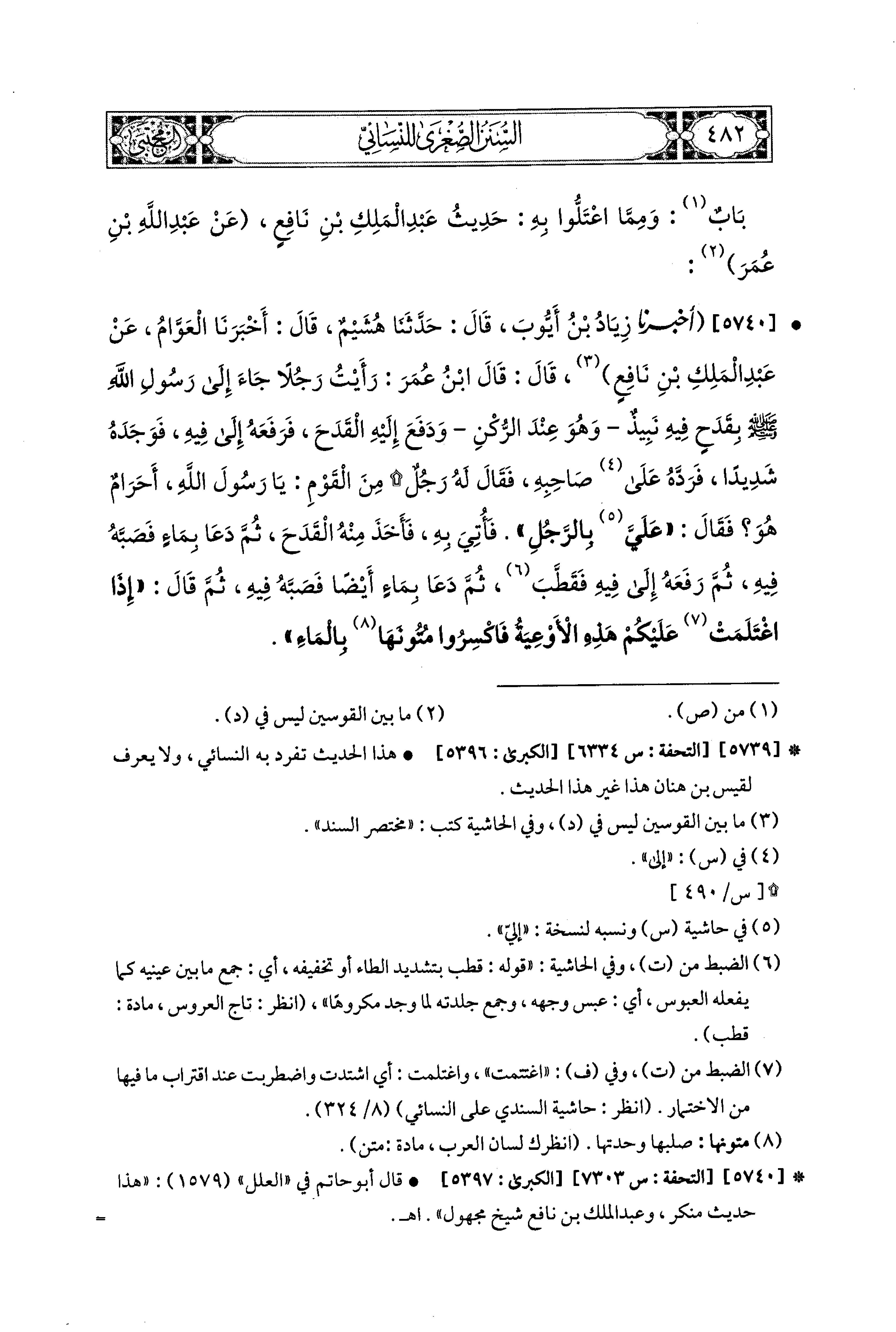 5740- أَخبَرَنا زِيَادُ بنُ أَيُّوبَ، قال: حَدَّثنا هُشَيْمٌ، قَالَ: أَخبَرَنا العَوَّامُ، عَن عَبدِ المَلِكِ بْنِ نَافِعٍ قَالَ: قَالَ ابنُ عُمَرَ: رَأَيْتُ رَجُلاً جَاءَ إِلَى رَسُولِ اللهِ صَلى الله عَليه وسَلم، بِقَدَحٍ فِيهِ نَبِيذٌ، وَهُوَ عِنْدَ الرُّكْنِ، وَدَفَعَ إِلَيْهِ القَدَحَ، فَرَفَعَهُ إِلَى فِيهِ، فَوَجَدَهُ شَدِيدًا، فَرَدَّهُ عَلَى صَاحِبِهِ، فَقَالَ لَهُ رَجُلٌ مِنَ القَوْمِ: يَا رَسُولَ اللهِ، أَحَرَامٌ هُوَ؟ فَقَالَ: عَلَيَّ بِالرَّجُلِ، فَأُتِيَ بِهِ، فَأَخَذَ مِنْهُ القَدَحَ، ثُمَّ دَعَا بِمَاءٍ فَصَبَّهُ فِيهِ، ثم رَفَعَهُ إِلَى فِيهِ فَقَطَّبَ، ثُمَّ دَعَا بِمَاءٍ أَيْضًا فَصَبَّهُ فِيهِ، ثُمَّ قَالَ: إِذَا اغْتَلَمَتْ عَلَيْكُمْ هَذِهِ الأَوْعِيَةُ، فَاكْسِرُوا مُتُونَهَا بِالمَاءِ.