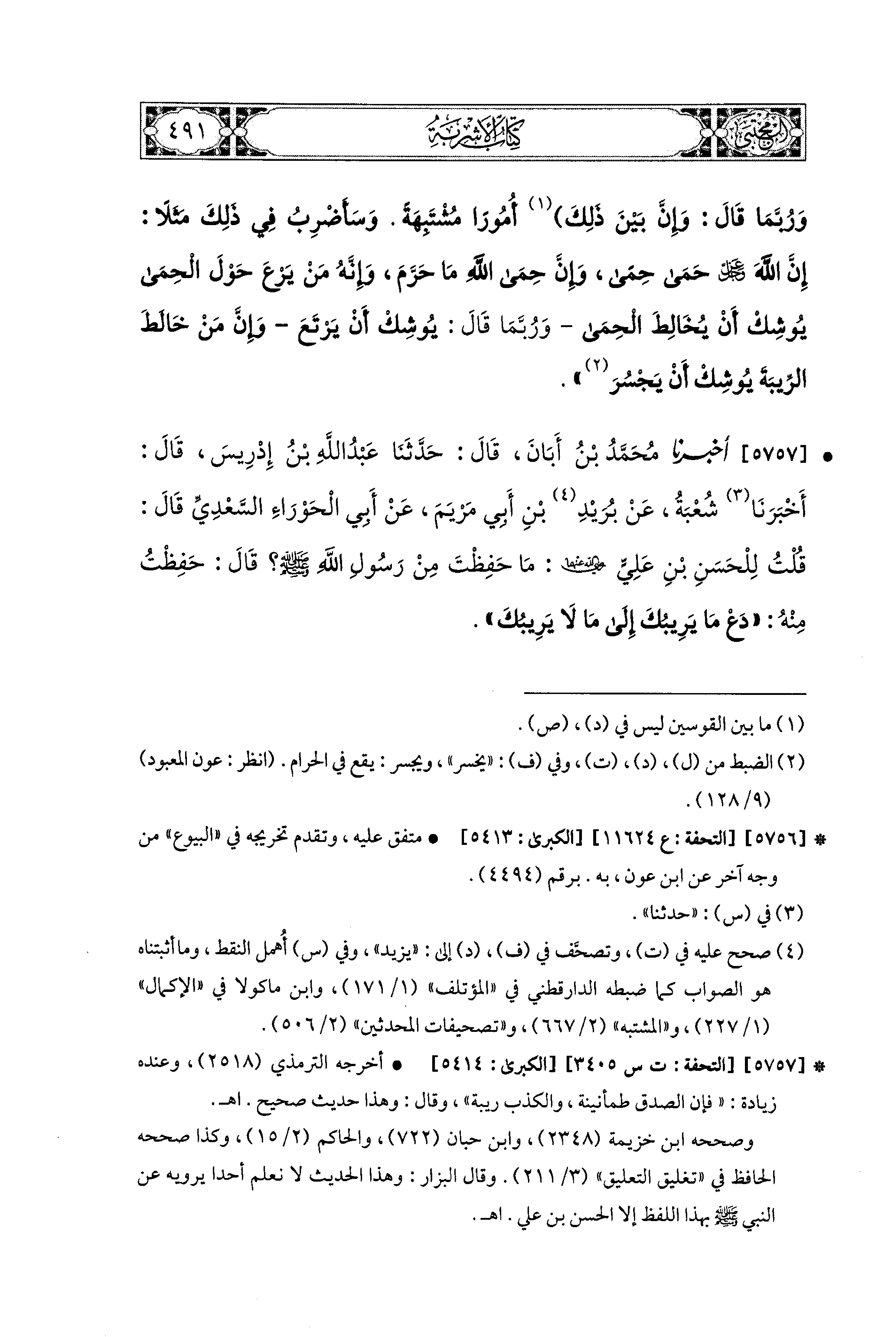 5757- أَخبَرَنا مُحَمد بنُ أَبَانَ، قال: حَدَّثنا عَبدُ اللهِ بنُ إِدْرِيسَ، قَالَ: أَخبَرَنا شُعبَةُ، عَن بُرَيْدِ بْنِ أَبي مَرْيَمَ، عَن أَبي الحَوْرَاءِ السَّعْديِّ، قَالَ: قُلْتُ لِلْحَسَنِ بْنِ عَلِيٍّ رَضِيَ اللهُ عَنهُمَا: مَا حَفِظْتَ مِنْ رَسُولِ اللهِ صَلى الله عَليه وسَلم؟ قَالَ: حَفِظْتُ مِنْهُ: دَعْ مَا يَرِيبُكَ إِلَى مَا لاَ يَرِيبُكَ.