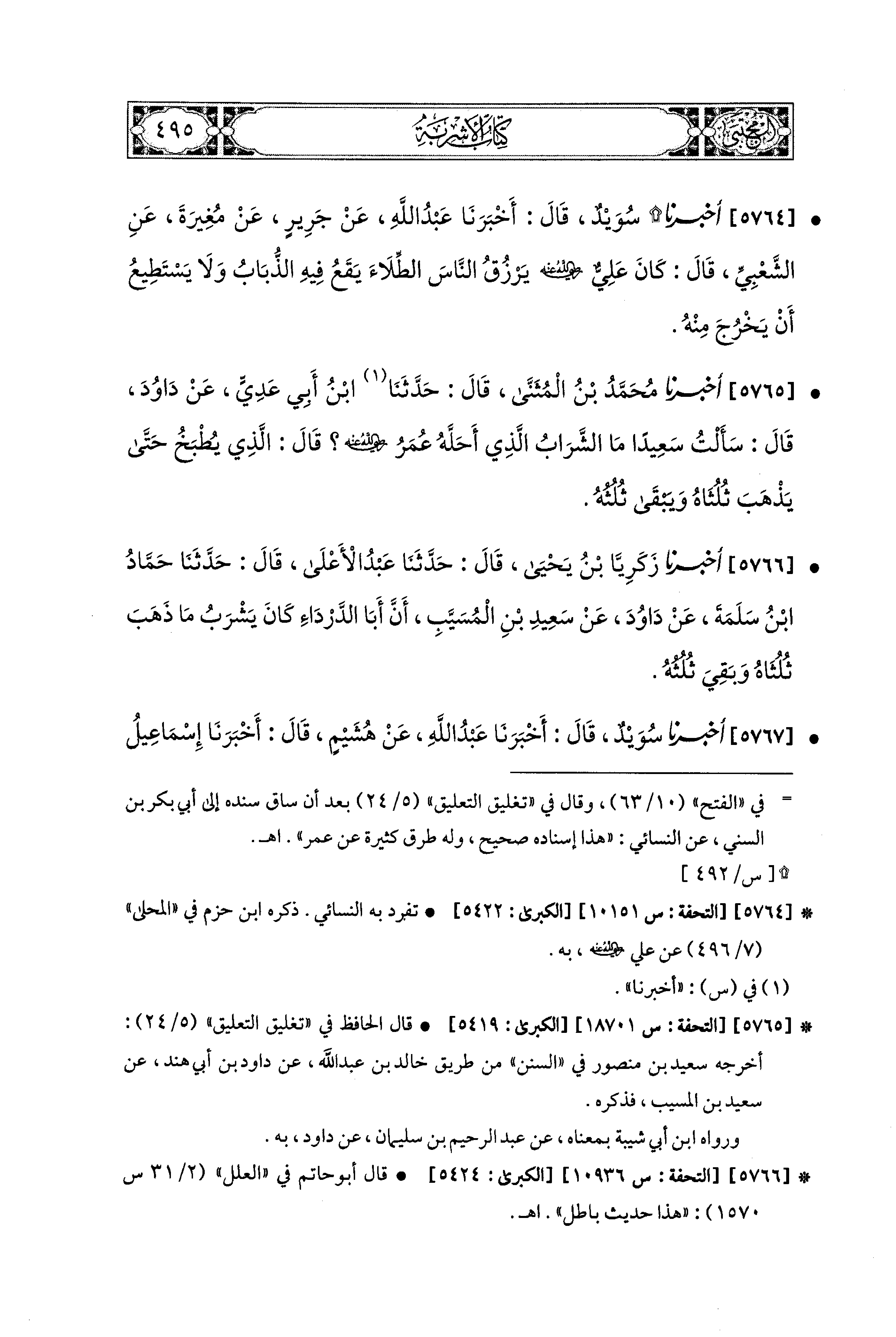 5765- أَخبَرَنا مُحَمد بنُ المُثَنَّى، قال: حَدَّثنا ابنُ أَبي عَدِيٍّ، عَن دَاوُدَ، قَالَ: سَأَلْتُ سَعيدًا: مَا الشَّرَابُ الَّذِي أَحَلَّهُ عُمَرُ رَضِيَ اللهُ عَنهُ؟ قَالَ: الَّذِي يُطْبَخُ حَتَّى يَذْهَبَ ثُلُثَاهُ، وَيَبْقَى ثُلُثَهُ.