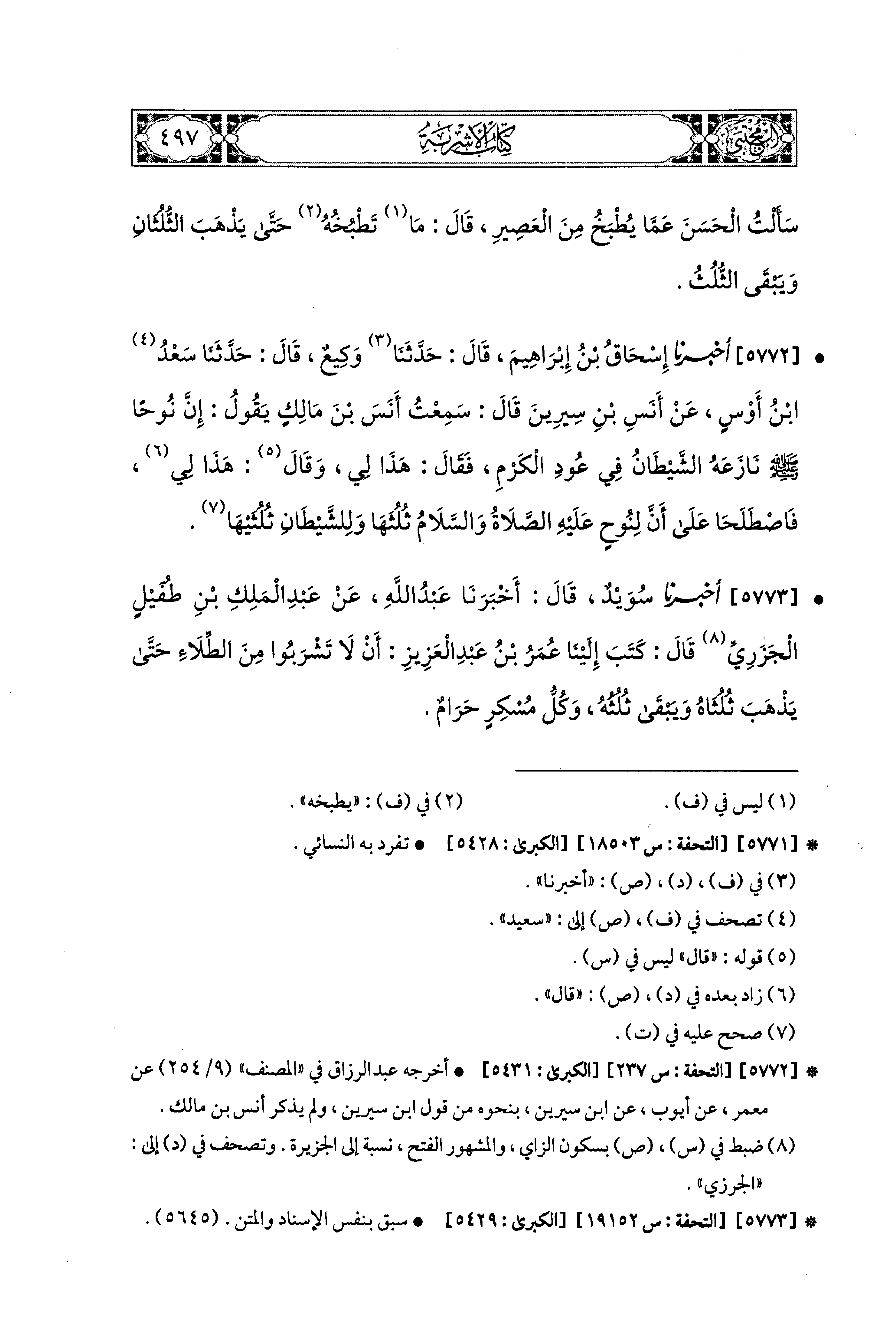 5773- أَخبَرَنا سُوَيْدٌ، قَالَ: أَخبَرَنا عَبدُ اللهِ، عَن عَبدِ المَلِكِ بْنِ طُفَيْلٍ الجَزَرِيِّ، قَالَ: كَتَبَ إِلَيْنَا عُمَرُ بنُ عَبدِ العَزِيزِ: أَنْ لاَ تَشْرَبُوا مِنَ الطِّلاَءِ حَتَّى يَذْهَبَ ثُلُثَاهُ، وَيَبْقَى ثُلُثُهُ، وَكُلُّ مُسْكِرٍ حَرَامٌ.