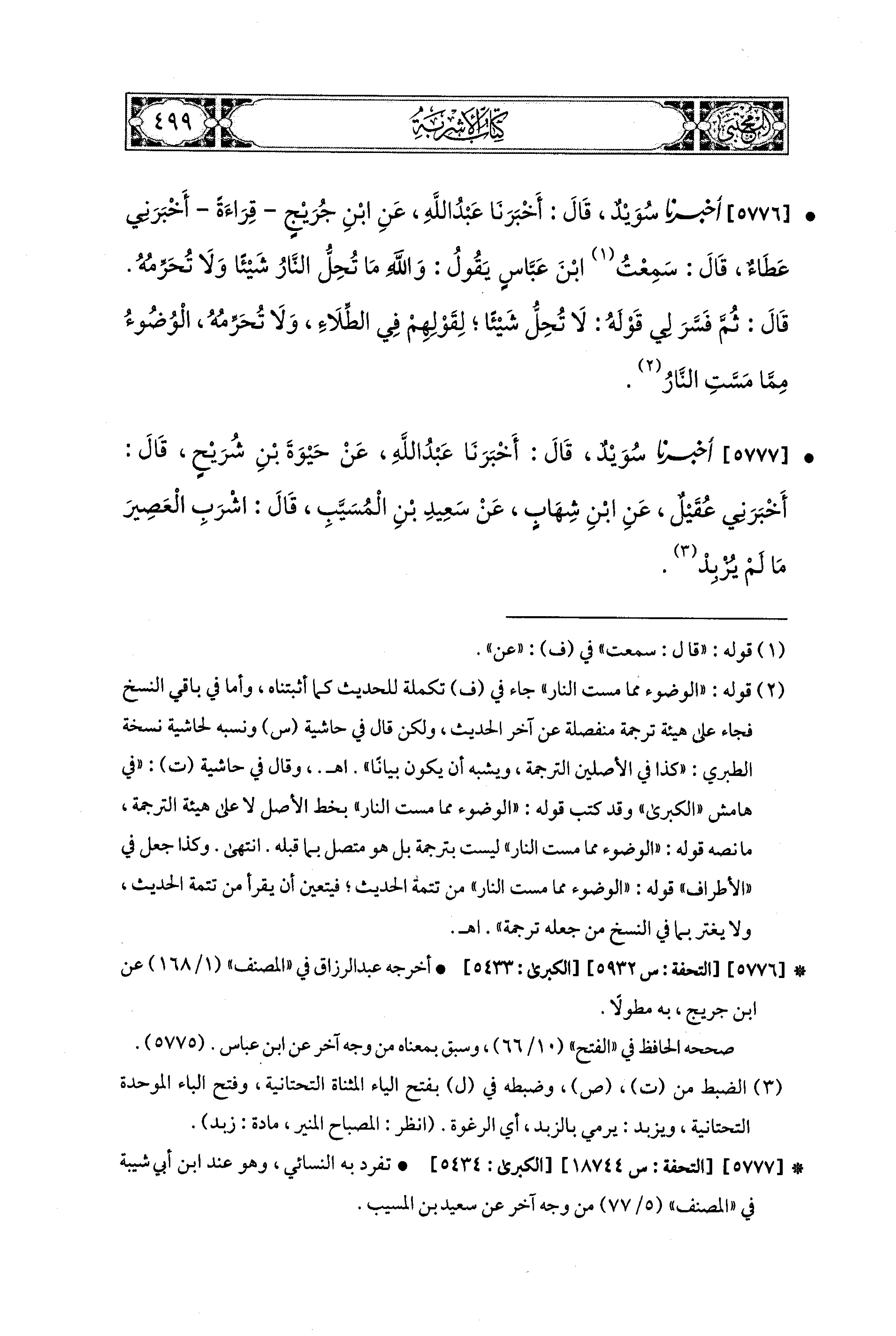 5776- أَخبَرَنا سُوَيْدٌ، قَالَ: أَخبَرَنا عَبدُ اللهِ، عَنِ ابنِ جُرَيْجٍ، قِرَاءَةً أَخْبَرَنِي عَطَاءٌ، قَالَ: سَمِعْتُ ابنَ عَبَّاسٍ يَقُولُ: وَاللَّهِ مَا تُحِلُّ النَّارُ شَيْئًا، وَلاَ تُحَرِّمُهُ، قَالَ: ثُمَّ فَسَّرَ لِي قَوْلَهُ: لاَ تُحِلُّ شَيْئًا لِقَوْلِهِمْ فِي الطِّلاَءِ، وَلاَ تُحَرِّمُهُ الوُضُوءُ مِمَّا مَسَّتِ النَّارُ.