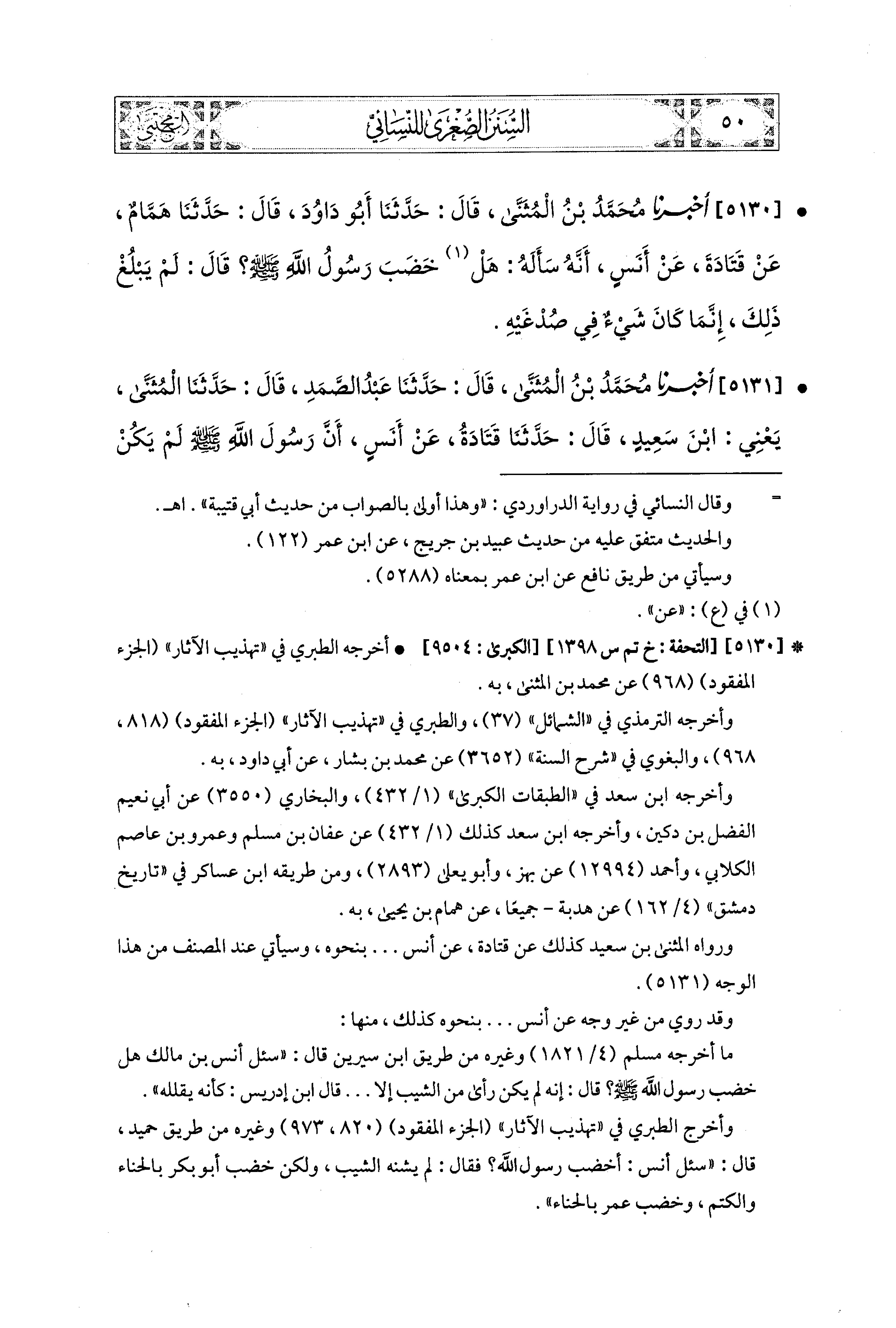 5131- أَخبَرَنا مُحَمد بنُ المُثَنَّى، قال: حَدَّثنا عَبدُ الصَّمَدِ، قال: حَدَّثنا المُثَنَّى، يَعْنِي ابنَ سَعيدٍ، قال: حَدَّثنا قَتَادَةُ، عَن أَنَسٍ، أَنَّ رَسُولَ اللهِ صَلى الله عَليه وسَلم لَمْ يَكُنْ يَخْضِبَ، إِنَّمَا كَانَ الشَّمَطُ عِنْدَ العَنفَقَةِ يَسِيرًا وَفِي الصُّدْغَيْنِ يَسِيرًا، وَفِي الرَّأْسِ يَسِيرًا.