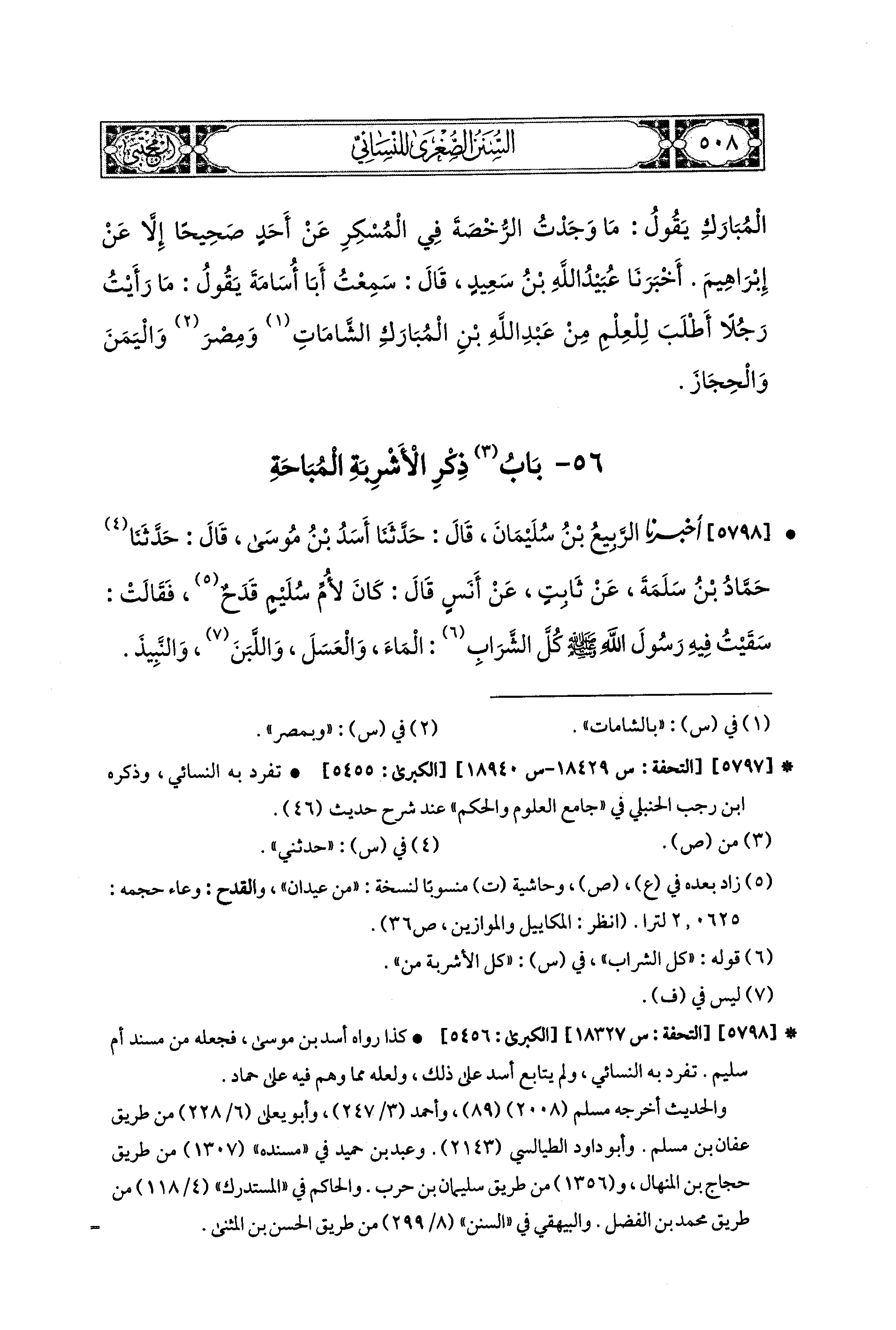 5798- أَخبَرَنا الرَّبِيعُ بنُ سُلَيمَانَ، قال: حَدَّثنا أَسَدُ بنُ مُوسَى، قال: حَدَّثنا حَمَّادُ بنُ سَلَمَةَ، عَن ثَابِتٍ، عَن أَنَسٍ, قَالَ: كَانَ لأُمِّ سُلَيْمٍ قَدَحٌ, فَقَالَتْ: سَقَيْتُ فِيهِ رَسُولَ اللهِ صَلى الله عَليه وسَلم كُلَّ الشَّرَابِ, المَاءَ، وَالعَسَلَ، وَاللَّبَنَ، وَالنَّبيذَ.