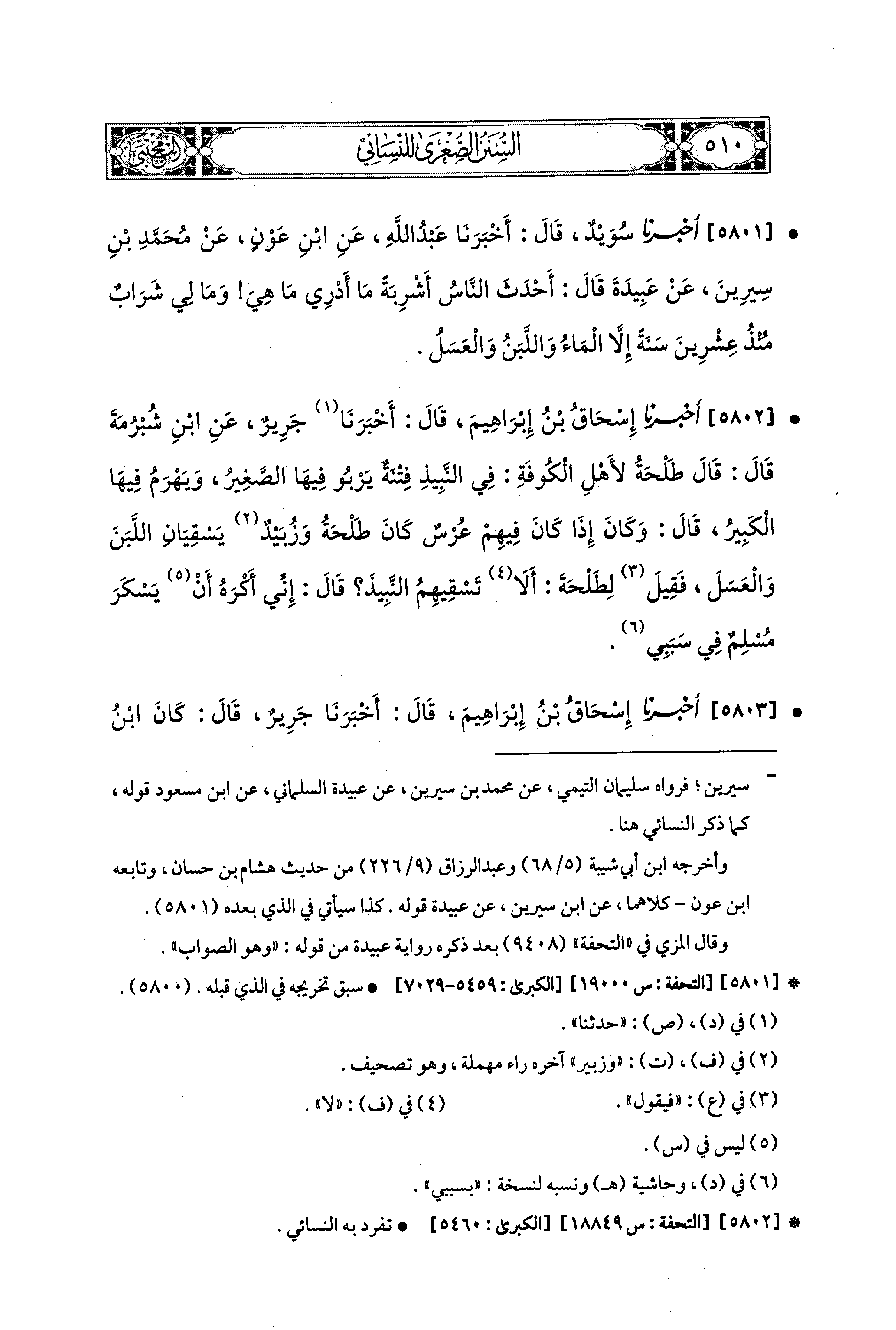 5801- أَخبَرَنا سُوَيْدٌ، قَالَ: أَخبَرَنا عَبدُ اللهِ، عَنِ ابنِ عَوْنٍ، عَن مُحَمدِ بْنِ سِيرِينَ، عَن عَبِيدَةَ، قَالَ: أَحْدَثَ النَّاسُ أَشْرِبَةً مَا أَدْرِي مَا هِيَ، وَمَا لِي شَرَابٌ مُنْذُ عِشْرِينَ سَنَةً إِلاَّ المَاءُ، وَاللَّبَنُ، وَالعَسَلُ.