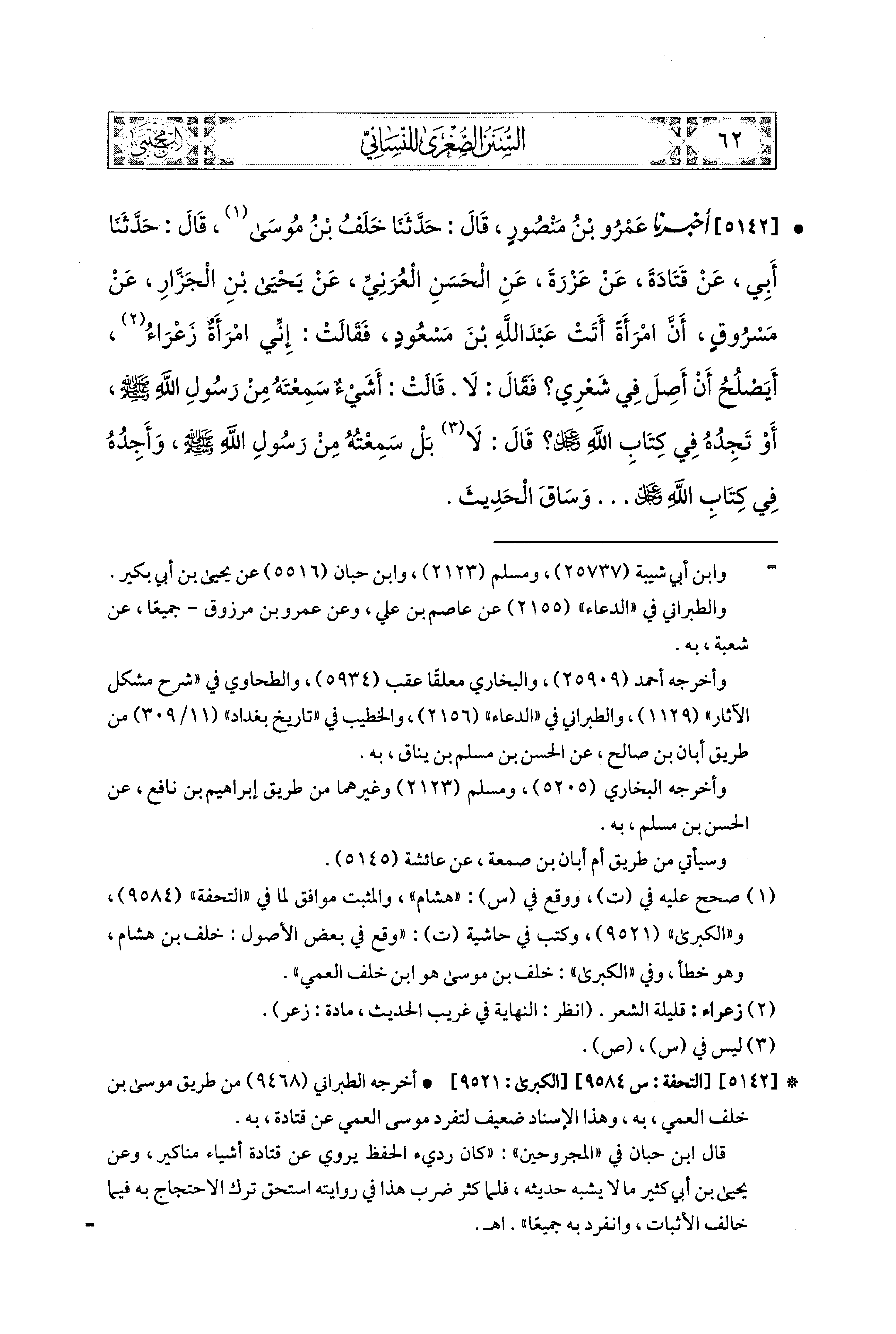 5142 - أَخبَرَنا عَمْرُو بنُ مَنْصُورٍ، قال: حَدَّثنا خَلَفُ بنُ مُوسَى، قال: حَدَّثنا أَبي، عَن قَتَادَةَ، عَن عَزْرَةَ، عَنِ الحَسَنِ العُرَنِيِّ، عَن يَحيَى بْنِ الجَزَّارِ، عَن مَسْرُوقٍ، أَنَّ امْرَأَةً أَتَتْ عَبدَ اللهِ بْنَ مَسْعُودٍ فَقَالَتْ: إِنِّي امْرَأَةٌ زَعْرَاءُ أَيَصْلُحُ أَنْ أَصِلَ فِي شَعْرِي؟ فَقَالَ: لاَ، قَالَتْ: أَشَيْءٌ سَمِعْتَهُ مِنْ رَسُولِ اللهِ صَلى الله عَليه وسَلم، أَوْ تَجِدُهُ فِي كِتَابِ اللهِ عز وجل؟ قَالَ: لاَ بَلْ سَمِعْتُهُ مِنْ رَسُولِ اللهِ صَلى الله عَليه وسَلم، وَأَجِدُهُ فِي كِتَابِ اللهِ عز وجل ... ، وَسَاقَ الحَدِيثَ.
