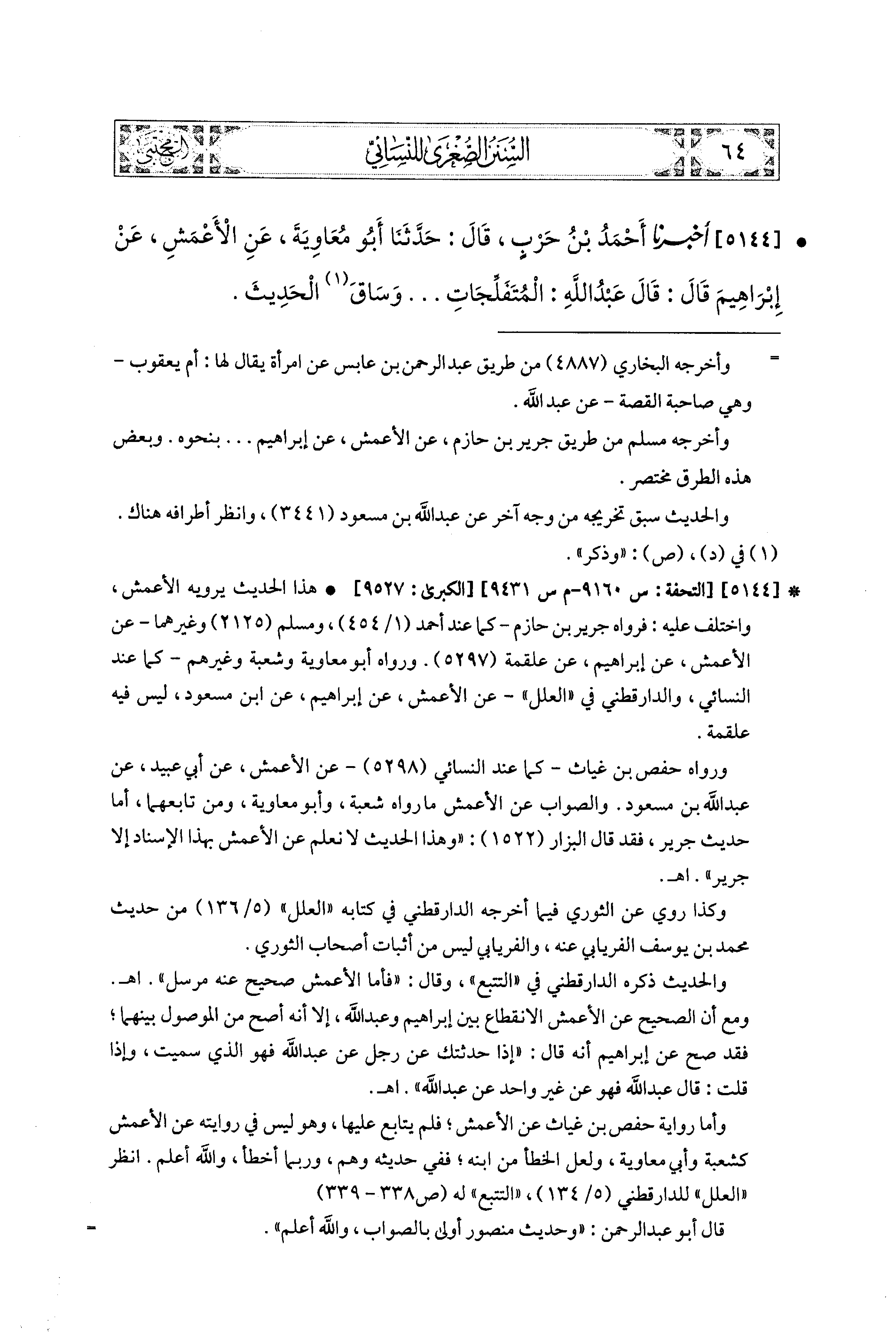 5144- أَخبَرَنا أَحْمَدُ بنُ حَرْبٍ، قال: حَدَّثنا أَبو مُعَاوِيَةَ، عَنِ الأَعْمَشِ، عَن إِبراهِيمَ قَالَ: قَالَ عَبدُ اللهِ: المُتَفَلِّجَاتِ ...، وَسَاقَ الحَدِيثَ.