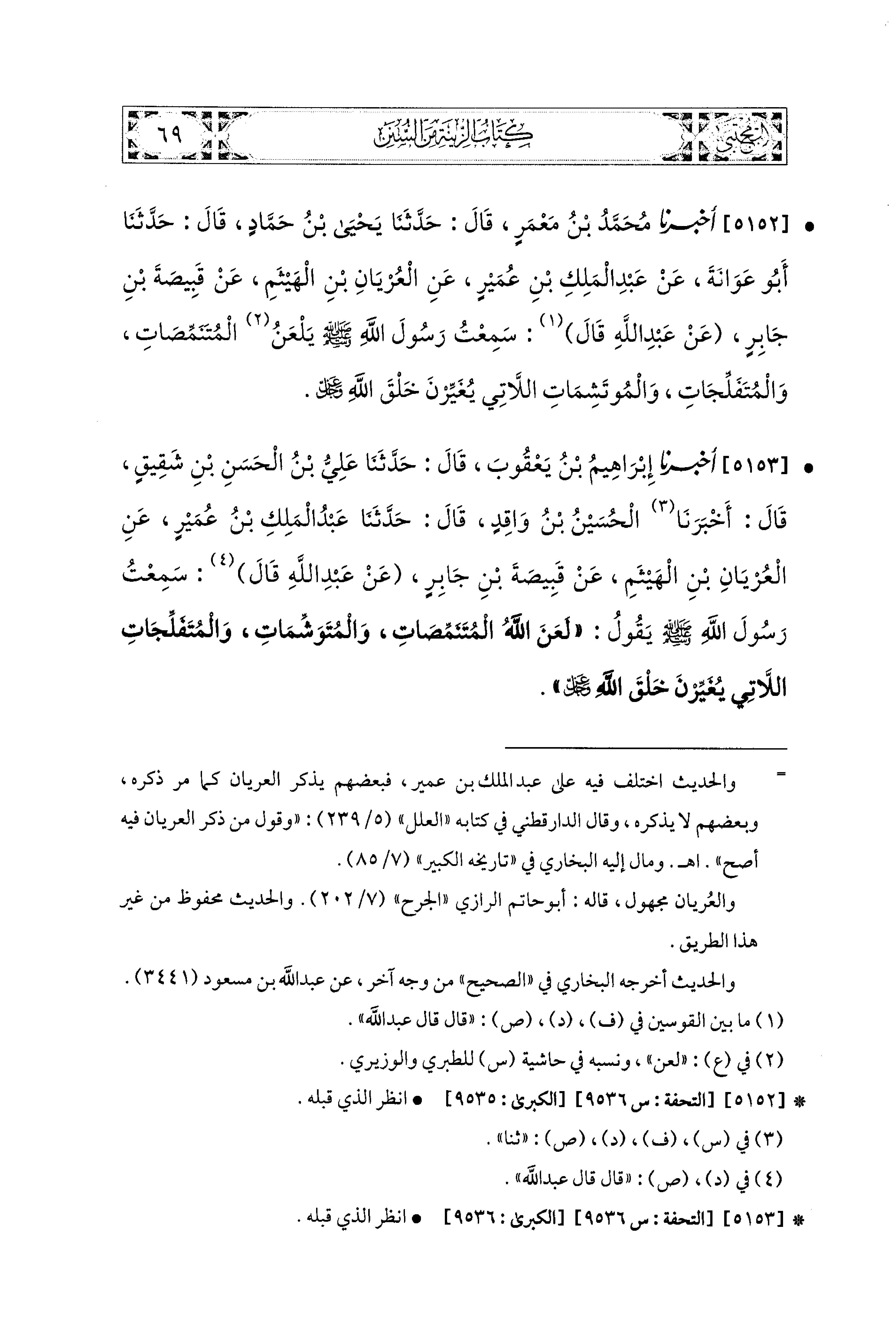 5152- أَخبَرَنا مُحَمد بنُ مَعْمَرٍ، قال: حَدَّثنا يَحيَى بنُ حَمَّادٍ، قال: حَدَّثنا أَبو عَوَانَةَ، عَن عَبدِ المَلِكِ بْنِ عُمَيْرٍ، عَنِ العُرْيَانِ بْنِ الهَيْثَمِ، عَن قَبِيصَةَ بْنِ جَابِرٍ، عَن عَبدِ اللهِ، قَالَ: سَمِعْتُ رَسُولَ اللهِ صَلى الله عَليه وسَلم يَلْعَنُ المُتَنَمِّصَاتِ، وَالمُتَفَلِّجَاتِ، وَالمُوتَشِمَاتِ اللاَّتِي يُغَيِّرْنَ خَلْقَ اللهِ عَزَّ وَجَلَّ.