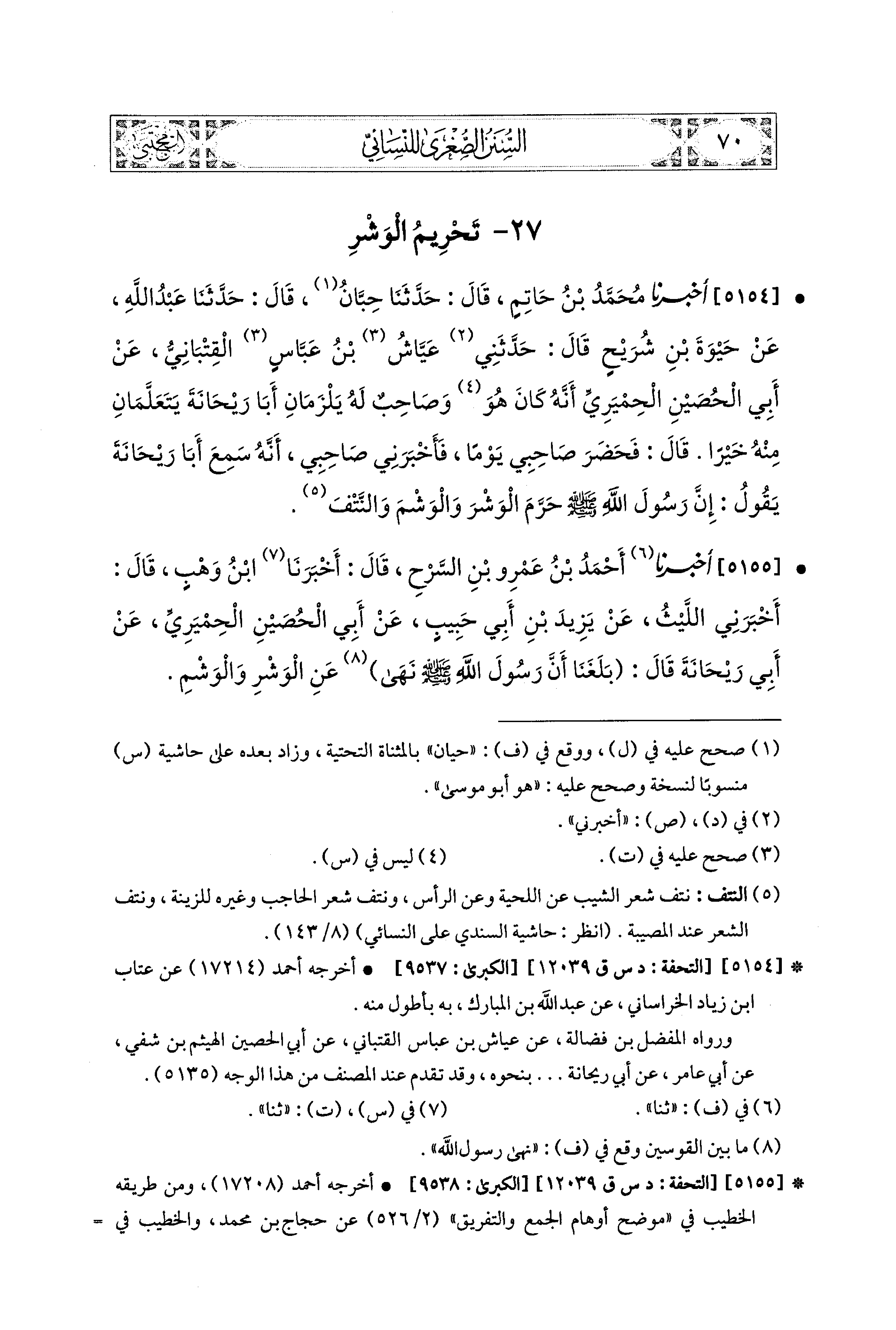 5155- أَخبَرَنا أَحْمَدُ بنُ عَمْرِو بْنِ السَّرْحِ، قال: أخبرنا ابنُ وَهْبٍ، قَالَ: أَخْبَرَنِي اللَّيْثُ، عَن يَزِيدَ بْنِ أَبي حَبِيبٍ، عَن أَبي الحُصَيْنِ الحَجْرِيِّ، أن أَبَا رَيْحَانَةَ قَالَ: نَهَى رَسُولُ اللهِ صَلى الله عَليه وسَلم عَنِ الوَشْرِ، وَالوَشْمِ (1).