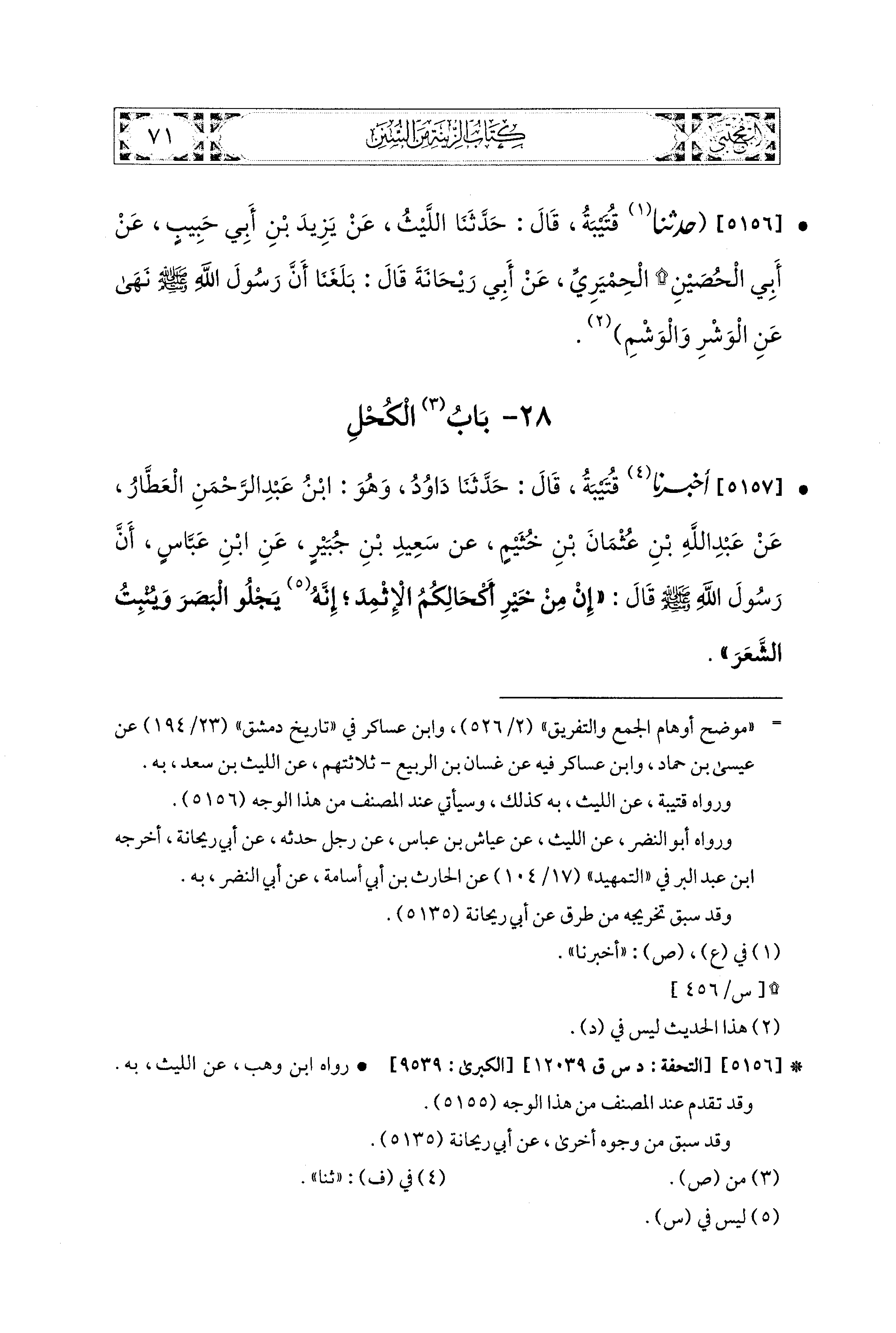 5157- أَخبَرَنا قُتَيبَةُ، قال: حَدَّثنا دَاوُدُ، وَهُوَ ابنُ عَبدِ الرَّحْمَنِ العَطَّارِ، عَن عَبد اللهِ بن عُثْمَانَ بْنِ خُثَيْمٍ، عَن سَعيدِ بْنِ جُبَيْرٍ، عَنِ ابنِ عَبَّاسٍ، أَنَّ رَسُولَ اللهِ صَلى الله عَليه وسَلم قَالَ: إِنَّ مِنْ خَيْرِ أَكْحَالِكُمُ الإِثْمِدَ إِنَّهُ يَجْلُو البَصَرَ، وَيُنْبِتُ الشَّعَرَ.