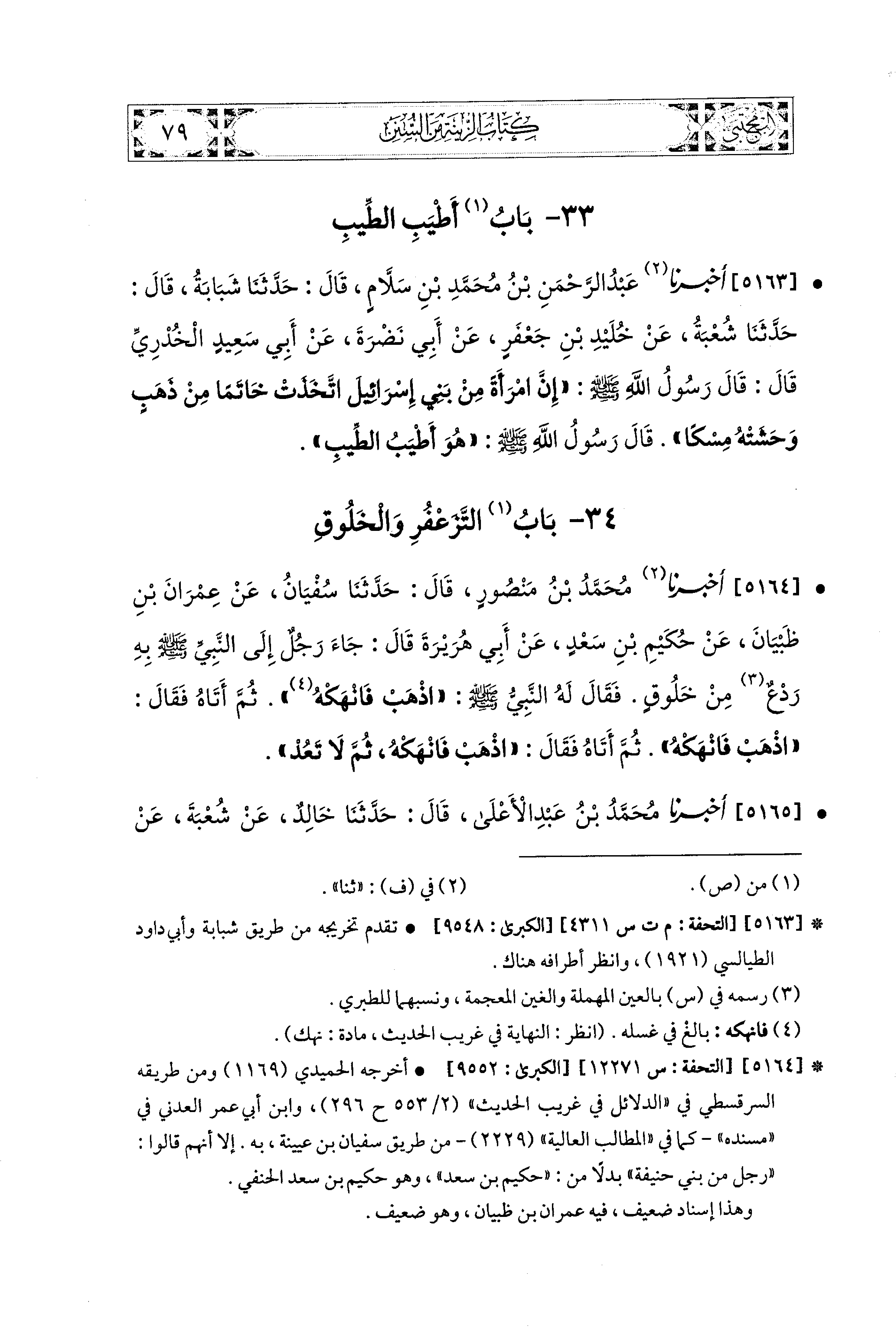 5164- أَخبَرَنا مُحَمد بنُ مَنْصُورٍ، قال: حَدَّثنا سُفيَانُ، عَن عِمْرَانَ بْنِ ظَبْيَانَ، عَن حُكَيْمِ بْنِ سَعْدٍ، عَن أَبي هُرَيْرَةَ قَالَ: جَاءَ رَجُلٌ إِلَى النَّبيِّ صَلى الله عَليه وسَلم بِهِ رَدْعٌ مِنْ خَلُوقٍ، فَقَالَ لَهُ النَّبيُّ صَلى الله عَليه وسَلم: اذْهَبْ فَانْهَكْهُ، ثُمَّ أَتَاهُ، فَقَالَ: اذْهَبْ فَانْهَكْهُ، ثُمَّ أَتَاهُ، فَقَالَ: اذْهَبْ فَانْهَكْهُ، ثُمَّ لاَ تَعُدْ.