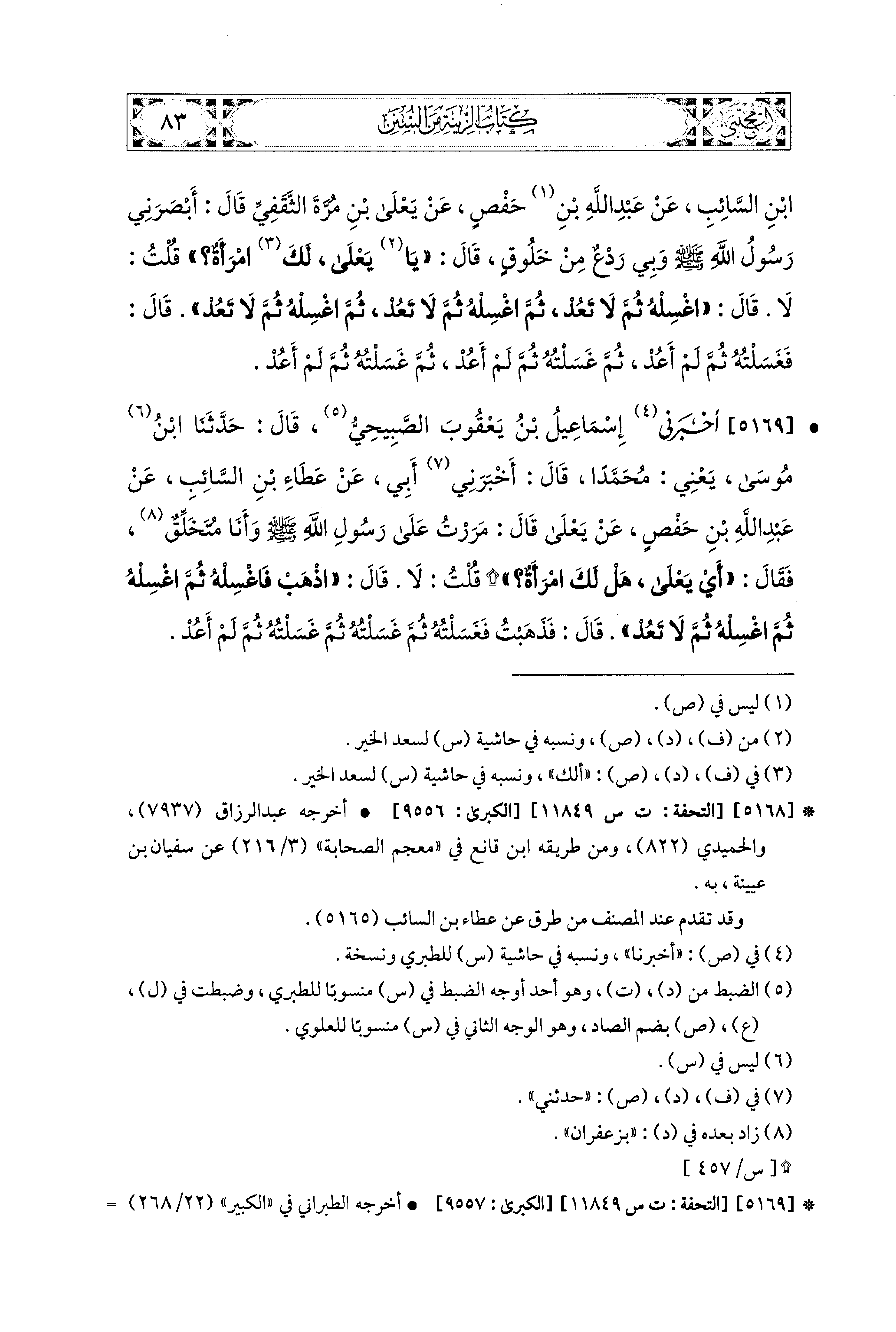 5169- أَخبَرَنا إِسماعِيلُ بنُ يَعقُوبَ الصَّبِيحِيُّ، قال: حَدَّثنا ابنُ مُوسَى، يَعْنِي مُحَمدًا، قَالَ: أَخْبَرَنِي أَبي، عَن عَطَاءِ بْنِ السَّائِبِ، عَن عَبد اللهِ بن حَفْصٍ، عَن يَعْلَى قَالَ: مَرَرْتُ عَلَى رَسُولِ اللهِ صَلى الله عَليه وسَلم، وَأَنَا مُتَخَلِّقٌ فَقَالَ: أَيْ يَعْلَى، هَلْ لَكَ امْرَأَةٌ؟ قُلْتُ: لاَ، قَالَ: اذْهَبْ فَاغْسِلْهُ، ثُمَّ اغْسِلْهُ، ثُمَّ اغْسِلْهُ، ثُمَّ لاَ تَعُدْ، قَالَ: فَذَهَبْتُ فَغَسَلْتُهُ، ثُمَّ غَسَلْتُهُ، ثُمَّ غَسَلْتُهُ، ثُمَّ لَمْ أَعُدْ.