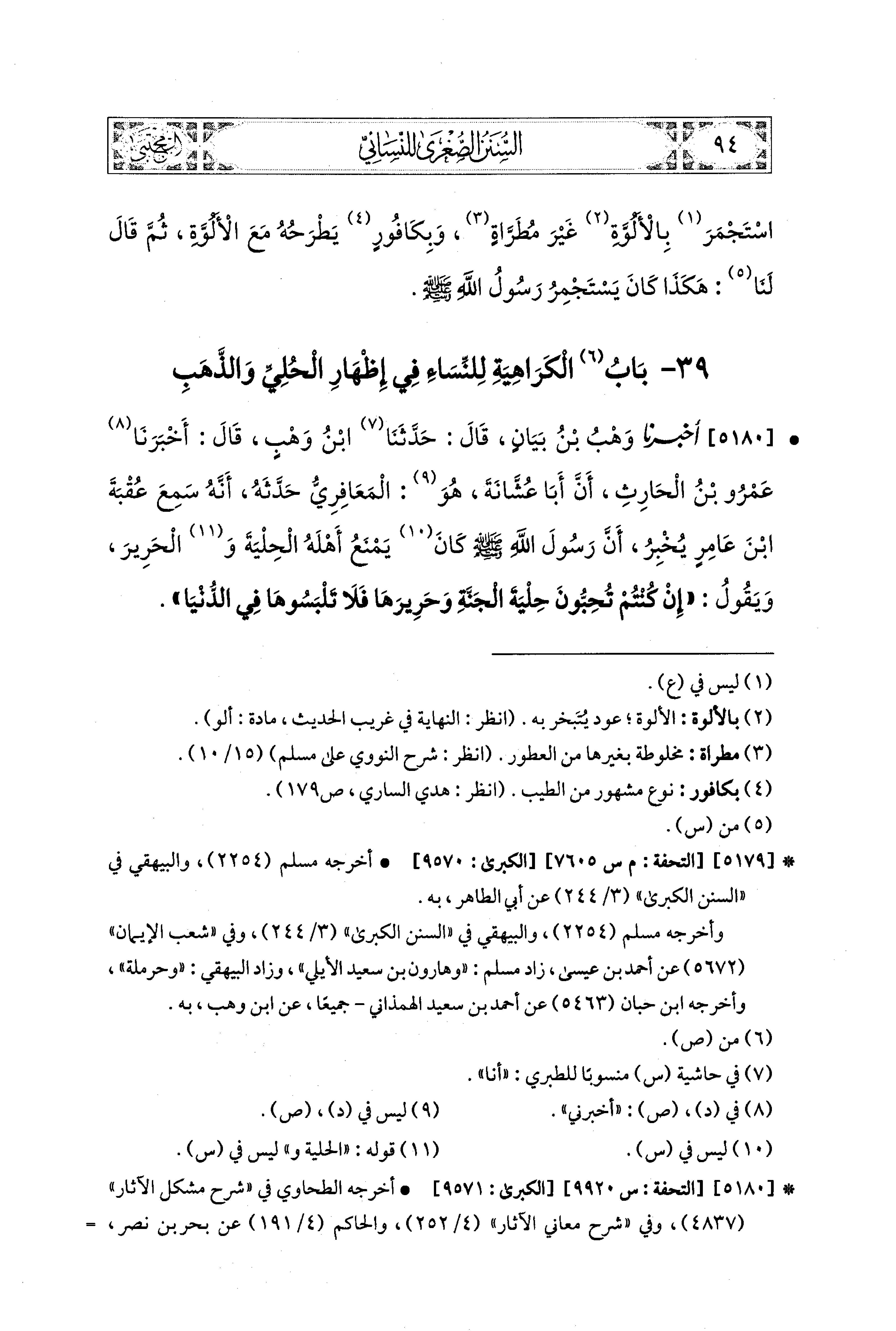 5180- أَخبَرَنا وَهْبُ بنُ بَيَانٍ، قال: حَدَّثنا ابنُ وَهْبٍ، قَالَ: أَخبرنا عَمْرُو بنُ الحَارِثِ، أَنَّ أَبَا عُشَّانَةَ، هُوَ المَعَافِرِيُّ حَدَّثَهُ، أَنَّهُ سَمِعَ عُقْبَةَ بْنَ عَامِرٍ يُخْبِرُ، أَنَّ رَسُولَ اللهِ صَلى الله عَليه وسَلم كَانَ يَمْنَعُ أَهْلَهُ الحِلْيَةَ وَالحَرِيرَ وَيَقُولُ: إِنْ كُنْتُمْ تُحِبُّونَ حِلْيَةَ الجَنَّةِ، وَحَرِيرَهَا فَلاَ تَلْبَسُوهَا فِي الدُّنْيَا.