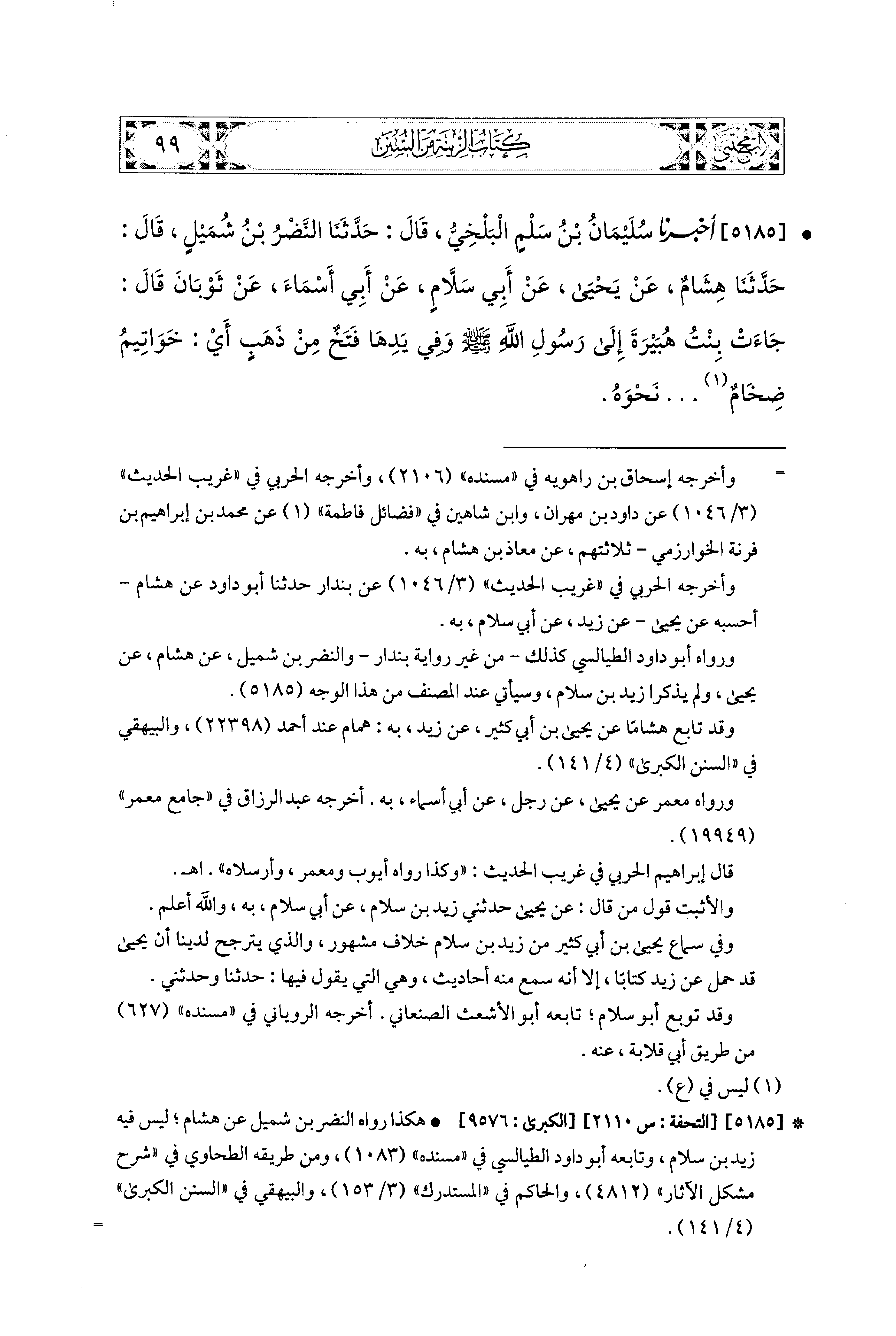 5185- أَخبَرَنا سُلَيمَانُ بنُ سَلْمٍ البَلْخِيُّ، قال: حَدَّثنا النَّضْرُ بنُ شُمَيْلٍ، قال: حَدَّثنا هِشَامٌ، عَن يَحيَى، عَن أَبي سَلاَّمٍ، عَن أَبي أَسْمَاءَ، عَن ثَوْبَانَ قَالَ: جَاءَتْ بِنْتُ هُبَيْرَةَ إِلَى رَسُولِ اللهِ صَلى الله عَليه وسَلم وَفِي يَدِهَا فَتَخٌ مِنْ ذَهَبٍ، أَيْ خَوَاتِيمَ ضِخَامٍ، نَحْوَهُ.